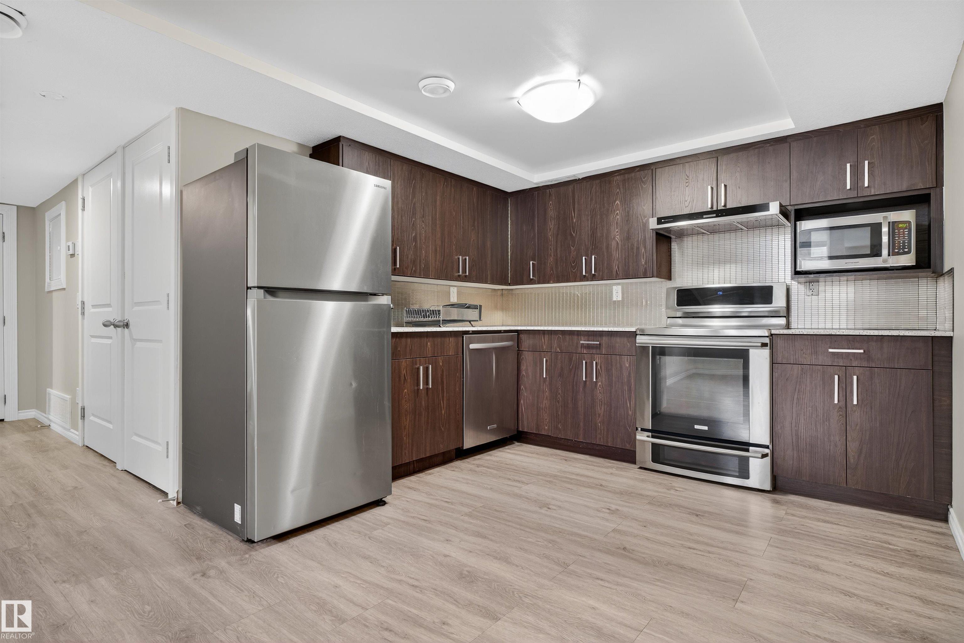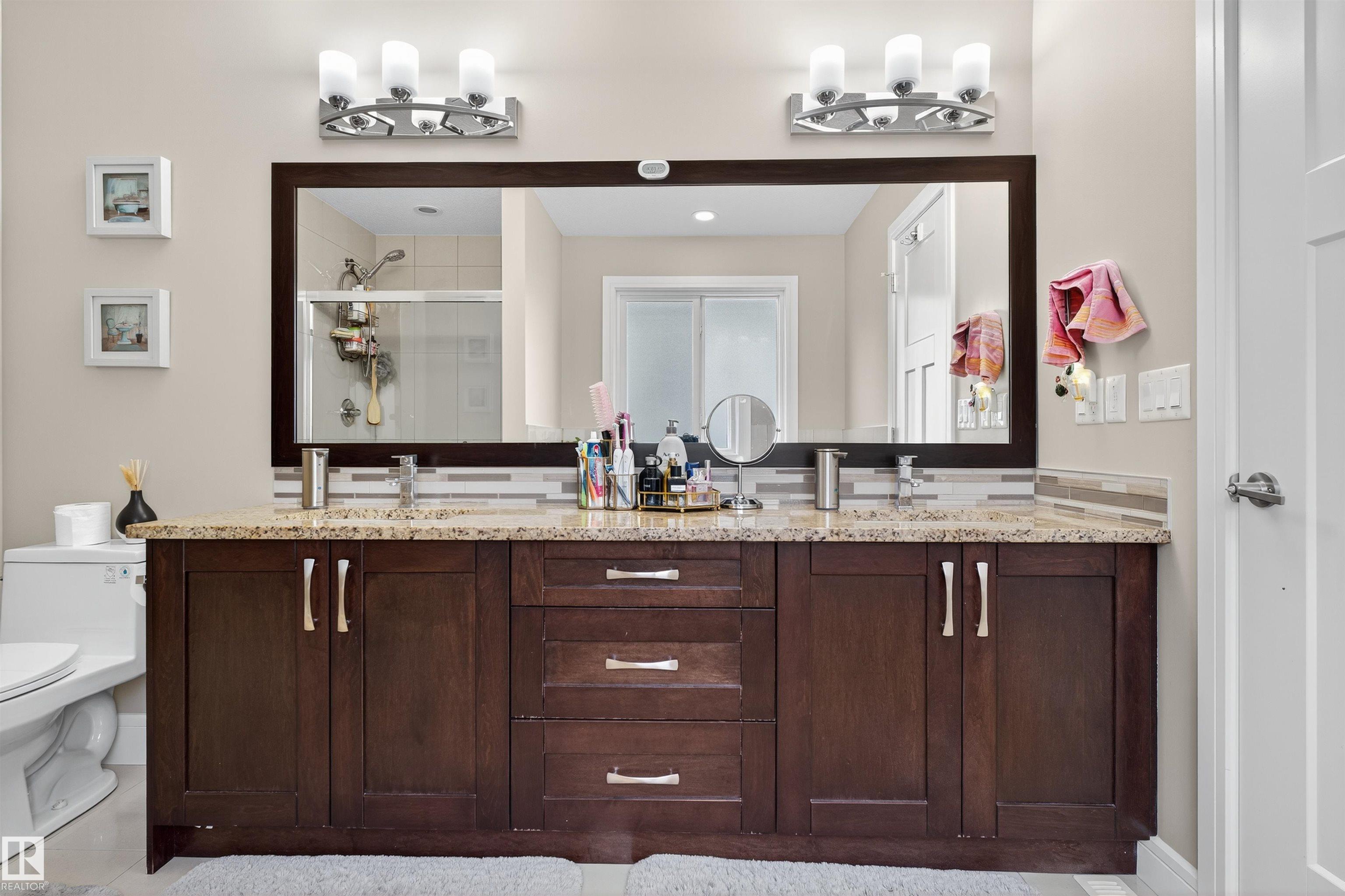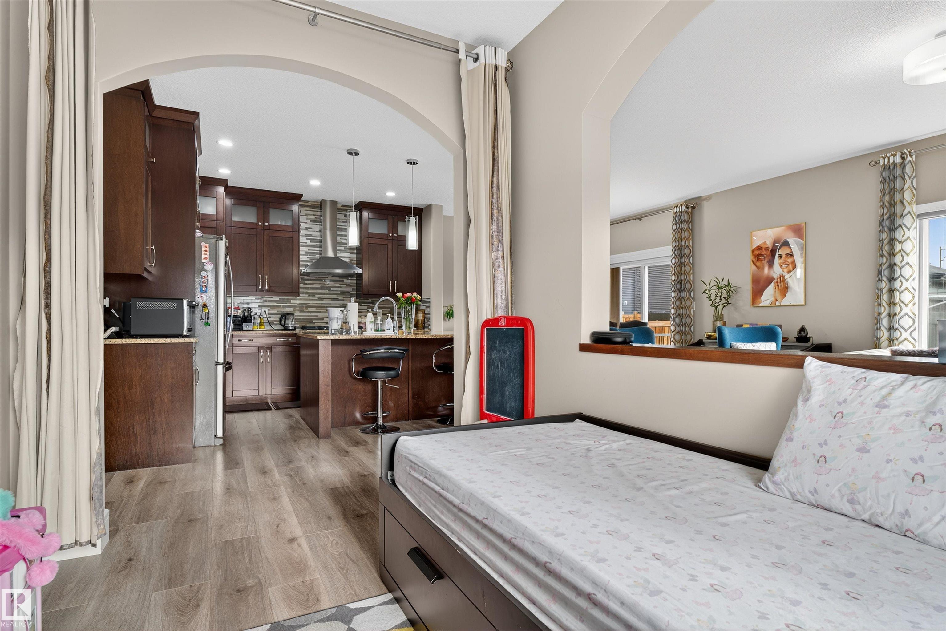 Welcome to this beautifully designed 5 bed, 3.5 bath home with a legal basement suite in the desirable Chappelle! Offering over 2,100 sq.ft. of elegant living space, this home highlights superior craftsmanship with granite countertops, rich maple cabinetry, stainless steel appliances, knockdown ceilings, ceramic tile, and stylish baseboards. The open-concept main floor features a chef's kitchen with soft-close drawers, glass uppers to the ceiling, walk-through pantry, 5-burner gas cooktop, built-in oven, and a large island overlooking the cozy family room with a sleek gas fireplace. A main-floor den adds space for work or study. Upstairs includes a bonus room, laundry, 3 bedrooms which includes a luxurious primary suite with double sinks, soaker tub, tiled shower, and walk-in closet. The fully finished basement has 2bedroom legal suite. Close to parks, schools, shopping & Edmonton International Airport!