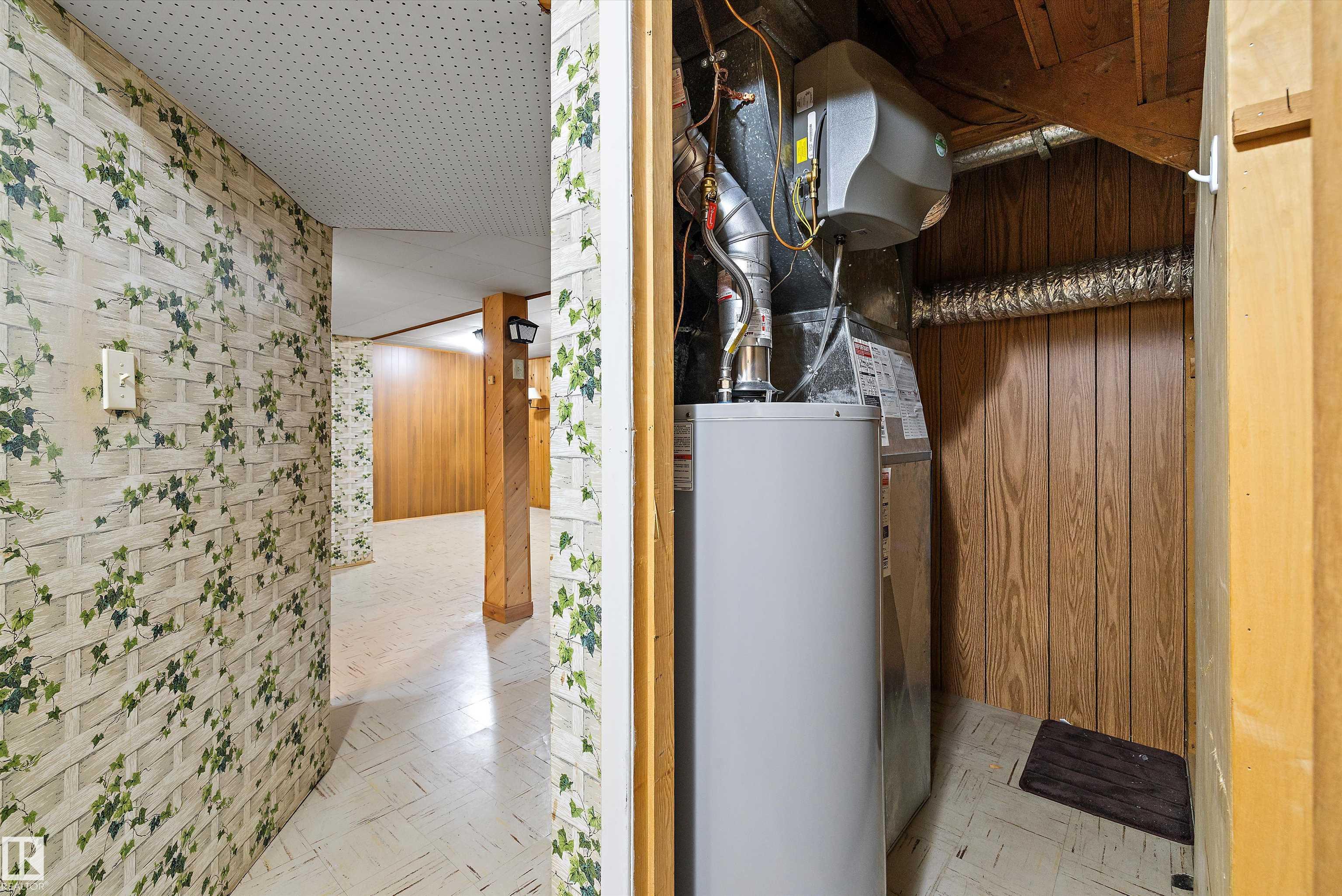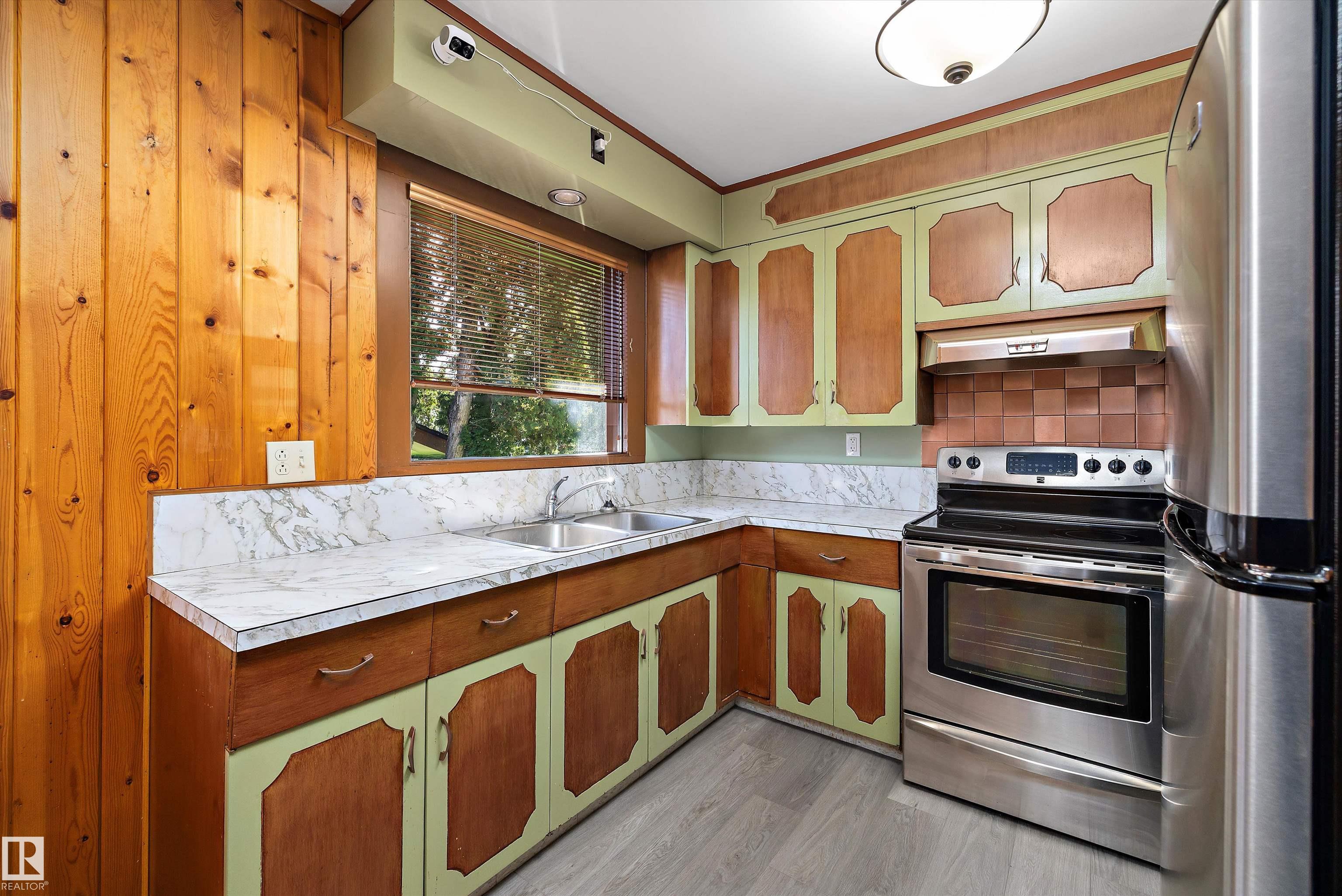 Welcome to this mid century home in the desirable community of Crestwood. This property has nearly 2500 sf of finished living space with charming classic finishes throughout including real wood doors, original hardwood in the living and diningroom, vintage light fixtures, original wall panels and stone surround fireplace. The fireplace has been upgraded to gas to take in the original ambience without the hassle & cost of wood. Other upgrades include vinyl floor in kitchen, new carpets in bedrooms, shingles. 3 bedrooms up and 2 bedrooms down this home is perfect or a large family or would make a great future basement suite with its separate side entry. Located on a lot that is steps to Candy Cane lane, has many trees and is fenced with an oversized detached garage with built in hobby room! Don't miss this unique opportunity! *Virtually staged*