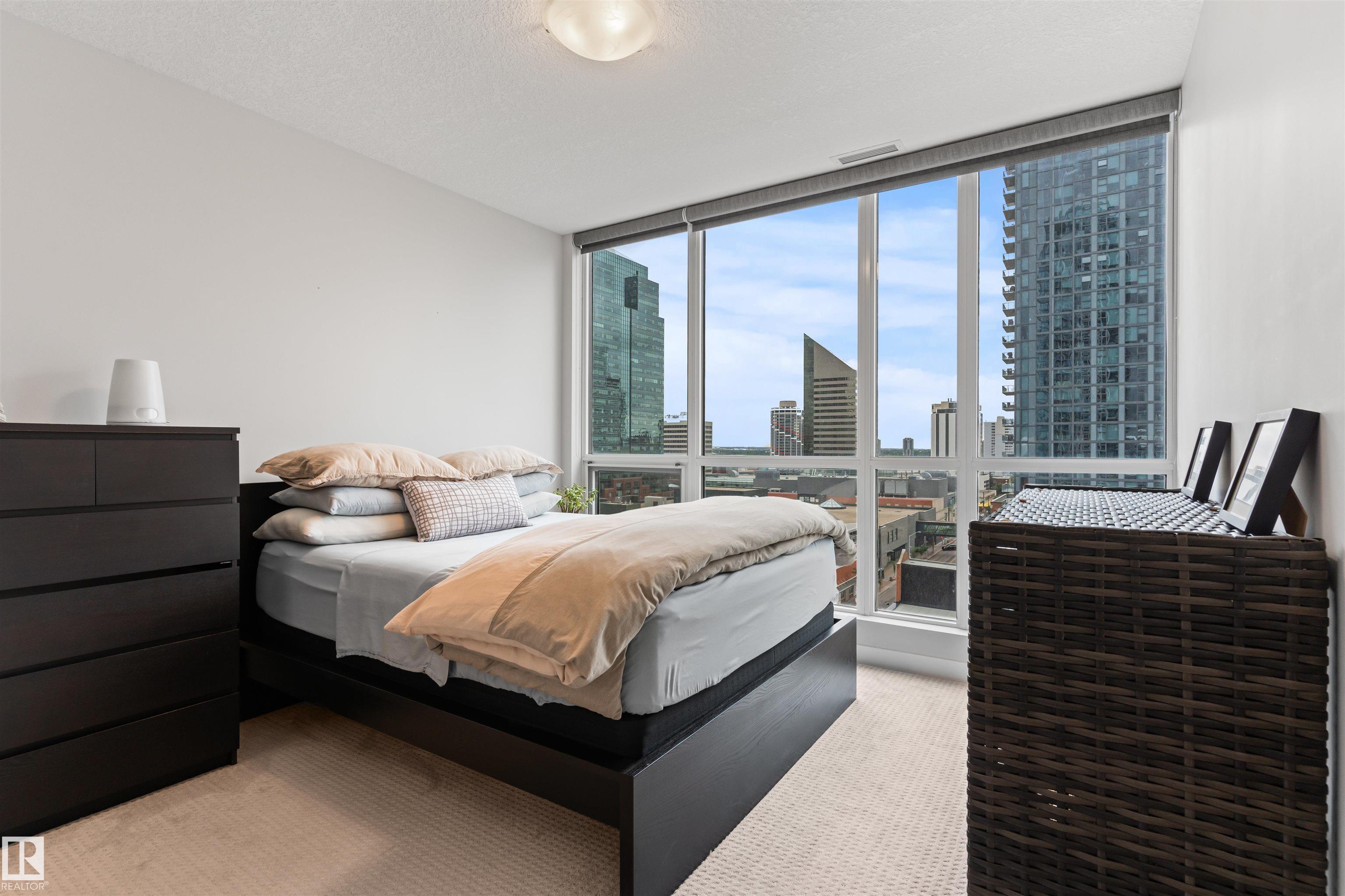 Pristine corner unit with a stunning bright view apartment, boasting large, sunlit windows. This 2 bedroom, 2.5 bathroom gem features southwest exposure, abundant natural light, and floor-to-ceiling windows. The modern finishes and spacious layout just shy of 1000 sq. ft. offer comfort and style. Enjoy a large balcony, underground heated parking with a storage cage, all in an unbeatable downtown location. The two primary bedrooms each have ensuite bathrooms, plus there's an extra half bath, perfect for entertaining--an uncommon feature at this price! The expansive kitchen includes mocha brown cabinets, stainless steel appliances, granite countertops, and a large island with seating. In-suite laundry, luxurious wood flooring in main areas, upgraded tile in the 2.5 baths, and plush carpeting in the bedrooms enhance the living experience. Ultima Tower provides excellent amenities like a gym, showers, hot tub, BBQs, a party lounge, three elevators, and 24/7 security/concierge.