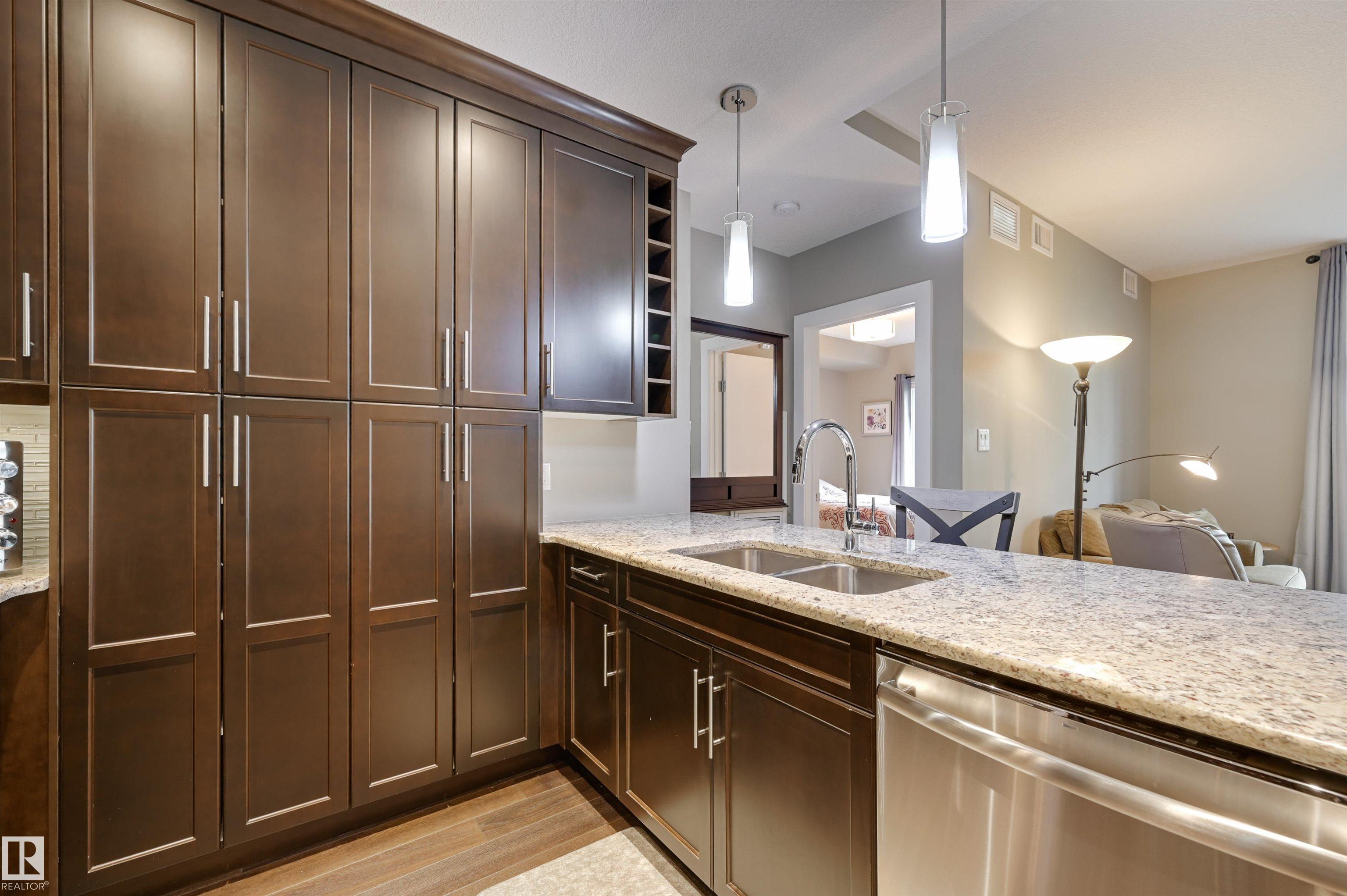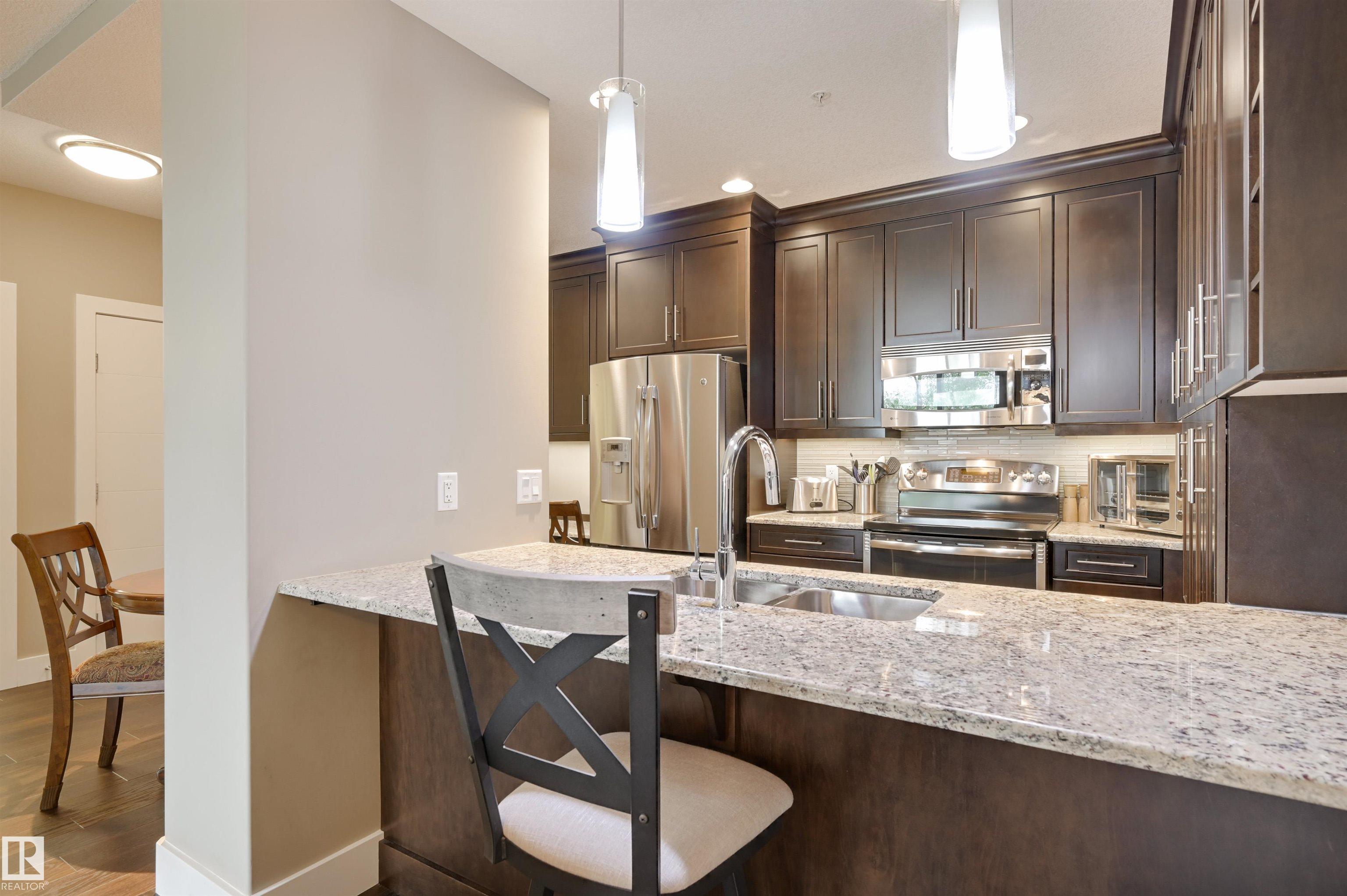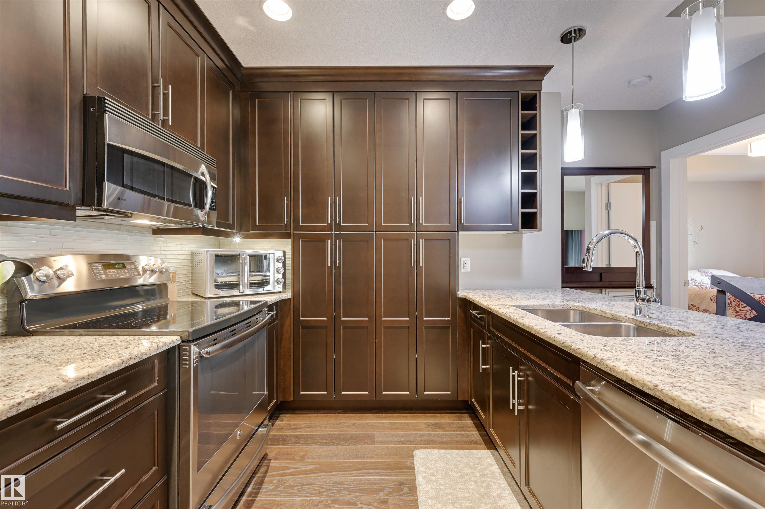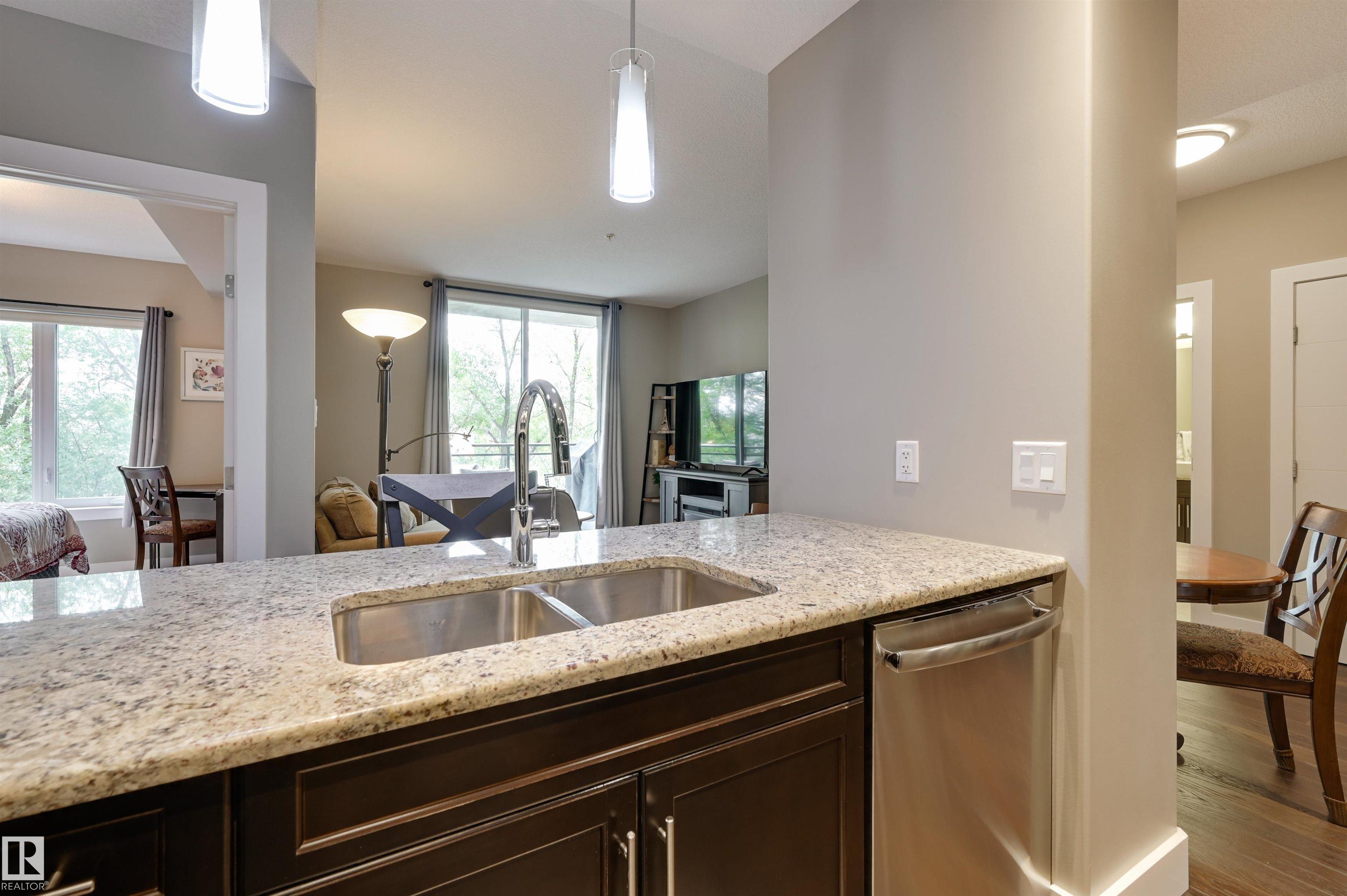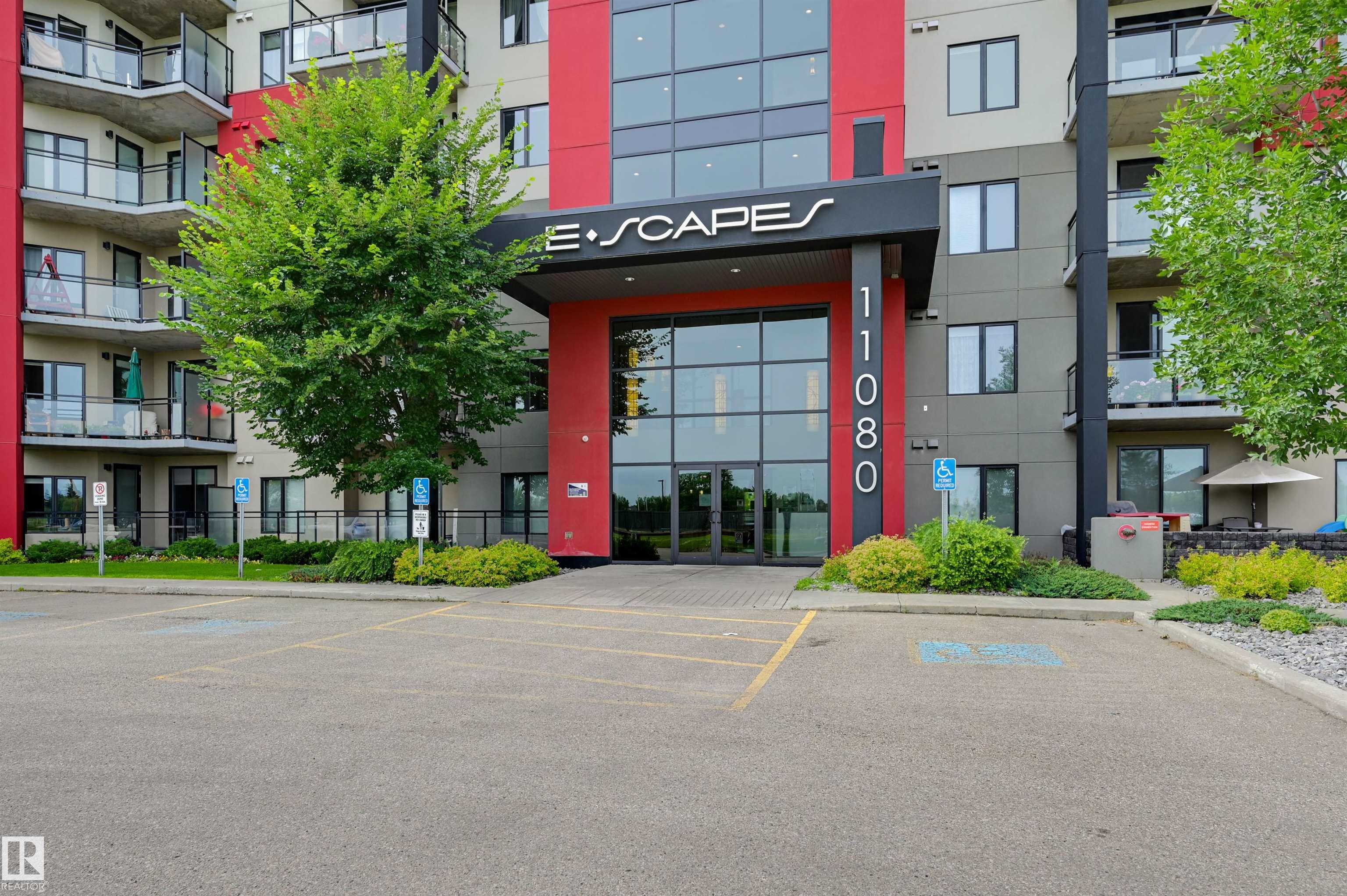 LIKE NEW! Stylish 2 Bed, 2 Bath Condo in the E'SCAPES Building. Welcome to upscale living in one of South Edmonton's most sought-after concrete buildings. This meticulously maintained 2nd-floor unit features a modern open-concept layout with engineered hardwood flooring, granite countertops, full-height cabinetry, high ceilings, & in-suite laundry. The kitchen includes a peninsula with bar seating, S/S appliances, & tons of cabinetry. The spacious primary bedroom offers a walk-through closet & a private 4-piece ensuite, while the second bedroom is ideally situated next to a full bathroom--great for guests or a home office. Enjoy natural light through the large patio doors leading to a balcony surrounded by trees for added privacy. TWO titled heated underground parking stalls--one conveniently located close to the elevator! Enjoy premium amenities: a fully equipped fitness centre, social lounge with pool table & TWO rooftop patios. Unbeatable location-- shopping, dining, parks, trails, & quick to Henday.