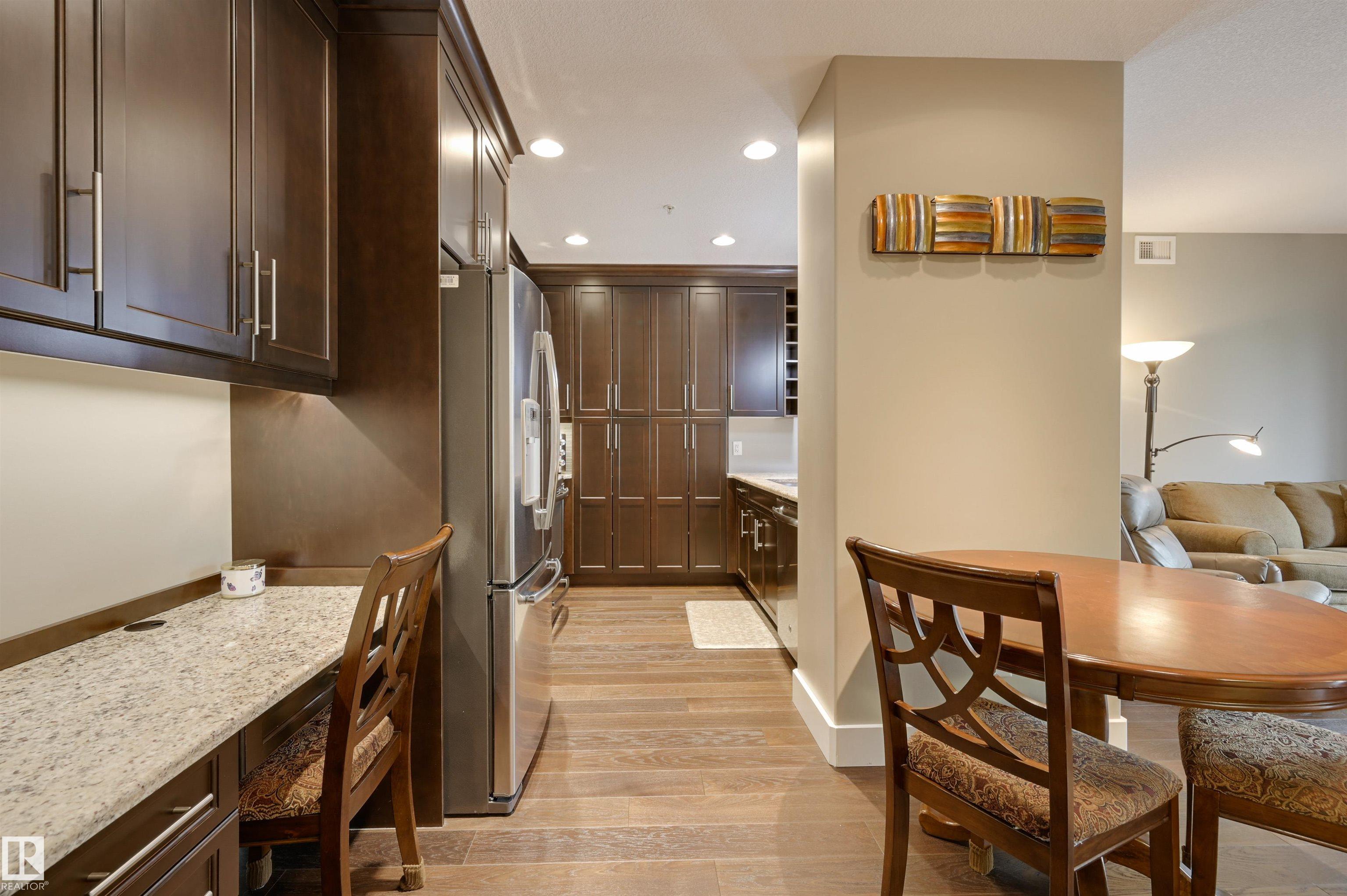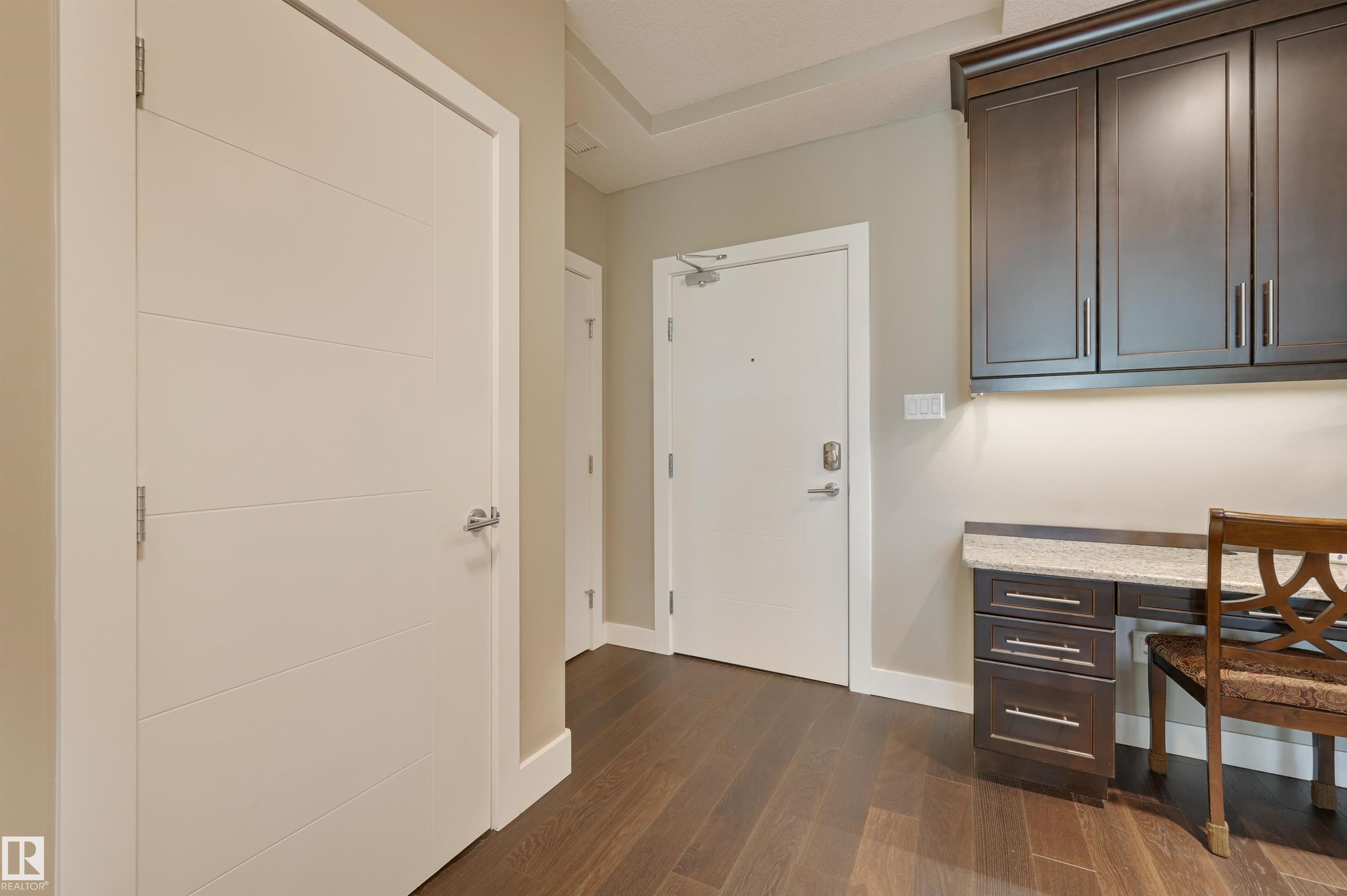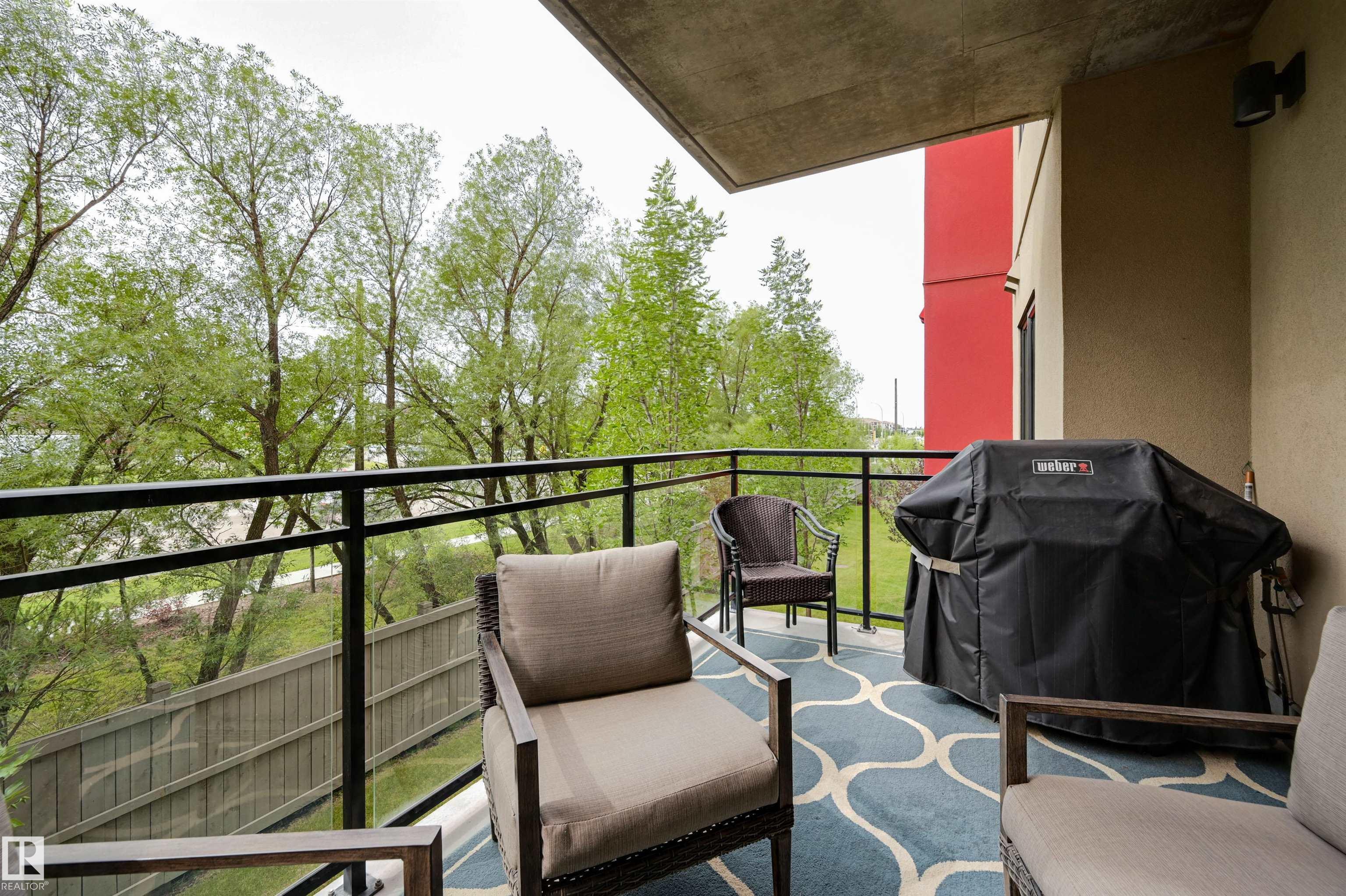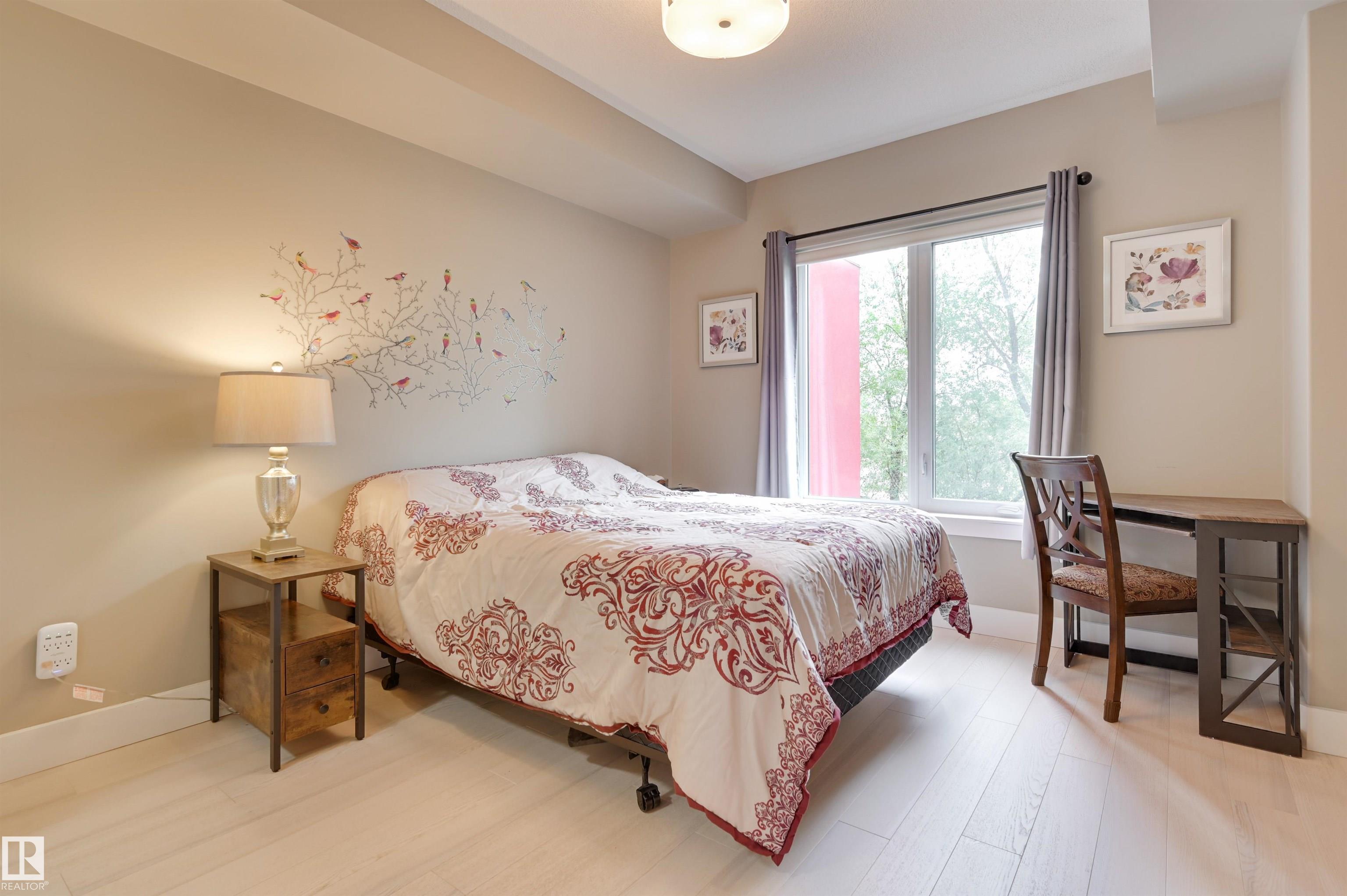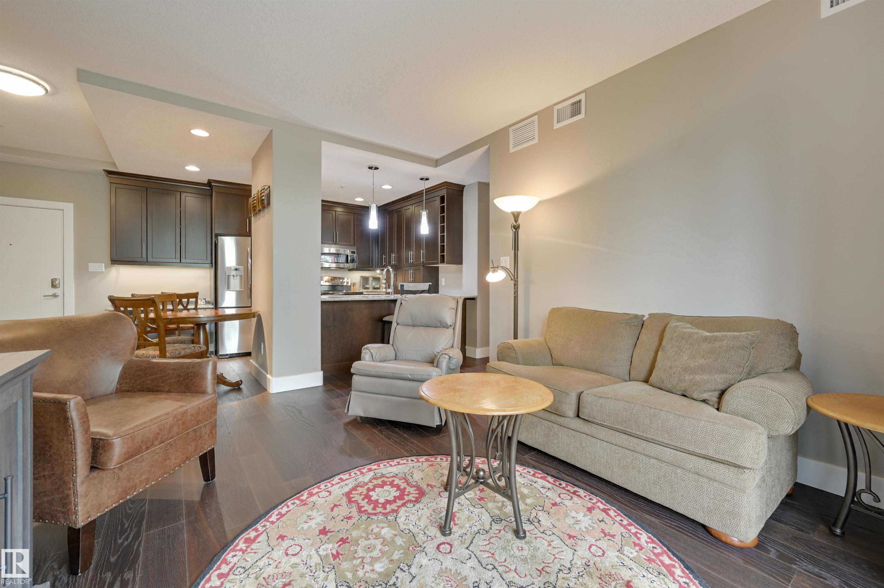LIKE NEW! Stylish 2 Bed, 2 Bath Condo in the E'SCAPES Building. Welcome to upscale living in one of South Edmonton's most sought-after concrete buildings. This meticulously maintained 2nd-floor unit features a modern open-concept layout with engineered hardwood flooring, granite countertops, full-height cabinetry, high ceilings, & in-suite laundry. The kitchen includes a peninsula with bar seating, S/S appliances, & tons of cabinetry. The spacious primary bedroom offers a walk-through closet & a private 4-piece ensuite, while the second bedroom is ideally situated next to a full bathroom--great for guests or a home office. Enjoy natural light through the large patio doors leading to a balcony surrounded by trees for added privacy. TWO titled heated underground parking stalls--one conveniently located close to the elevator! Enjoy premium amenities: a fully equipped fitness centre, social lounge with pool table & TWO rooftop patios. Unbeatable location-- shopping, dining, parks, trails, & quick to Henday.