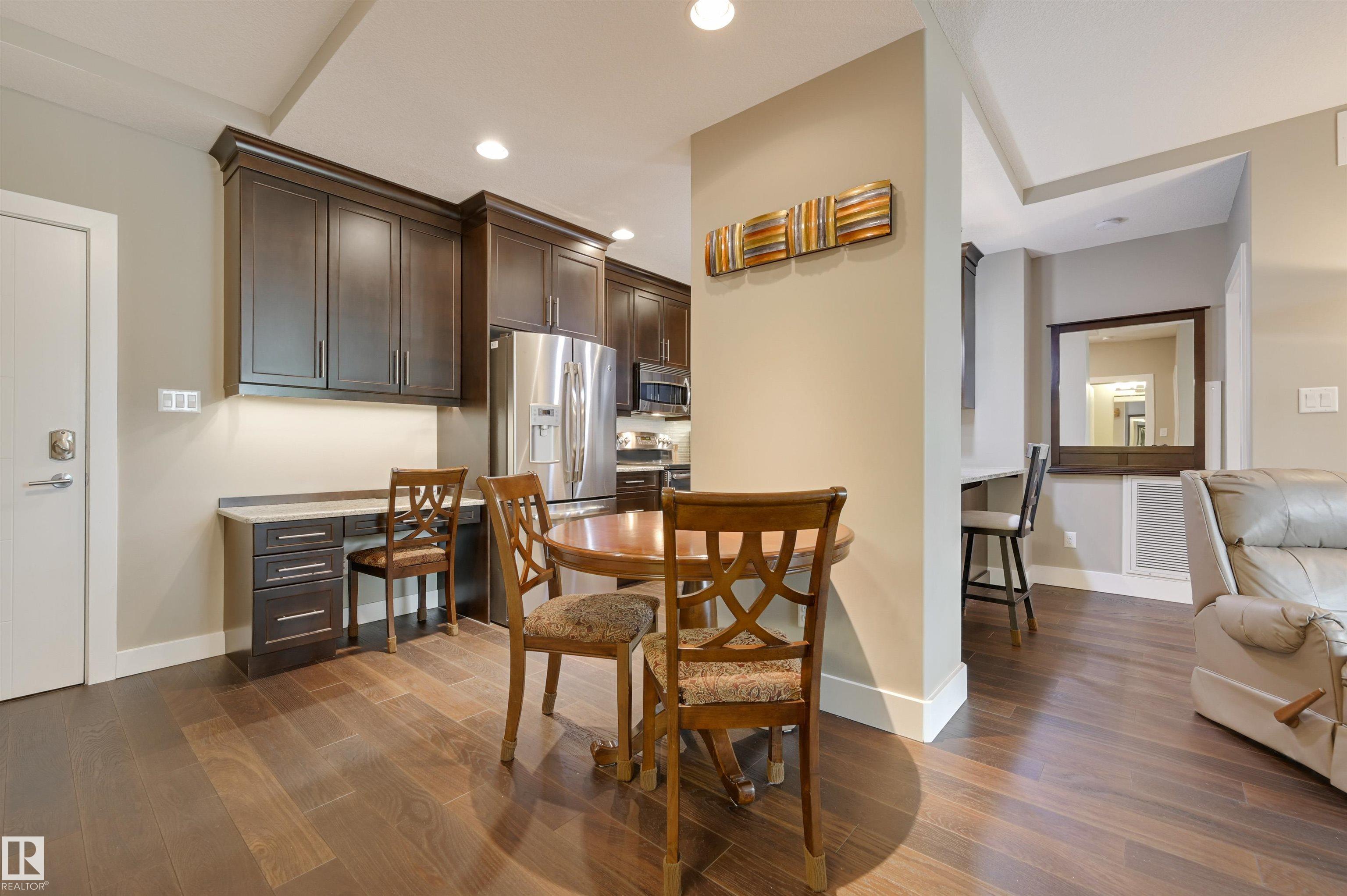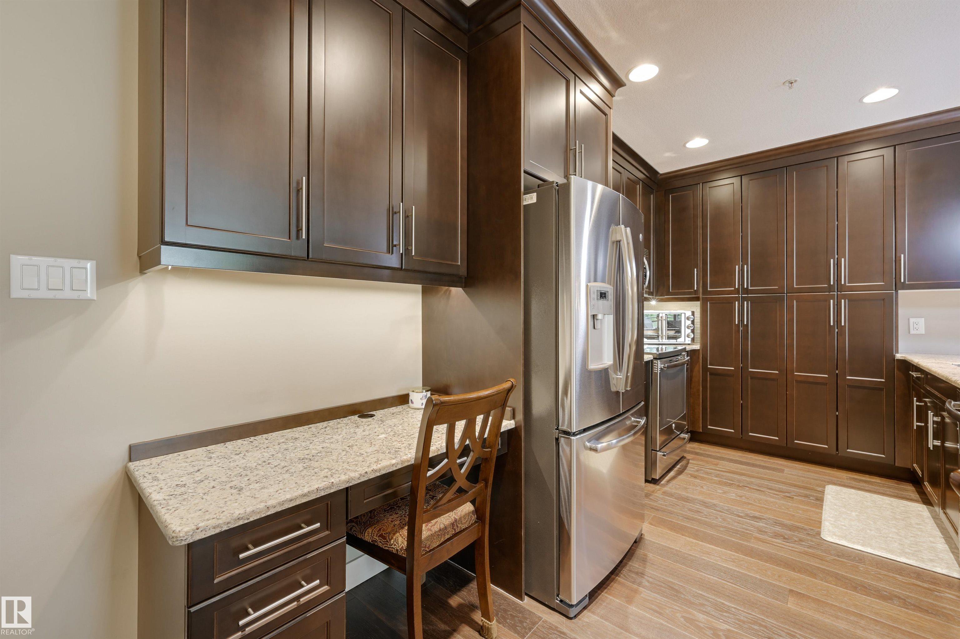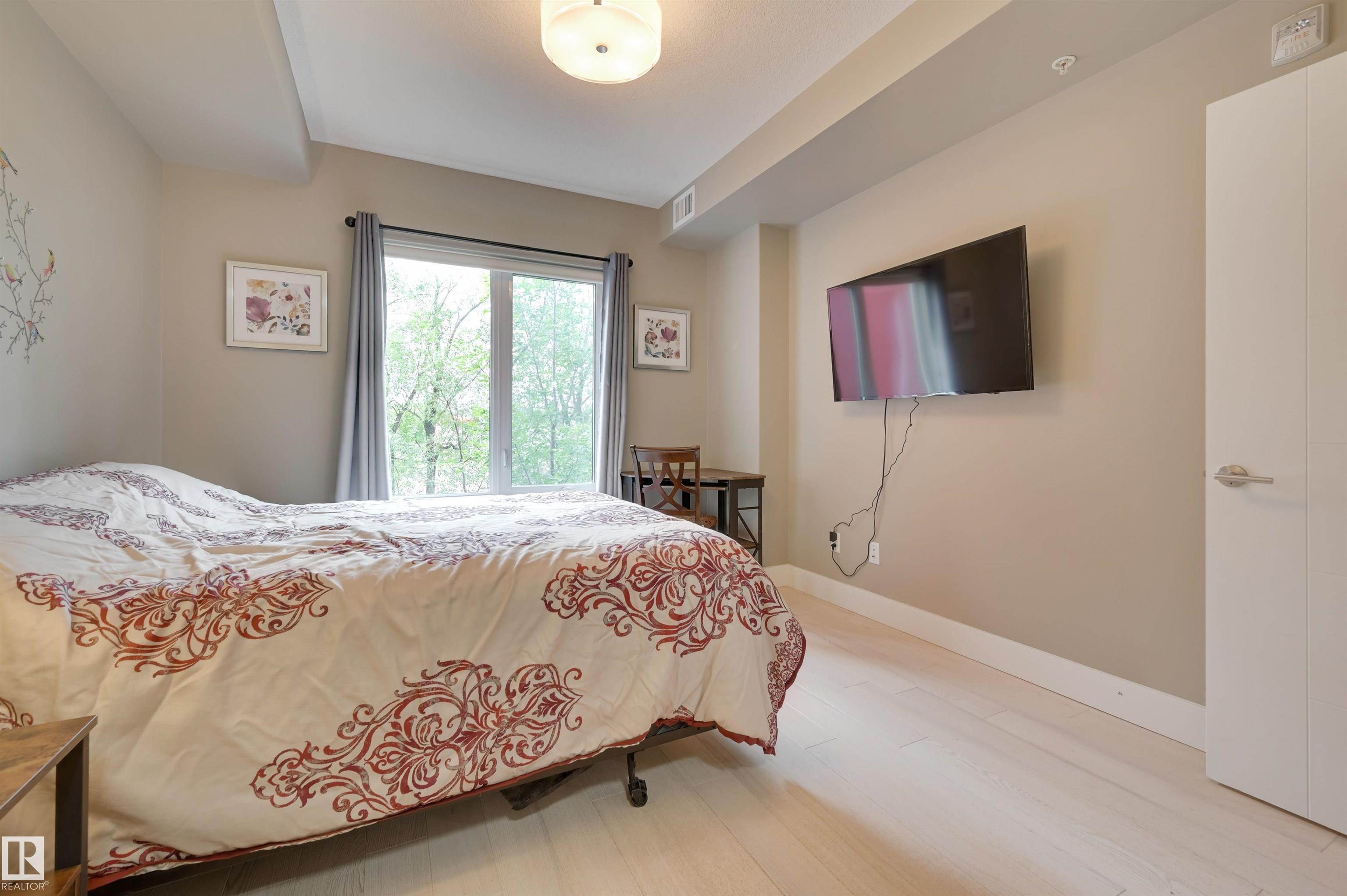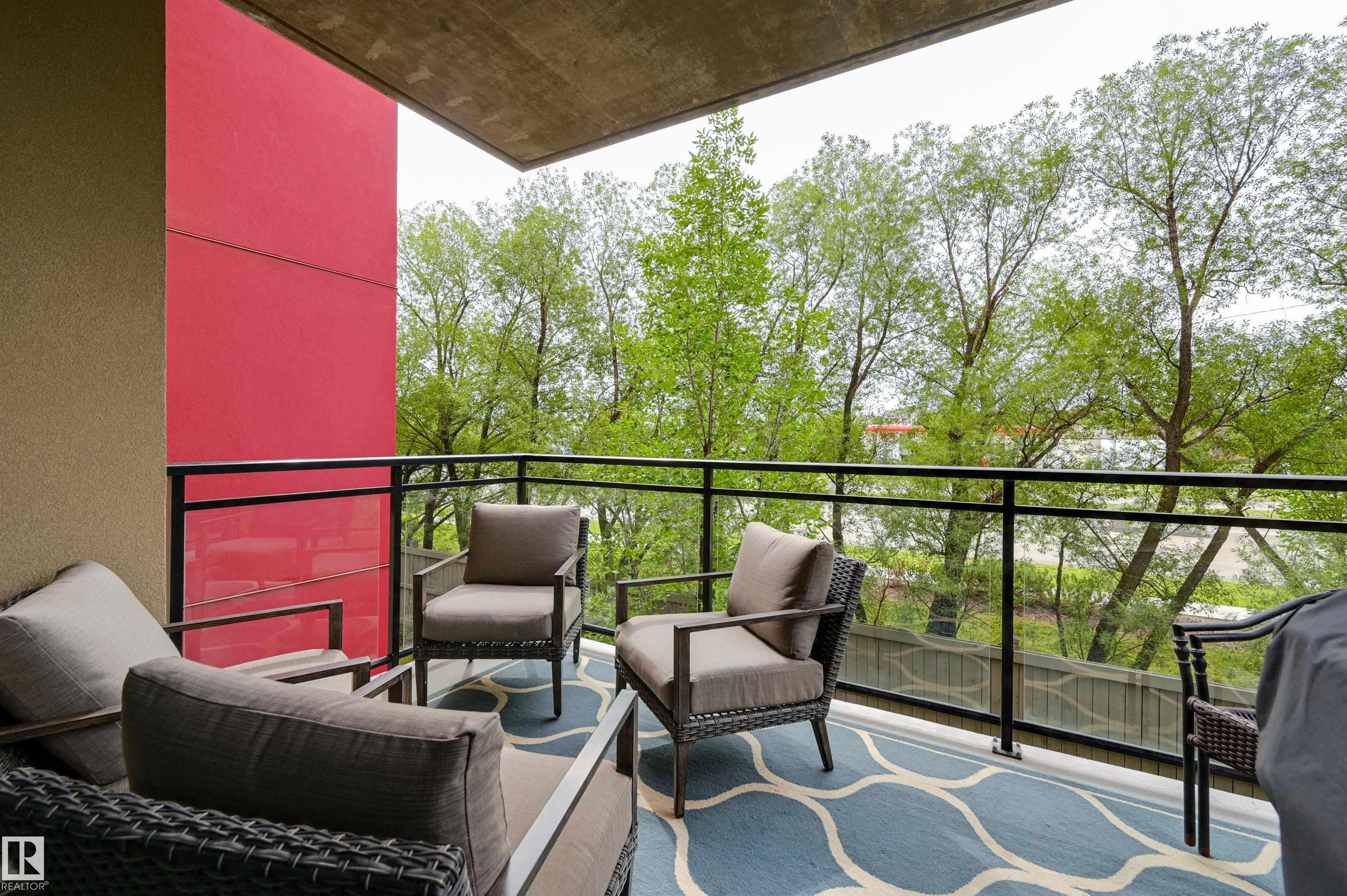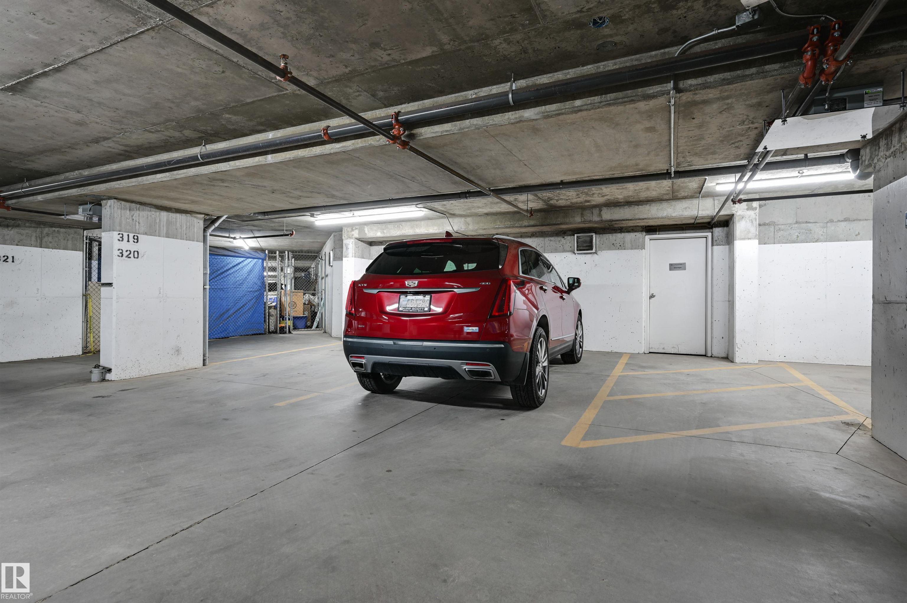LIKE NEW! Stylish 2 Bed, 2 Bath Condo in the E'SCAPES Building. Welcome to upscale living in one of South Edmonton's most sought-after concrete buildings. This meticulously maintained 2nd-floor unit features a modern open-concept layout with engineered hardwood flooring, granite countertops, full-height cabinetry, high ceilings, & in-suite laundry. The kitchen includes a peninsula with bar seating, S/S appliances, & tons of cabinetry. The spacious primary bedroom offers a walk-through closet & a private 4-piece ensuite, while the second bedroom is ideally situated next to a full bathroom--great for guests or a home office. Enjoy natural light through the large patio doors leading to a balcony surrounded by trees for added privacy. TWO titled heated underground parking stalls--one conveniently located close to the elevator! Enjoy premium amenities: a fully equipped fitness centre, social lounge with pool table & TWO rooftop patios. Unbeatable location-- shopping, dining, parks, trails, & quick to Henday.
