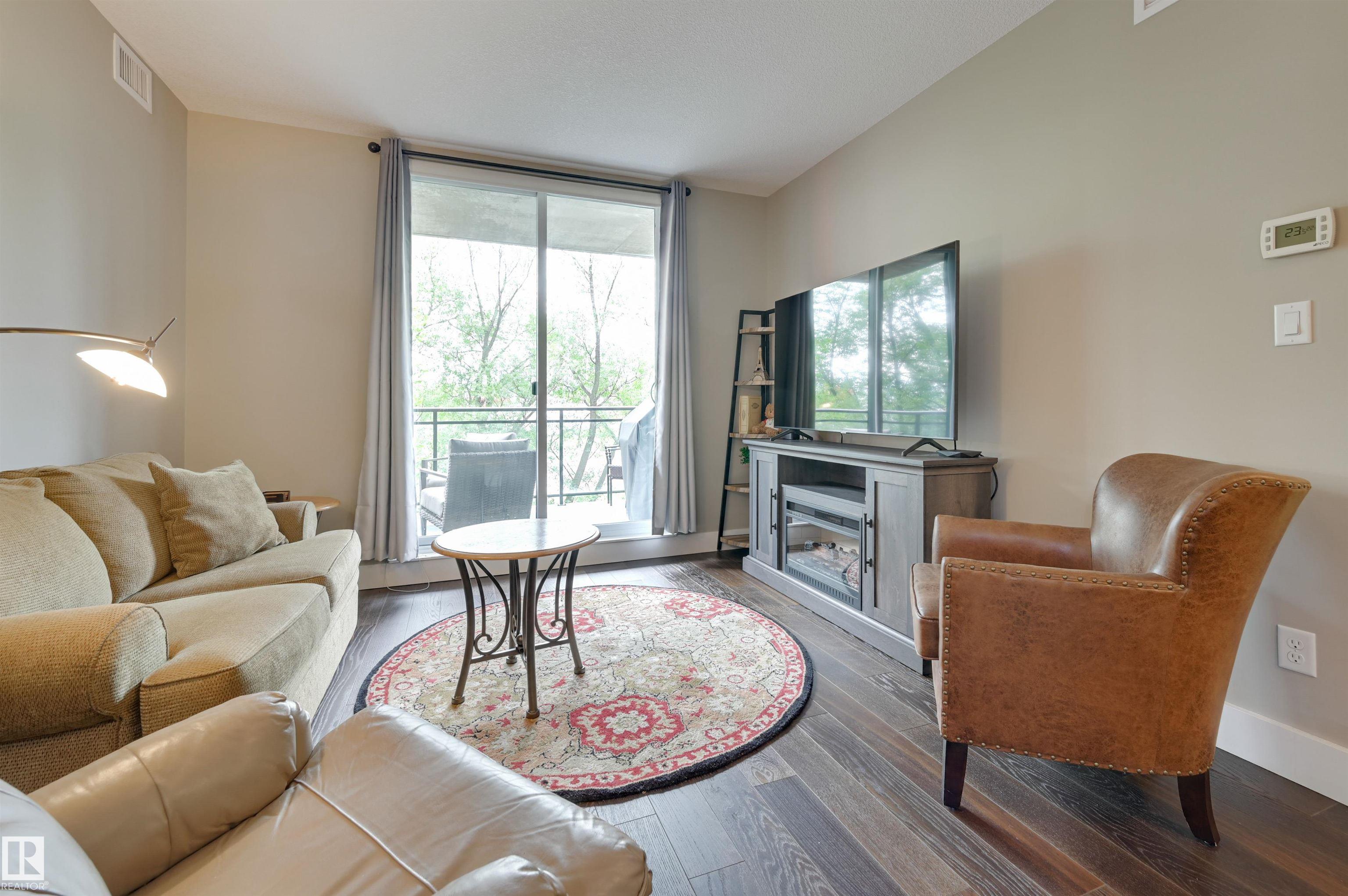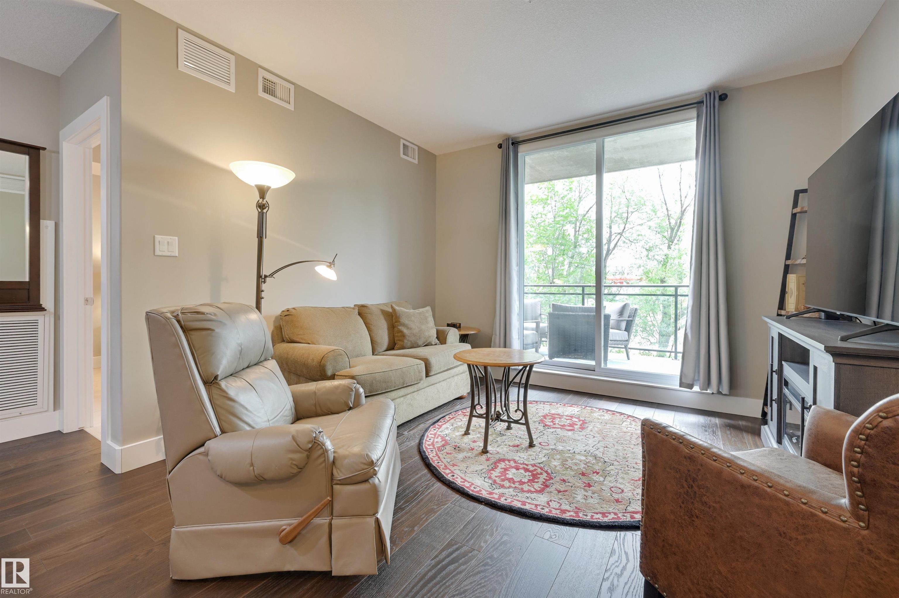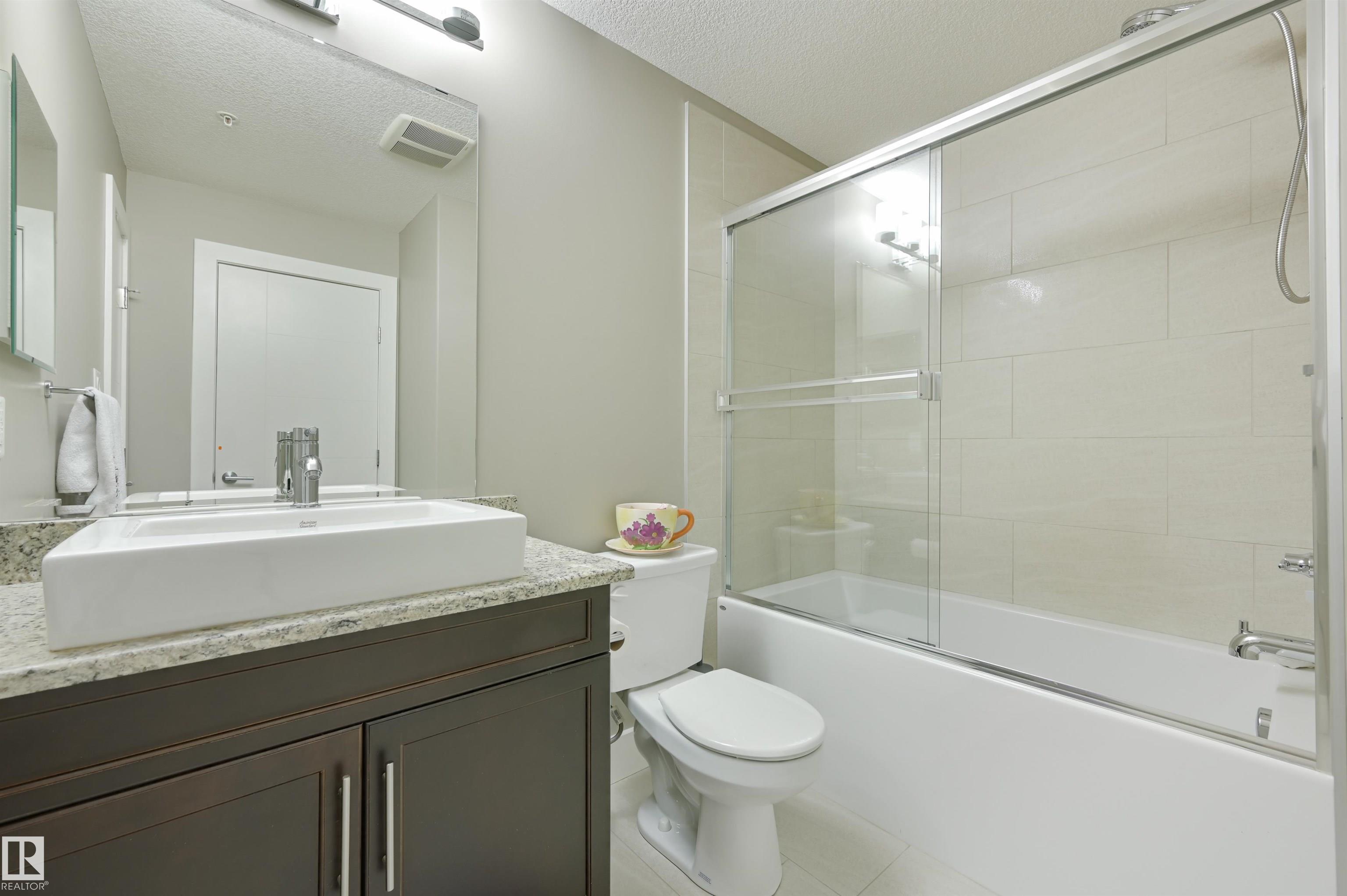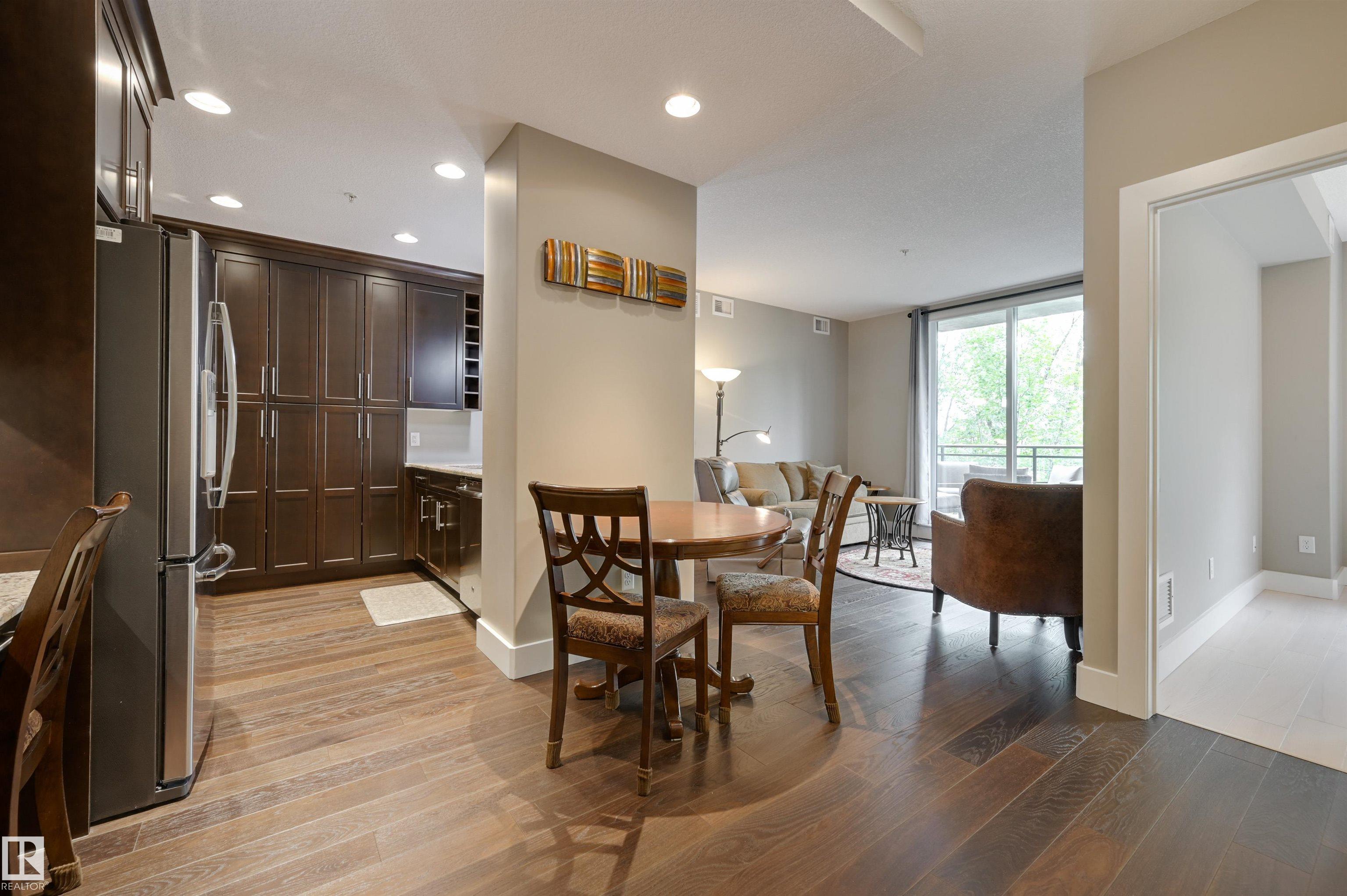 LIKE NEW! Stylish 2 Bed, 2 Bath Condo in the E'SCAPES Building. Welcome to upscale living in one of South Edmonton's most sought-after concrete buildings. This meticulously maintained 2nd-floor unit features a modern open-concept layout with engineered hardwood flooring, granite countertops, full-height cabinetry, high ceilings, & in-suite laundry. The kitchen includes a peninsula with bar seating, S/S appliances, & tons of cabinetry. The spacious primary bedroom offers a walk-through closet & a private 4-piece ensuite, while the second bedroom is ideally situated next to a full bathroom--great for guests or a home office. Enjoy natural light through the large patio doors leading to a balcony surrounded by trees for added privacy. TWO titled heated underground parking stalls--one conveniently located close to the elevator! Enjoy premium amenities: a fully equipped fitness centre, social lounge with pool table & TWO rooftop patios. Unbeatable location-- shopping, dining, parks, trails, & quick to Henday.