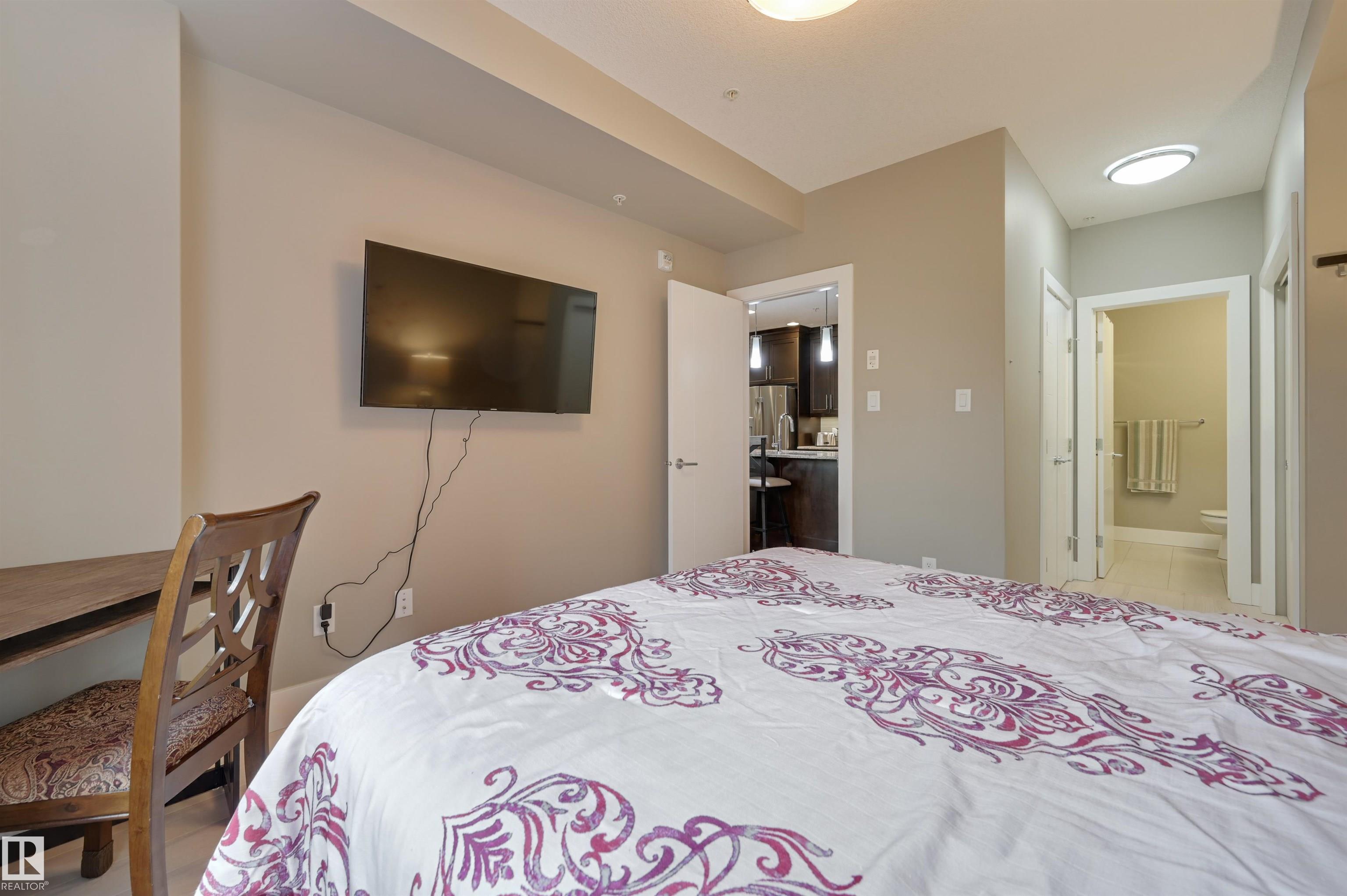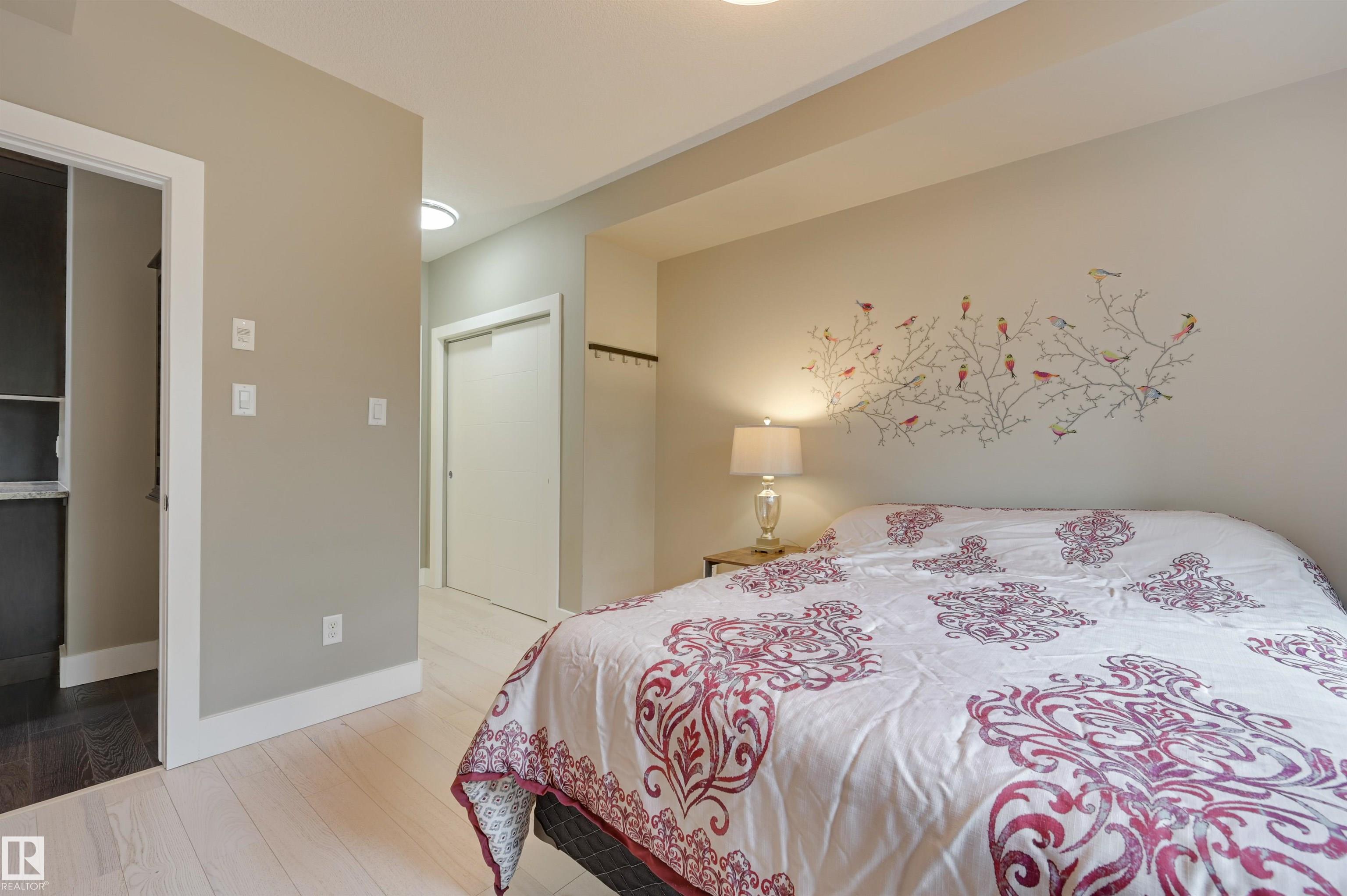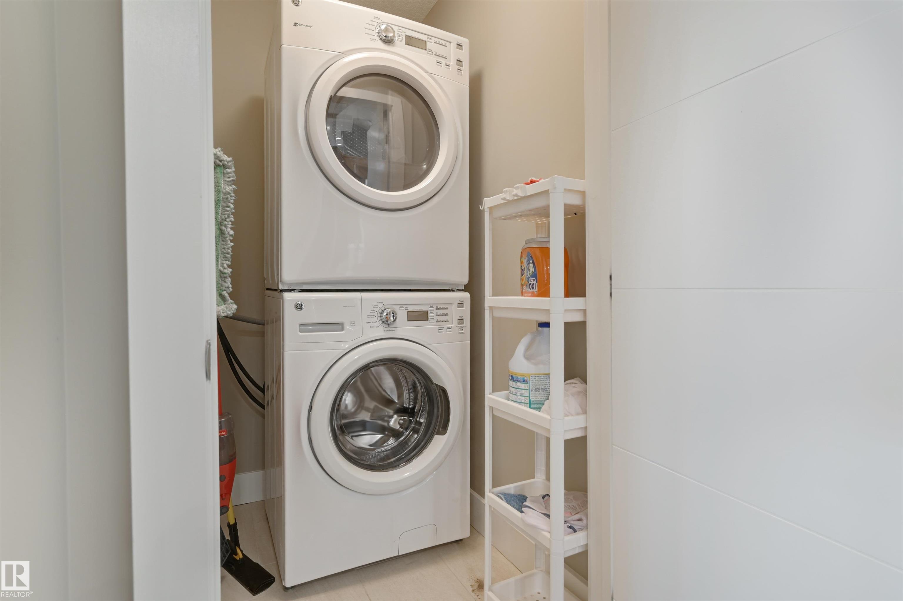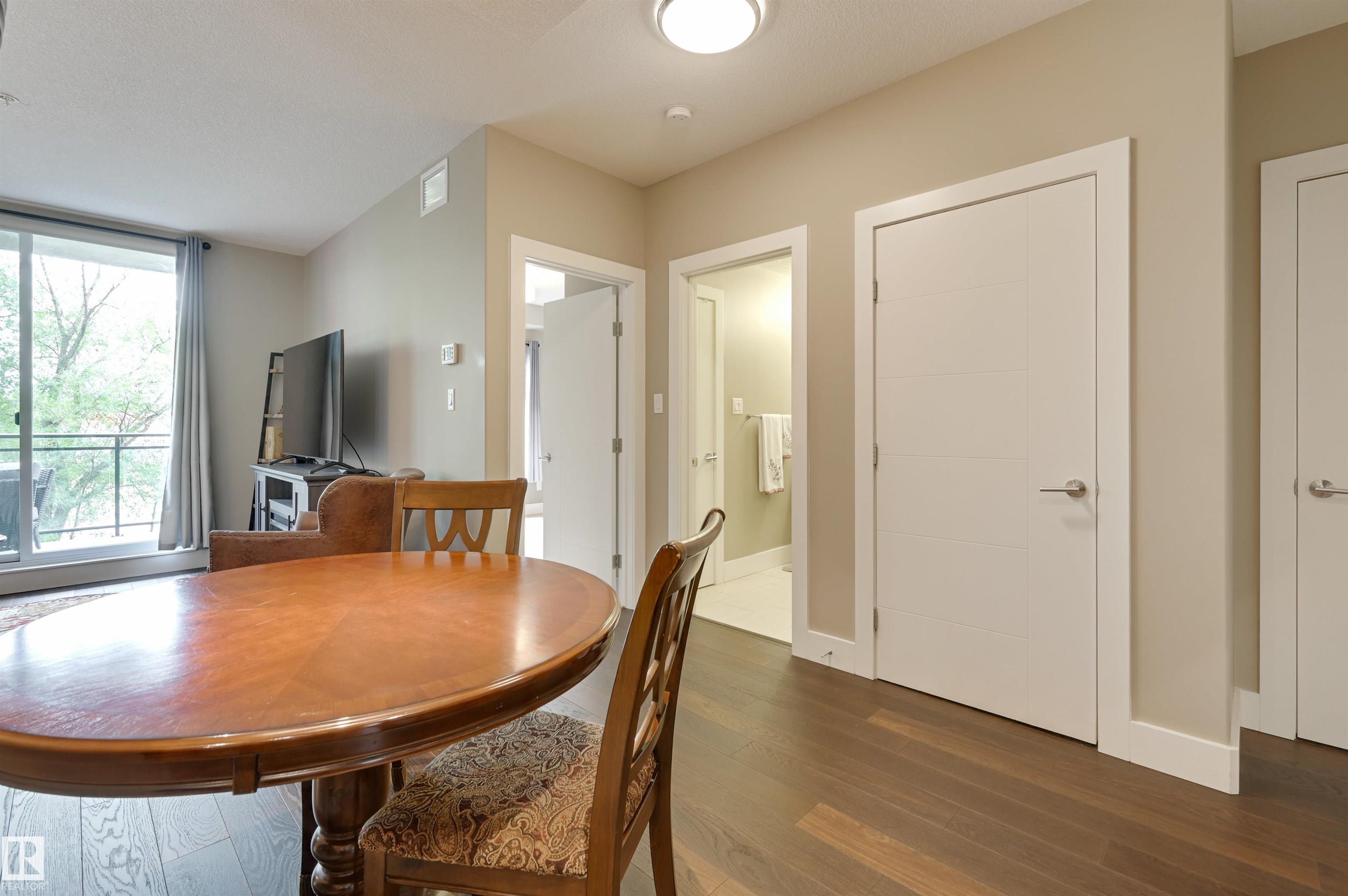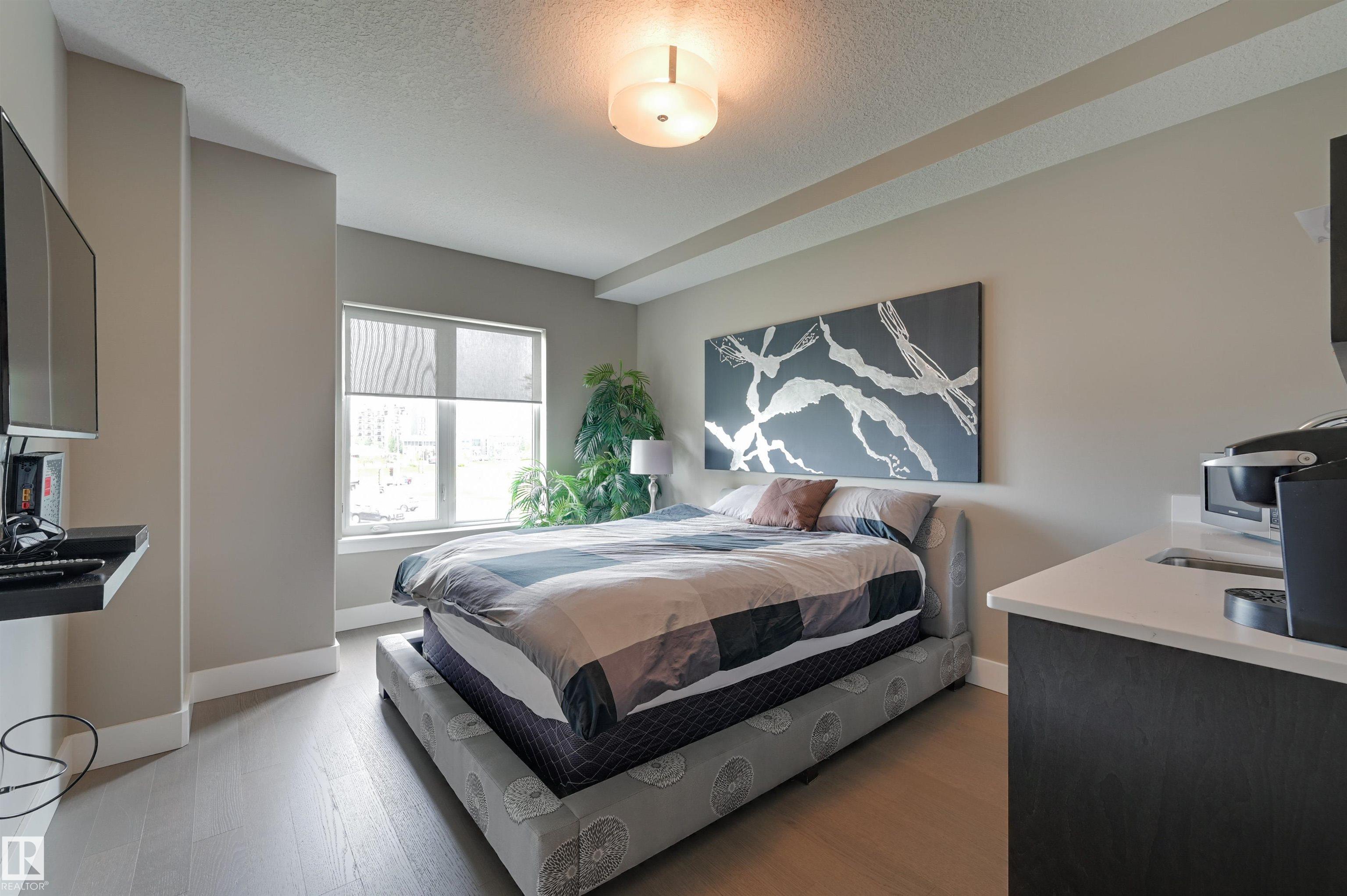 LIKE NEW! Stylish 2 Bed, 2 Bath Condo in the E'SCAPES Building. Welcome to upscale living in one of South Edmonton's most sought-after concrete buildings. This meticulously maintained 2nd-floor unit features a modern open-concept layout with engineered hardwood flooring, granite countertops, full-height cabinetry, high ceilings, & in-suite laundry. The kitchen includes a peninsula with bar seating, S/S appliances, & tons of cabinetry. The spacious primary bedroom offers a walk-through closet & a private 4-piece ensuite, while the second bedroom is ideally situated next to a full bathroom--great for guests or a home office. Enjoy natural light through the large patio doors leading to a balcony surrounded by trees for added privacy. TWO titled heated underground parking stalls--one conveniently located close to the elevator! Enjoy premium amenities: a fully equipped fitness centre, social lounge with pool table & TWO rooftop patios. Unbeatable location-- shopping, dining, parks, trails, & quick to Henday.