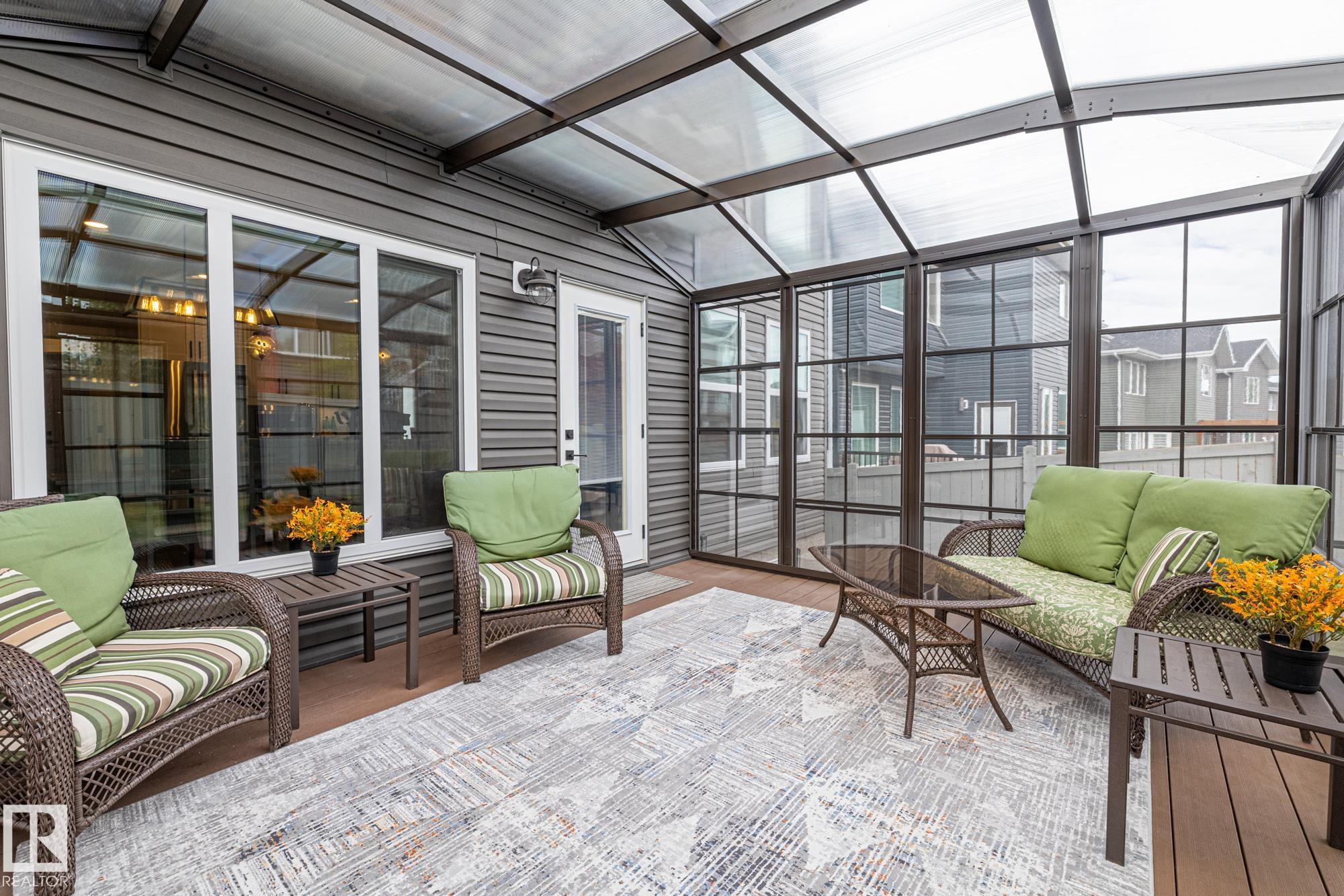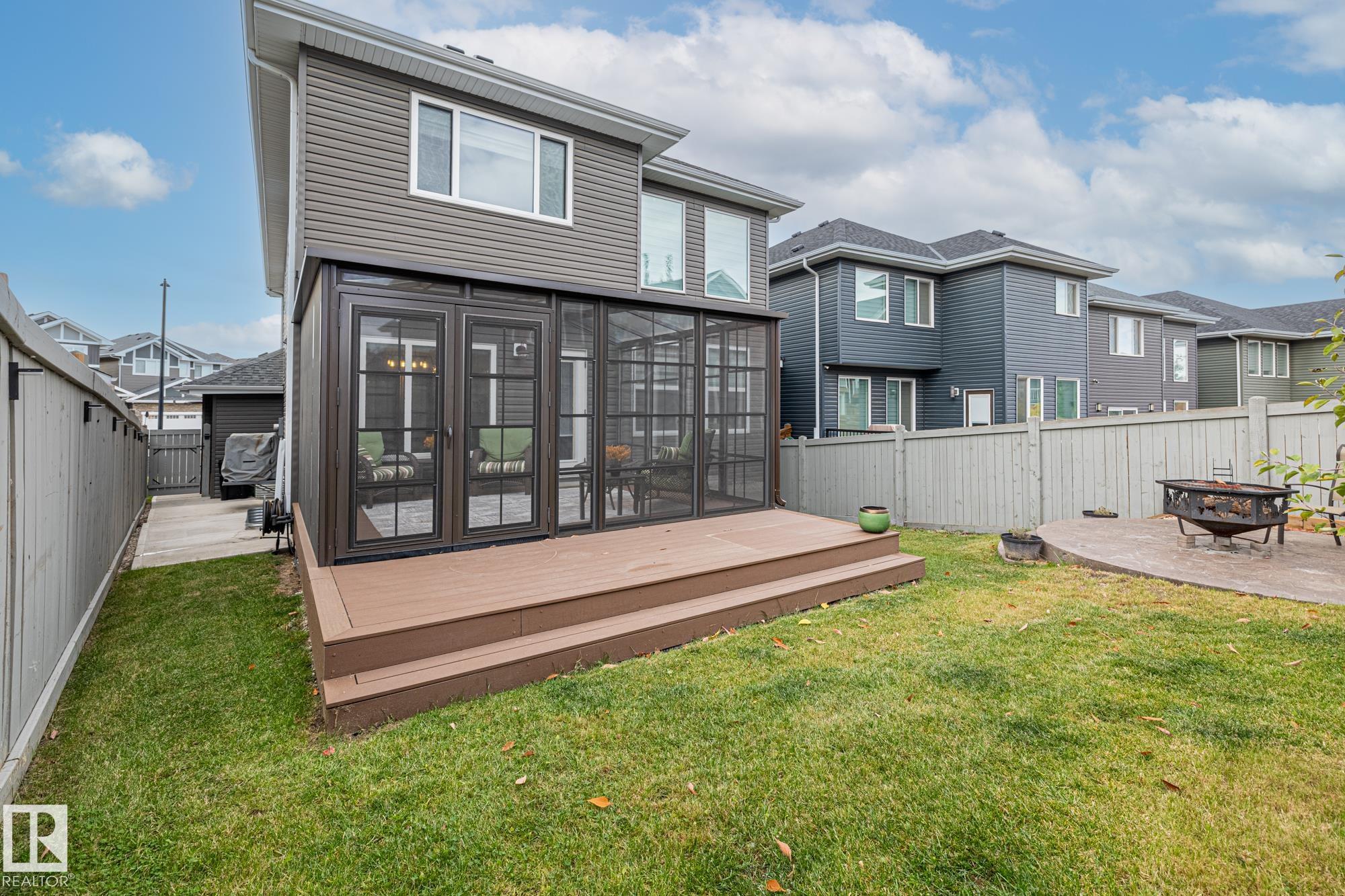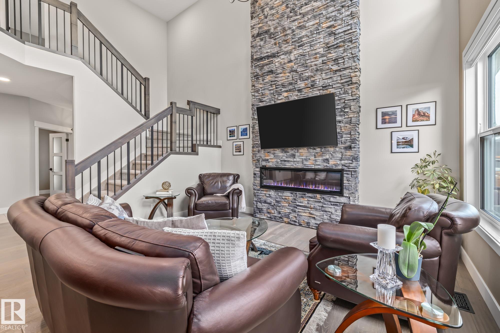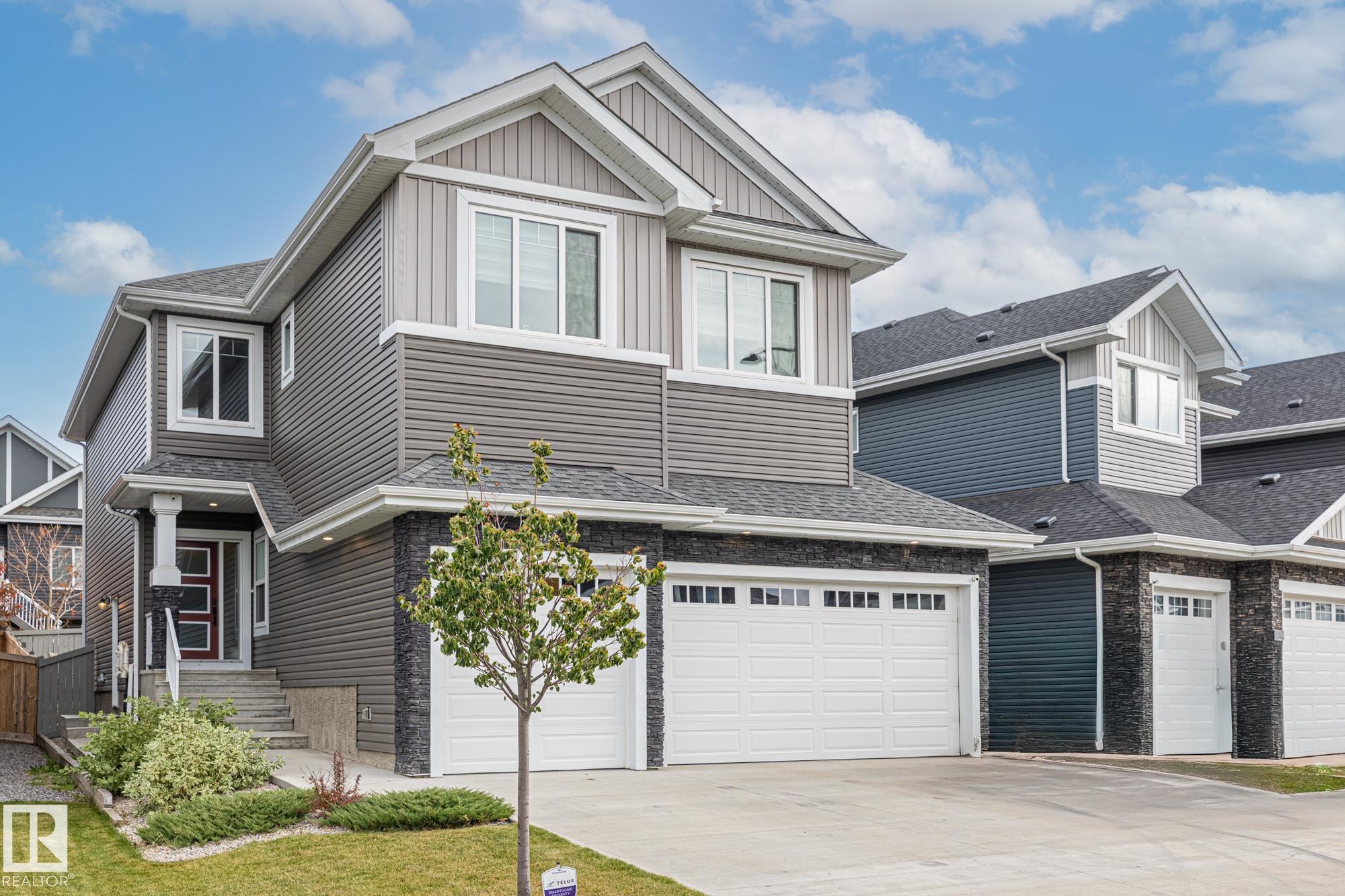 This stunning, upgraded home shows better than new! With nearly 2,400 sq ft, a triple garage, and a fully finished legal-suite basement, this property offers incredible flexibility. The main floor features a front den/office, 2-pc bath, and a two-storey great room with a floor-to-ceiling stone fireplace. The chef's kitchen includes quartz countertops, a large island, white cabinetry, and a walk-through pantry leading to a custom mudroom. A newly added 3-season room extends the living space and offers the perfect spot to relax. Upstairs, the spacious primary suite has a 5-pc ensuite, walk-in closet, and access to the second-floor laundry. Two additional bedrooms, a 4-pc bath, and a large bonus room complete the level. The basement includes a legal suite with a kitchen, living area, 4th bedroom, and 3-pc bath. Finished with A/C, landscaped yard.