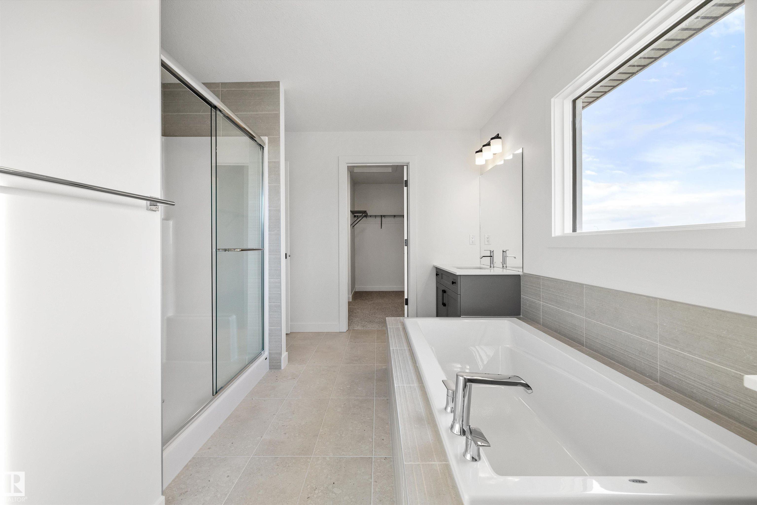 Built by Sterling Homes, this front-attached home in The Uplands at Riverview blends luxury finishes with functional family living in one of West Edmonton's most scenic communities. Triple-pane windows and 9' ceilings brighten the open main floor, where a welcoming foyer leads to a mudroom with access to the spice kitchen and walk-in pantry. The main kitchen features quartz countertops, a large island, custom cabinetry, chimney hood fan, full-height tile backsplash, and built-in microwave. The great room offers a tiled fireplace with wood mantle and a patio door to the backyard. Upstairs, the primary suite includes a 5-piece ensuite with freestanding tub, double sinks, glass shower, and walk-in closet connected to the laundry room. A bonus room, double-sink bath, and two bedrooms with walk-in closets complete the level. Finished with luxury vinyl plank flooring, upgraded railings, side entrance, and a double attached garage with floor drain.