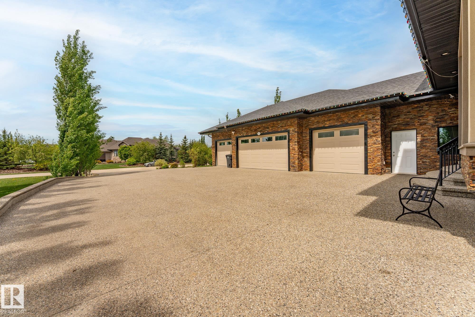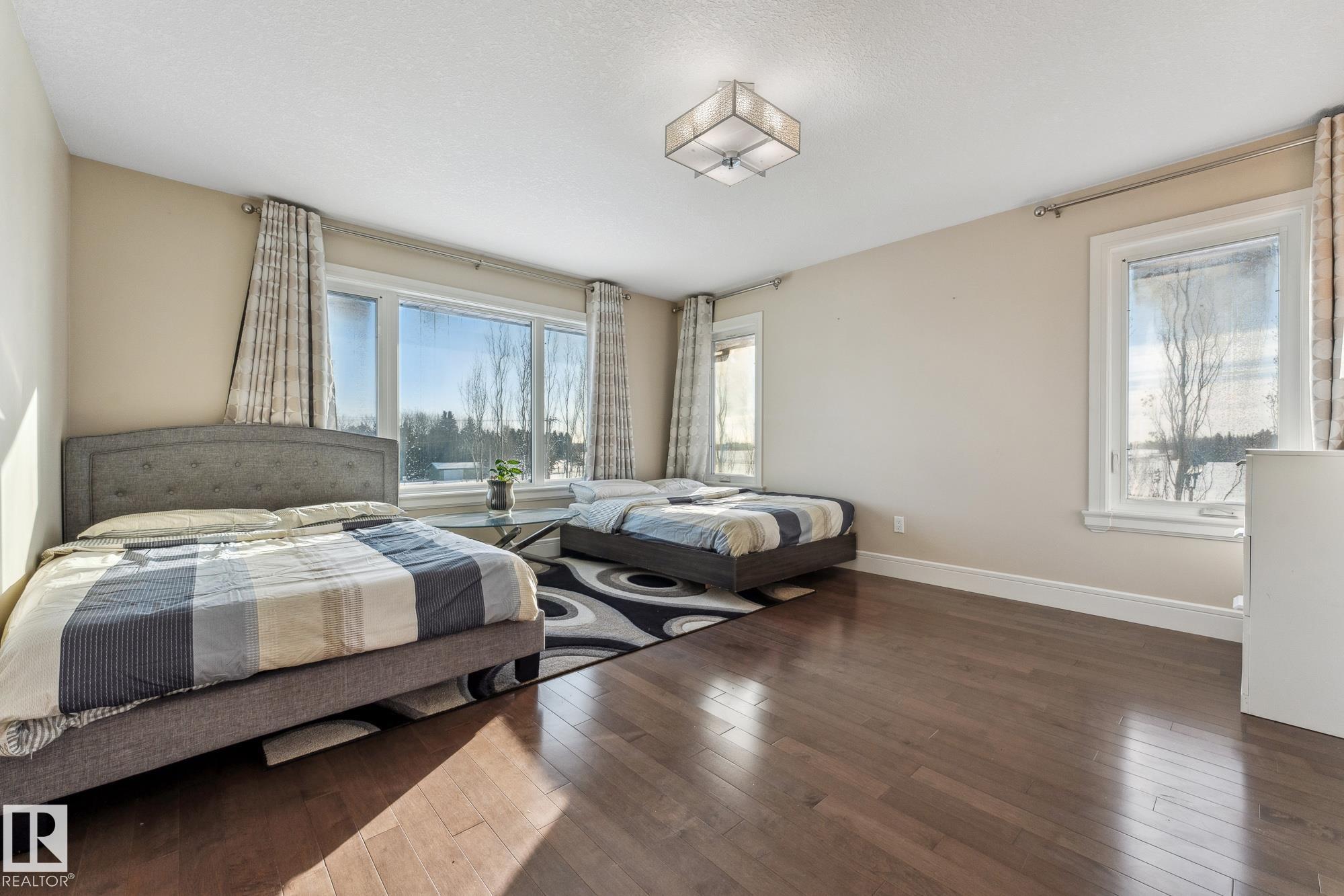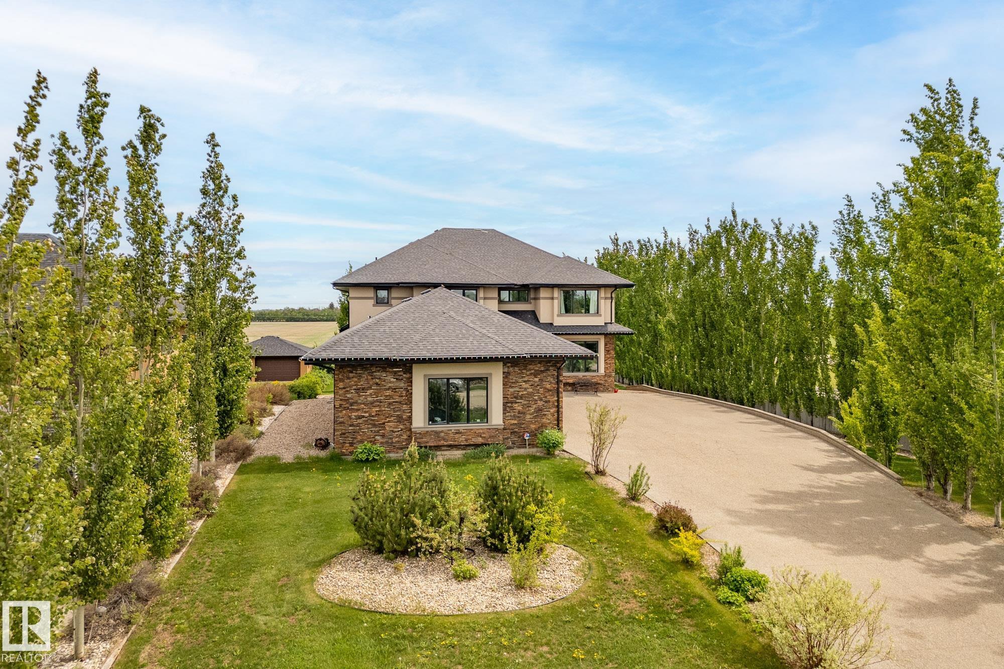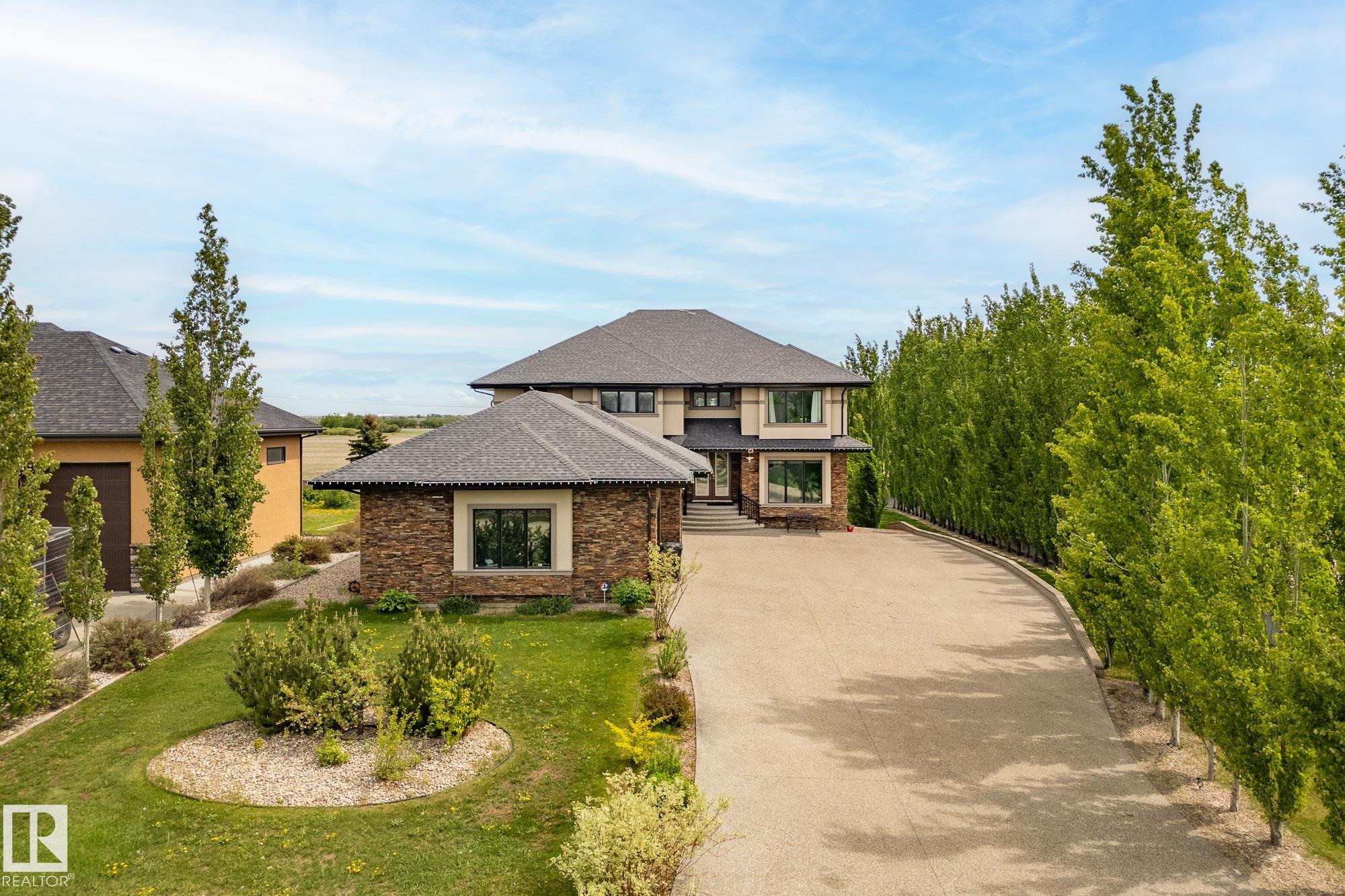 Nestled on a half-acre lot less than 5 minutes from Edmonton, this 6 bed, 7 bath home offers over 4,000 square feet of elegance and luxury! The gourmet kitchen features granite countertops, gas cooktop and double islands. Access the deck off the kitchen or the main floor bedroom, complete with a walk in closet and ensuite. A sitting area, formal dining, walk thru pantry and laundry room finish the main floor. Upstairs features a bonus room, 2 bedrooms and a 4 piece bath. The primary suite is a private retreat with a luxurious en-suite including a jacuzzi tub, dual vanities, and a spacious walk-in closet. The walkout basement is perfect for entertaining with over 2000 sq ft, a wet bar, fireplace and two bedrooms. The attached 4 car garage features in floor heat and one bay is equipped with a second kitchen, garage door screen and a 3 piece bathroom. Municipal water and sewer. Located close to Edmonton and St Albert. Country living with city amenities!
