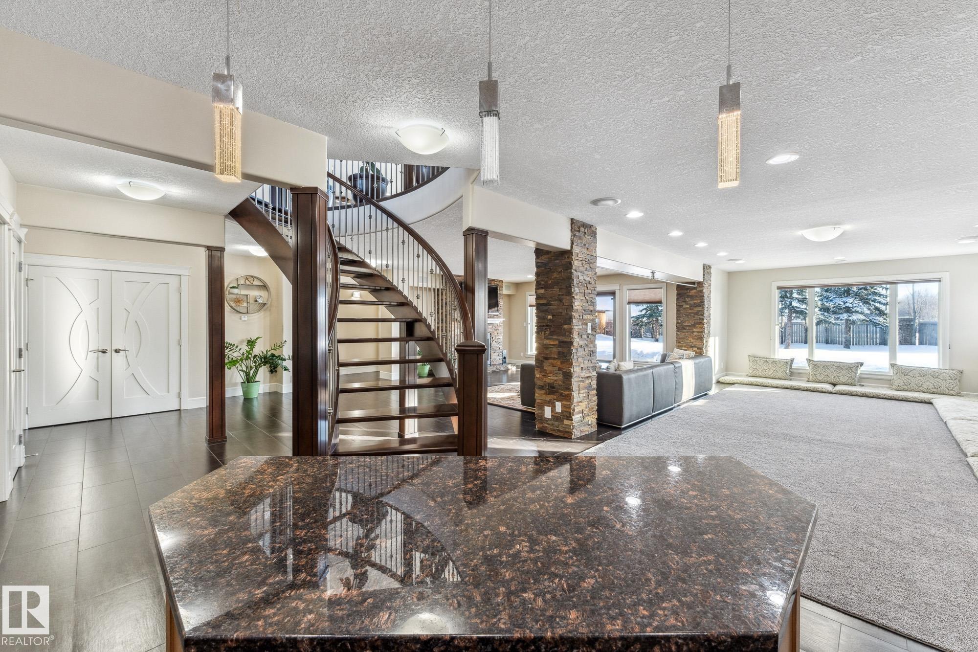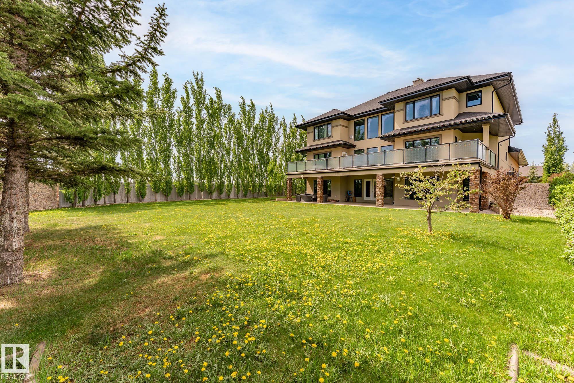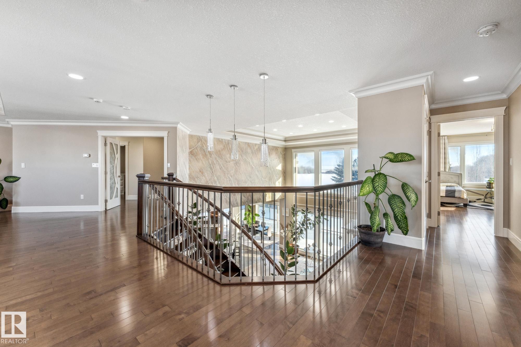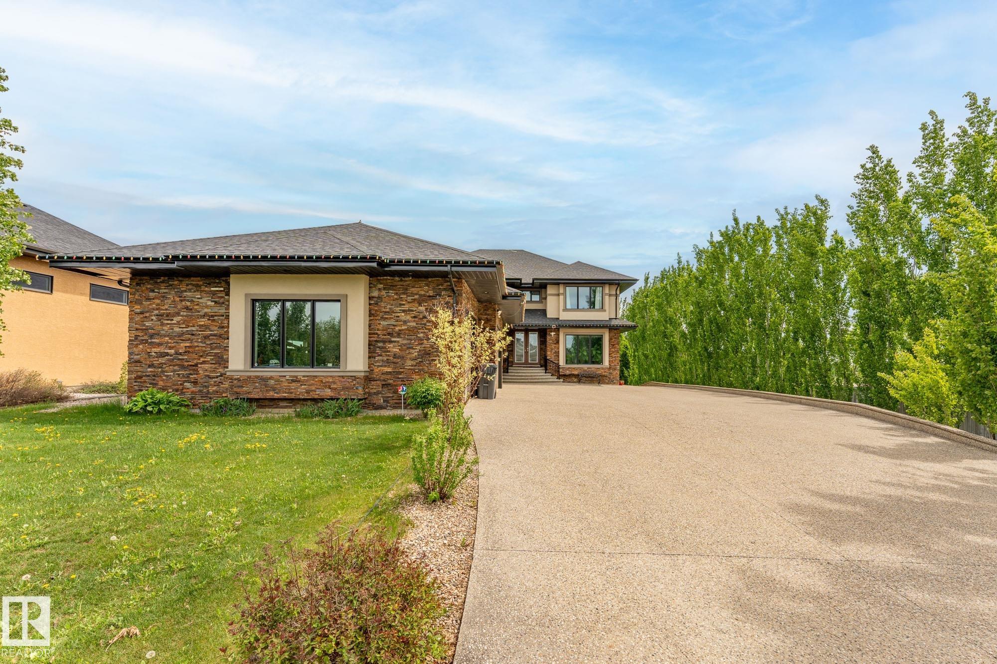 Nestled on a half-acre lot less than 5 minutes from Edmonton, this 6 bed, 7 bath home offers over 4,000 square feet of elegance and luxury! The gourmet kitchen features granite countertops, gas cooktop and double islands. Access the deck off the kitchen or the main floor bedroom, complete with a walk in closet and ensuite. A sitting area, formal dining, walk thru pantry and laundry room finish the main floor. Upstairs features a bonus room, 2 bedrooms and a 4 piece bath. The primary suite is a private retreat with a luxurious en-suite including a jacuzzi tub, dual vanities, and a spacious walk-in closet. The walkout basement is perfect for entertaining with over 2000 sq ft, a wet bar, fireplace and two bedrooms. The attached 4 car garage features in floor heat and one bay is equipped with a second kitchen, garage door screen and a 3 piece bathroom. Municipal water and sewer. Located close to Edmonton and St Albert. Country living with city amenities!