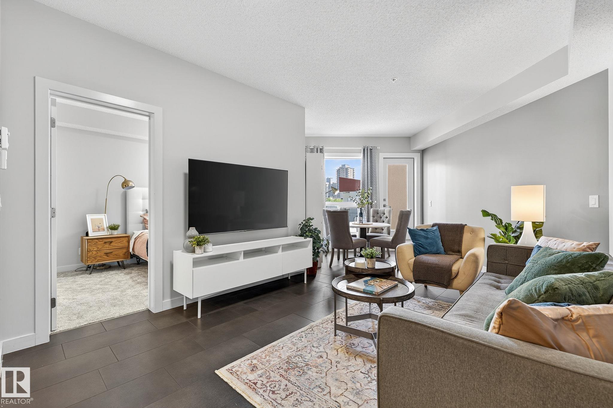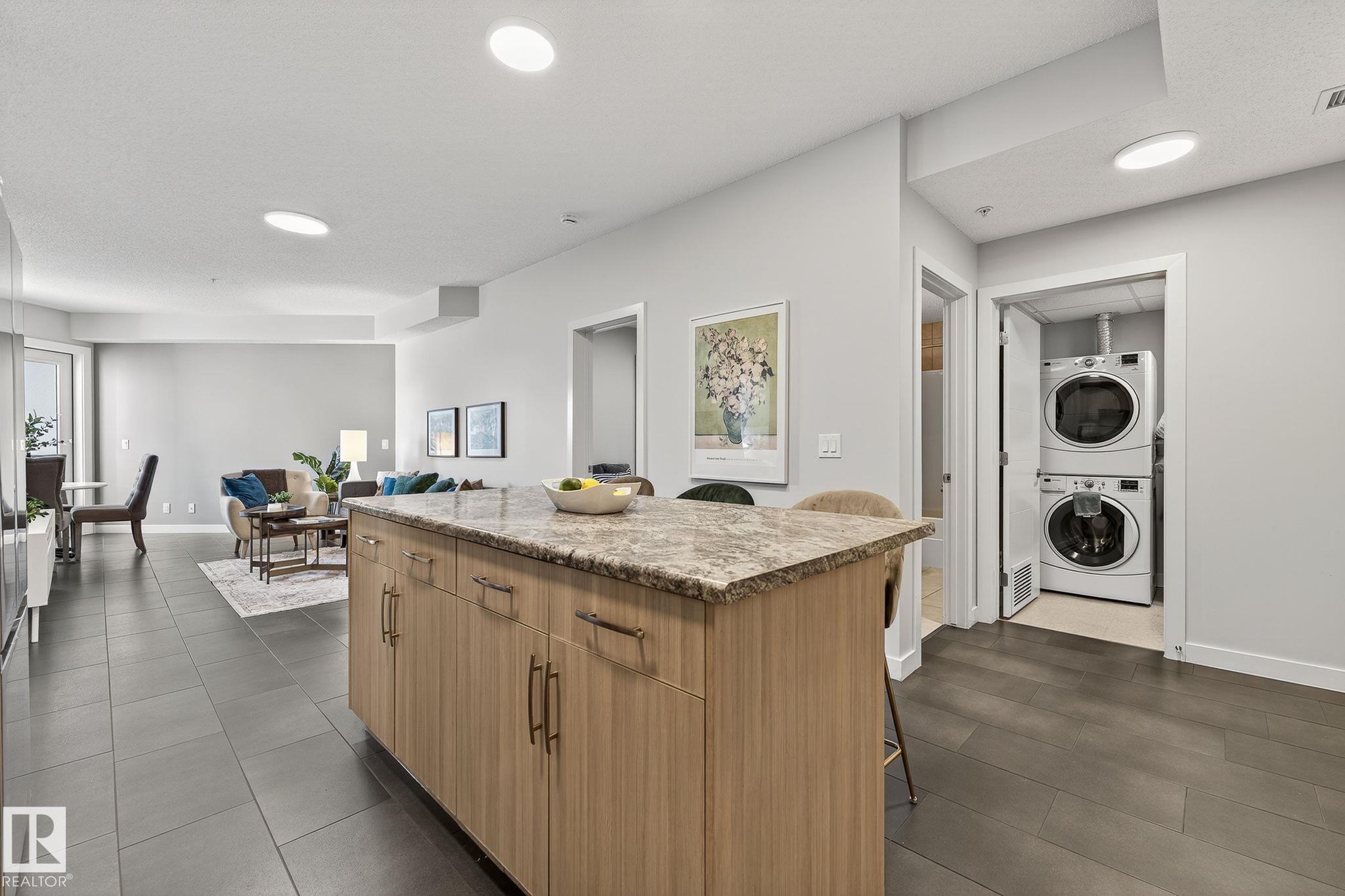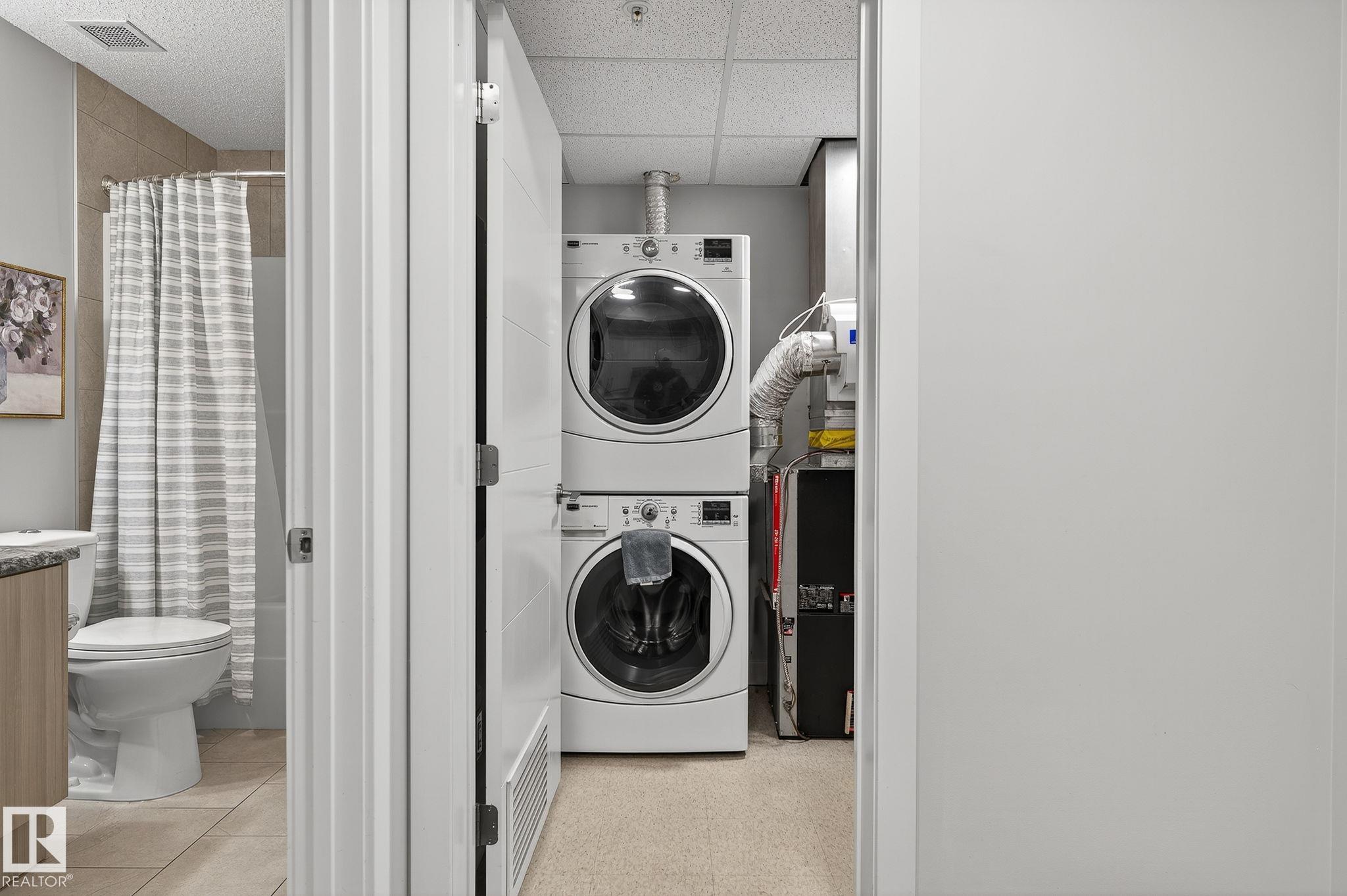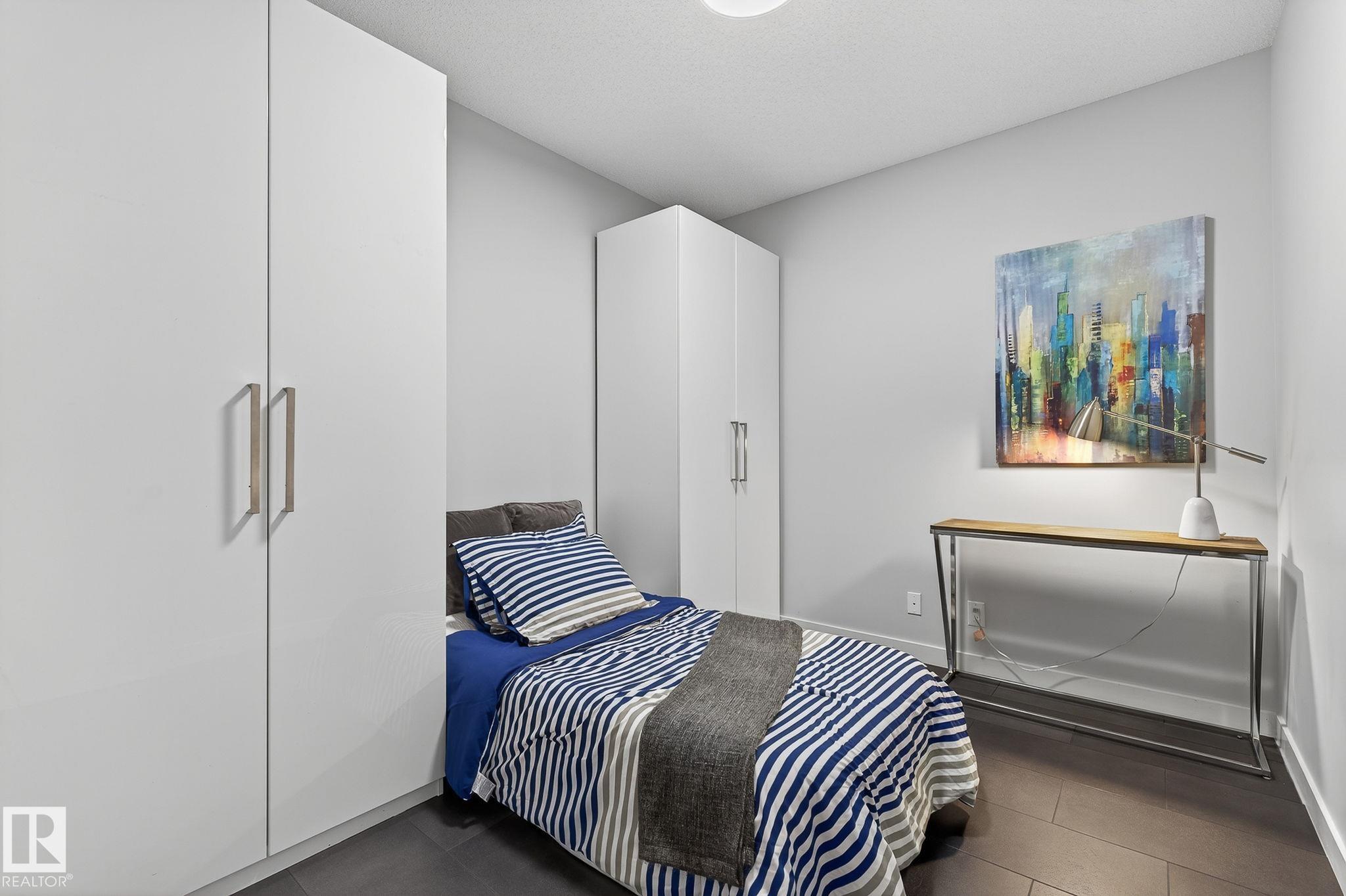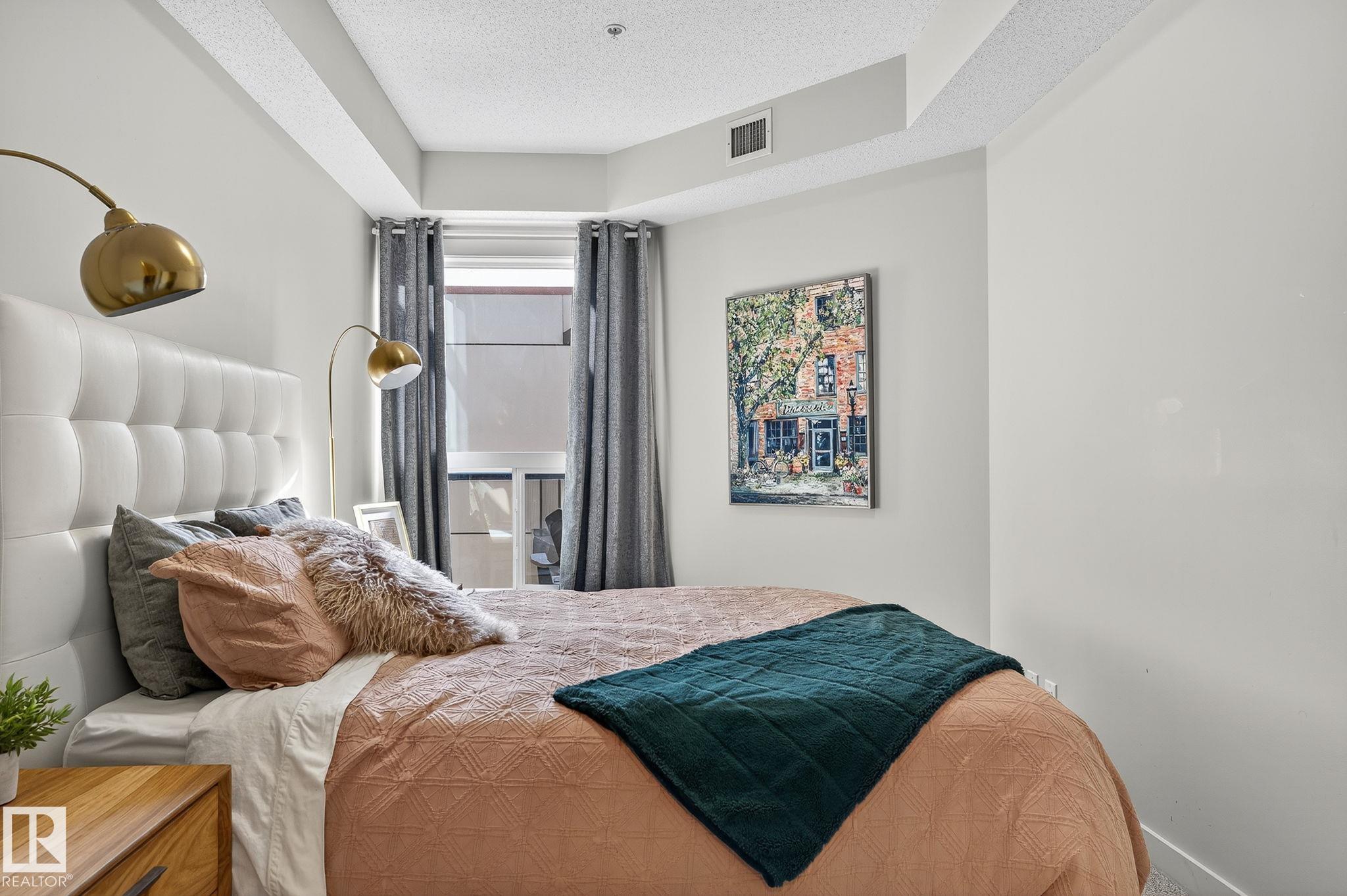Top floor executive condo that is nestled between the vibrant High Street & the trendy Brewery District! Two bedrooms with two full baths. A hop, skip and jump or bike to your favourite coffee shops, restaurants, groceries, gym etc. 1 block from new LRT. You'd feel right at home with the great layout & relaxing ambience. New renos including contemporary paint, elegant large dark vinyl plank flooring & new carpet in master bedroom. The chef's kitchen has all new appliances except the dishwasher, beautiful tile backsplash, ample cabinets & a huge working island. Spacious living room is next to the bright & cheery dining area which has door onto the private balcony. Cozy master retreat has Pax closet organizer & a nice 4 piece ensuite. Well positioned second bedroom/den with 2 wardrobes is next to the main bath & laundry/storage. There's a stunning roof terrace with a gorgeous city view for you & your guest to enjoy year round. HVAC & A/C & gas hookup for BBQ. Secured heat underground parking stall. A 10!
