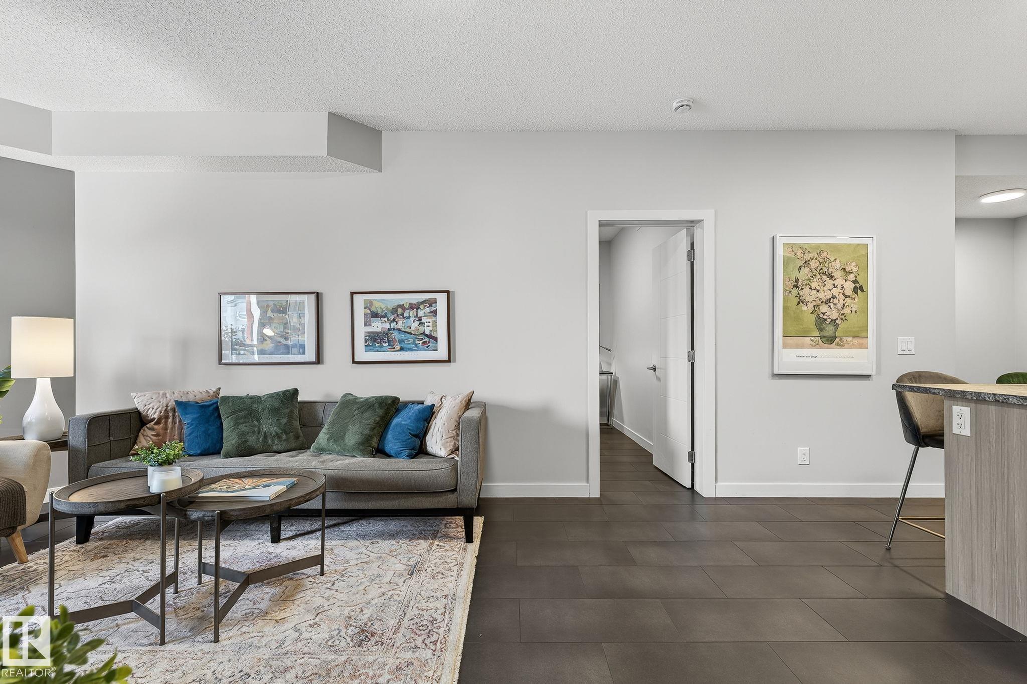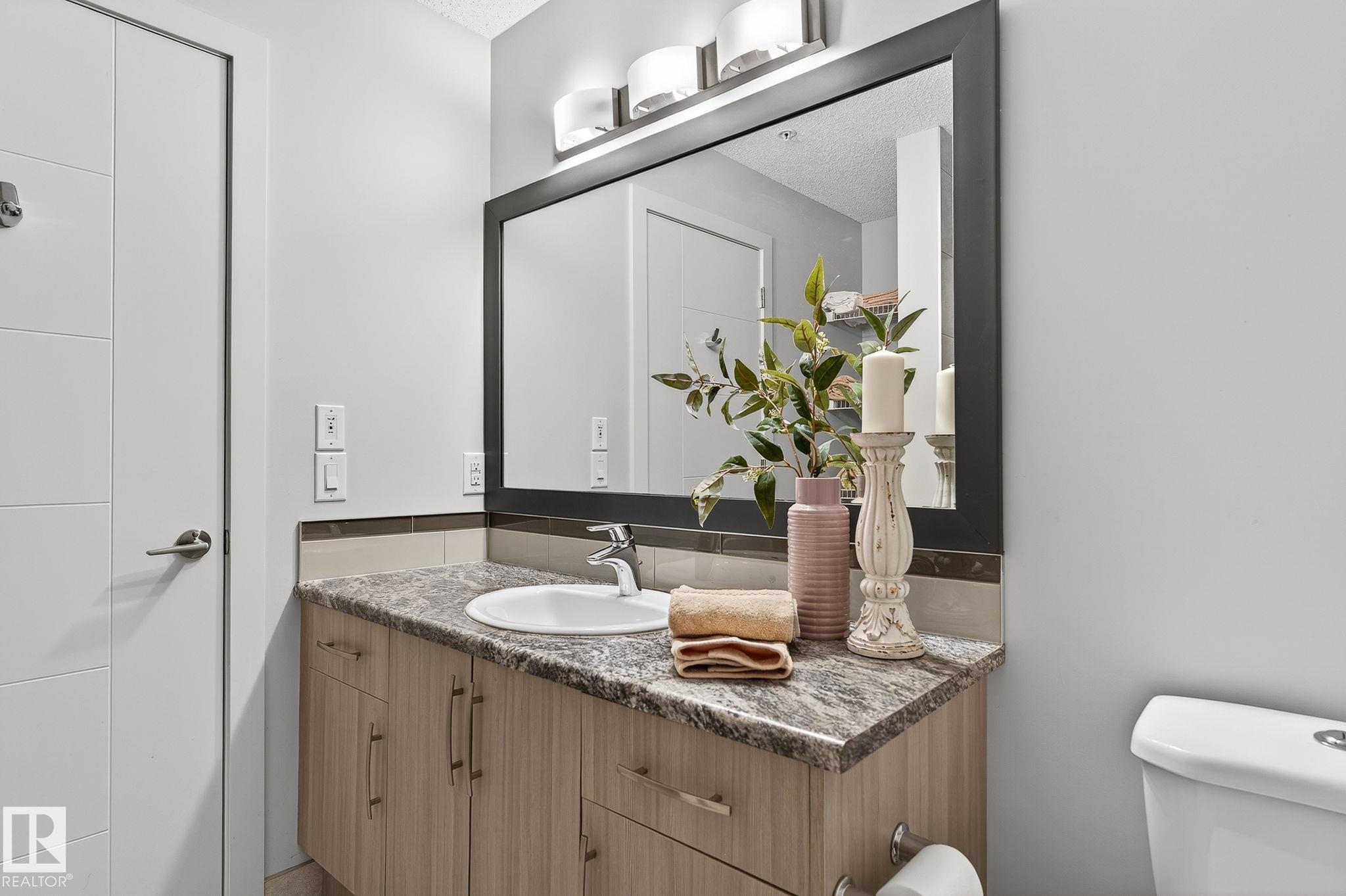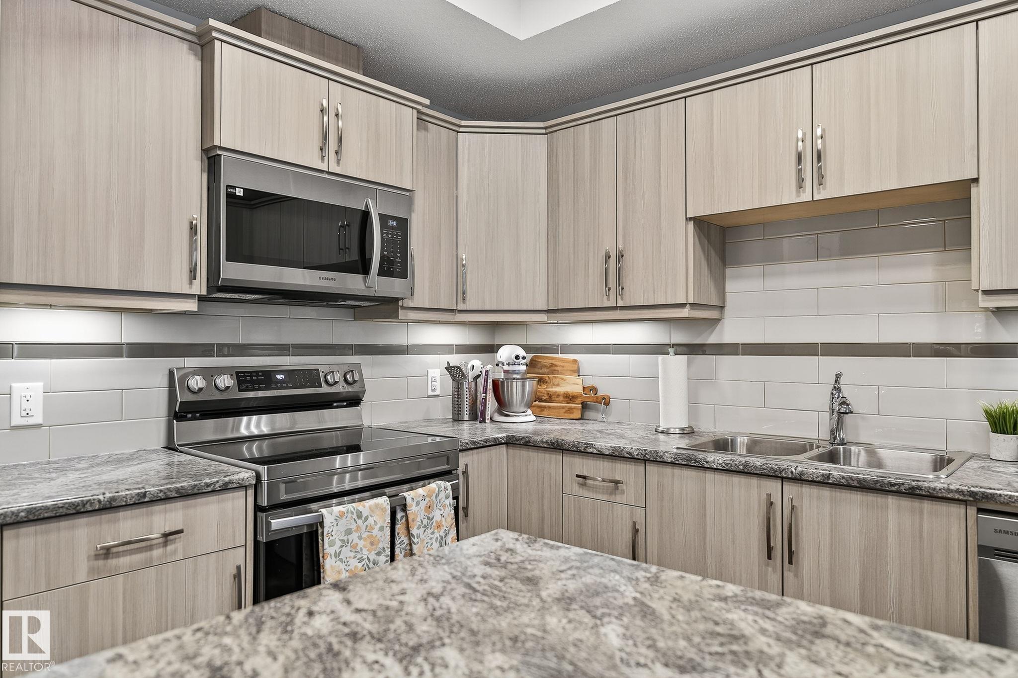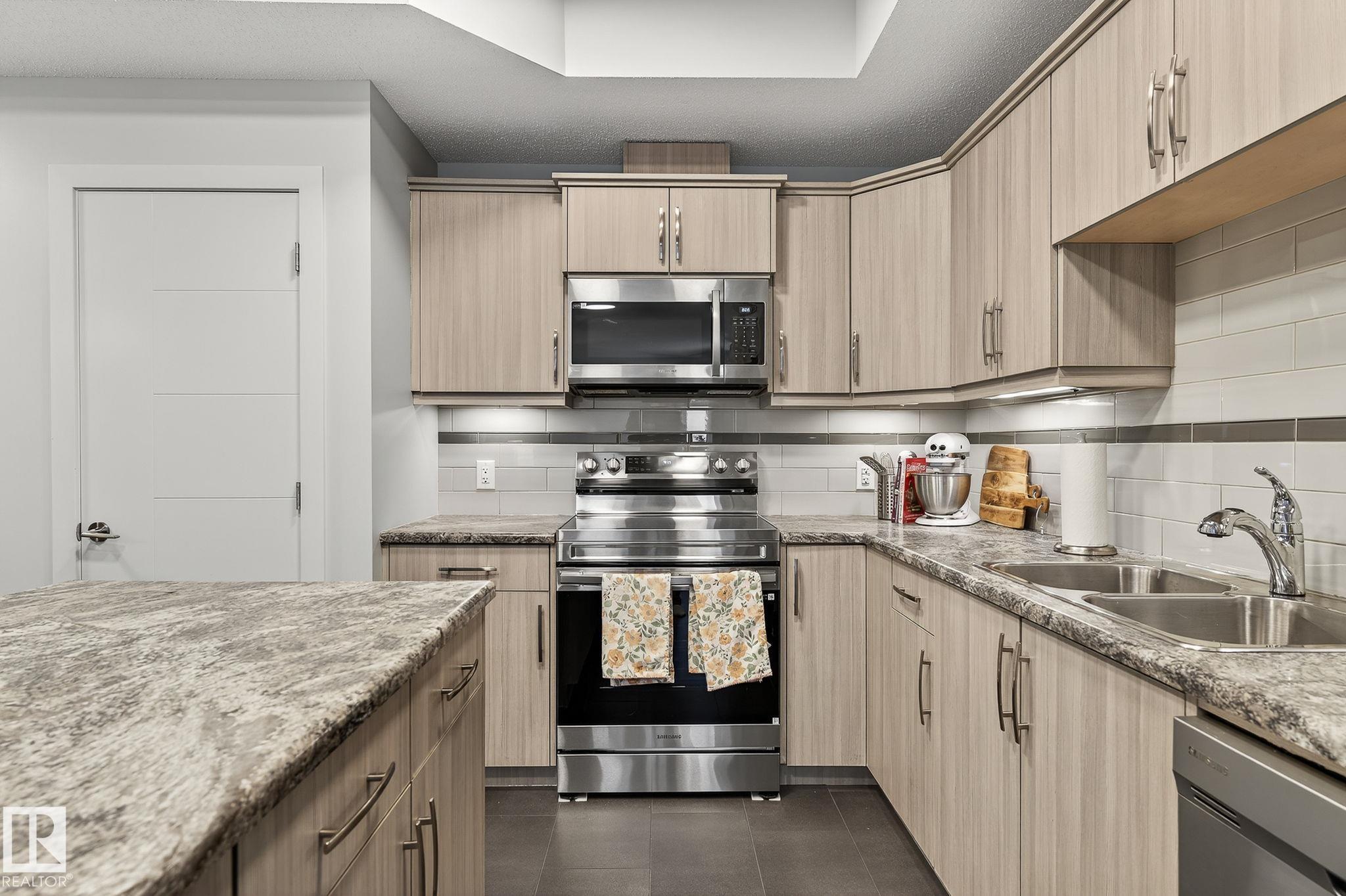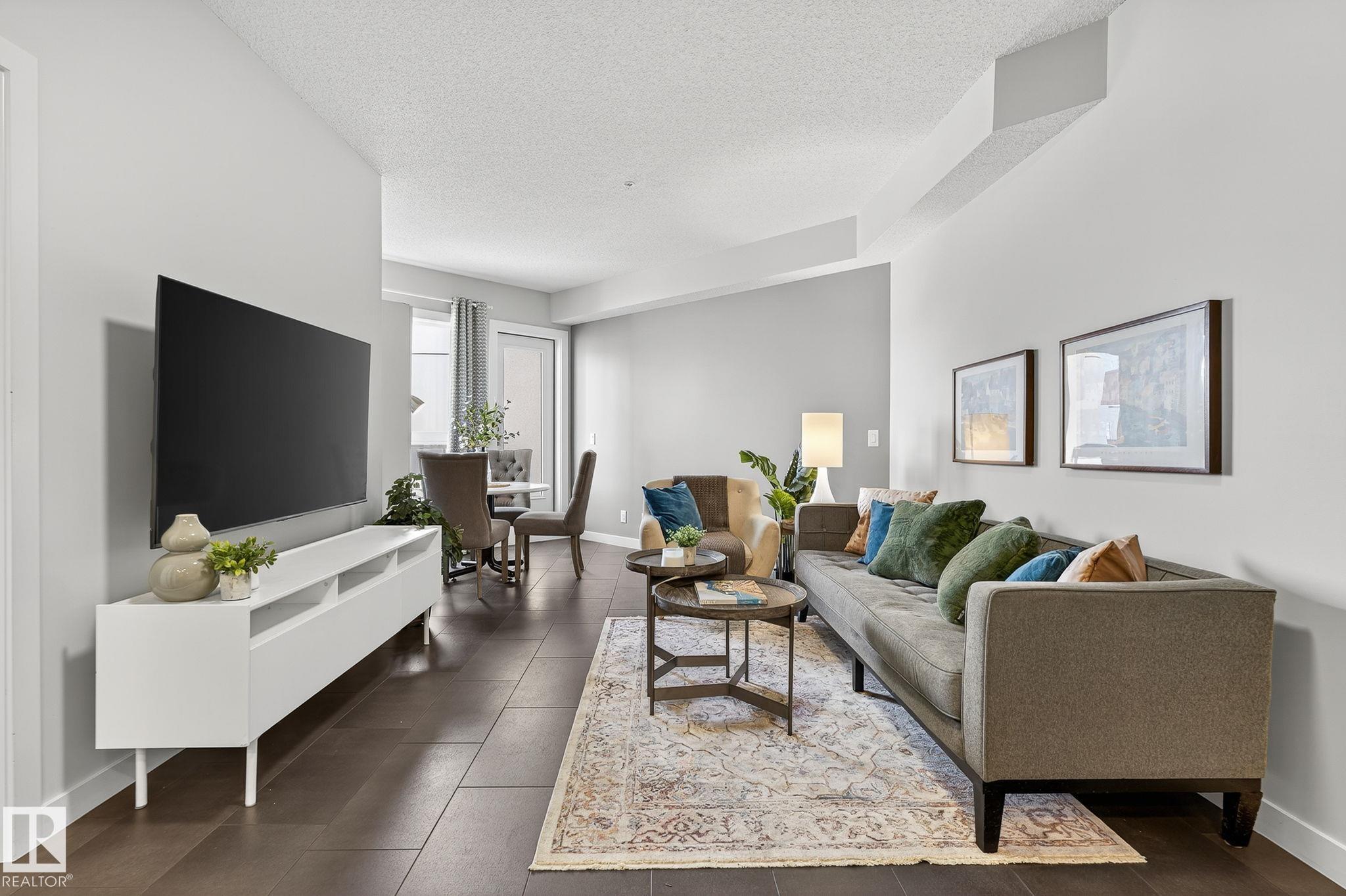 Top floor executive condo that is nestled between the vibrant High Street & the trendy Brewery District! Two bedrooms with two full baths. A hop, skip and jump or bike to your favourite coffee shops, restaurants, groceries, gym etc. 1 block from new LRT. You'd feel right at home with the great layout & relaxing ambience. New renos including contemporary paint, elegant large dark vinyl plank flooring & new carpet in master bedroom. The chef's kitchen has all new appliances except the dishwasher, beautiful tile backsplash, ample cabinets & a huge working island. Spacious living room is next to the bright & cheery dining area which has door onto the private balcony. Cozy master retreat has Pax closet organizer & a nice 4 piece ensuite. Well positioned second bedroom/den with 2 wardrobes is next to the main bath & laundry/storage. There's a stunning roof terrace with a gorgeous city view for you & your guest to enjoy year round. HVAC & A/C & gas hookup for BBQ. Secured heat underground parking stall. A 10!