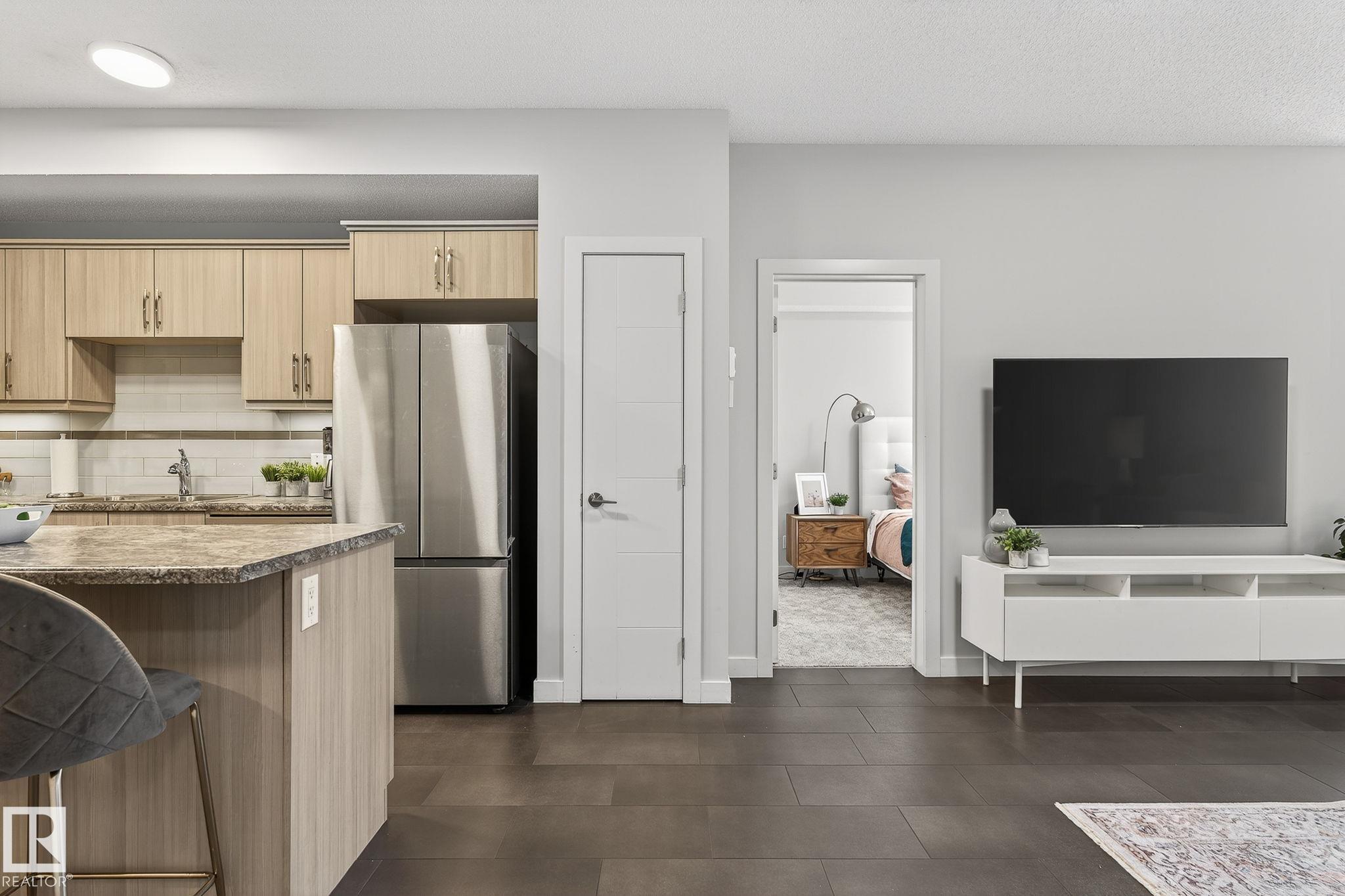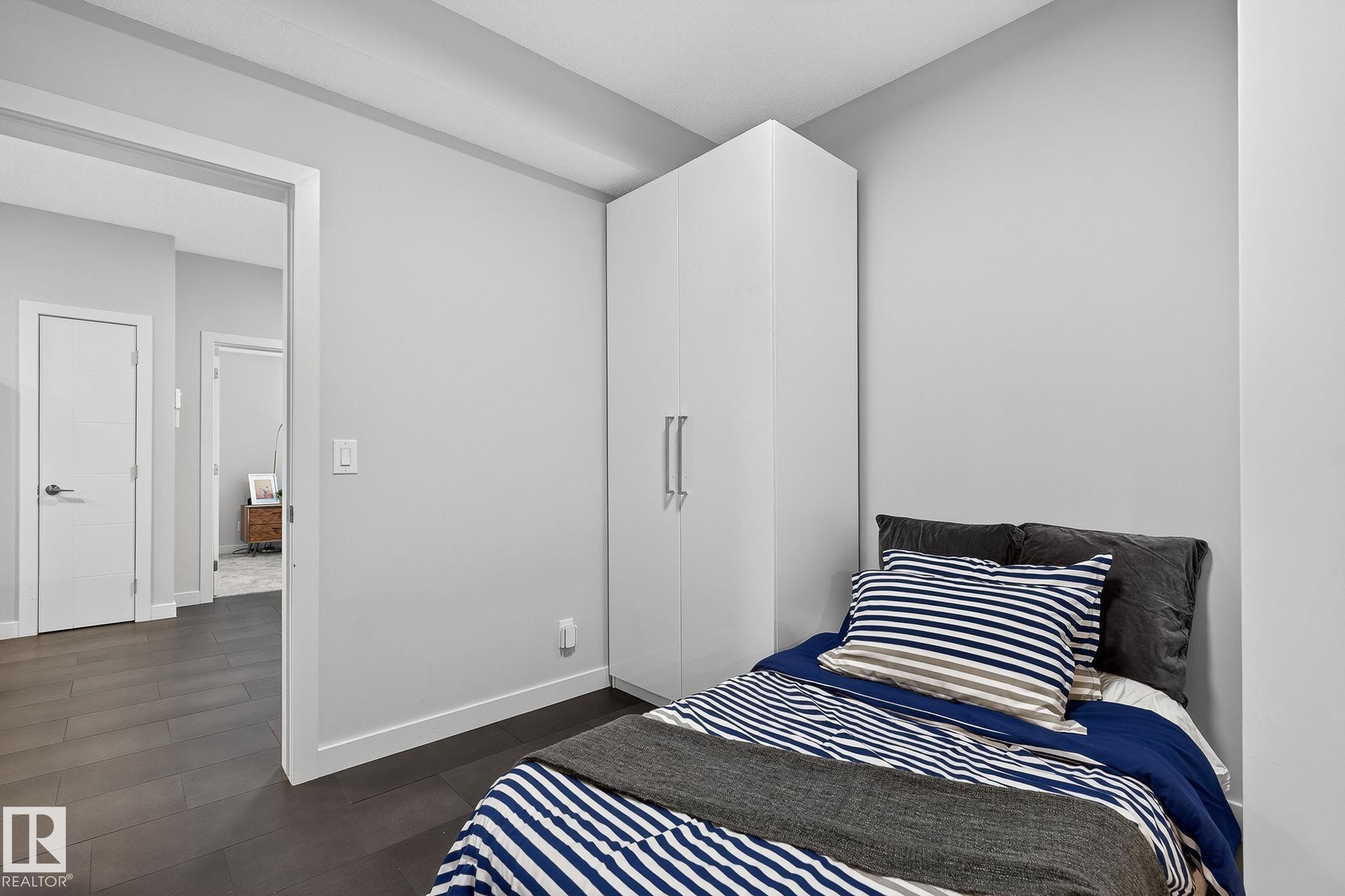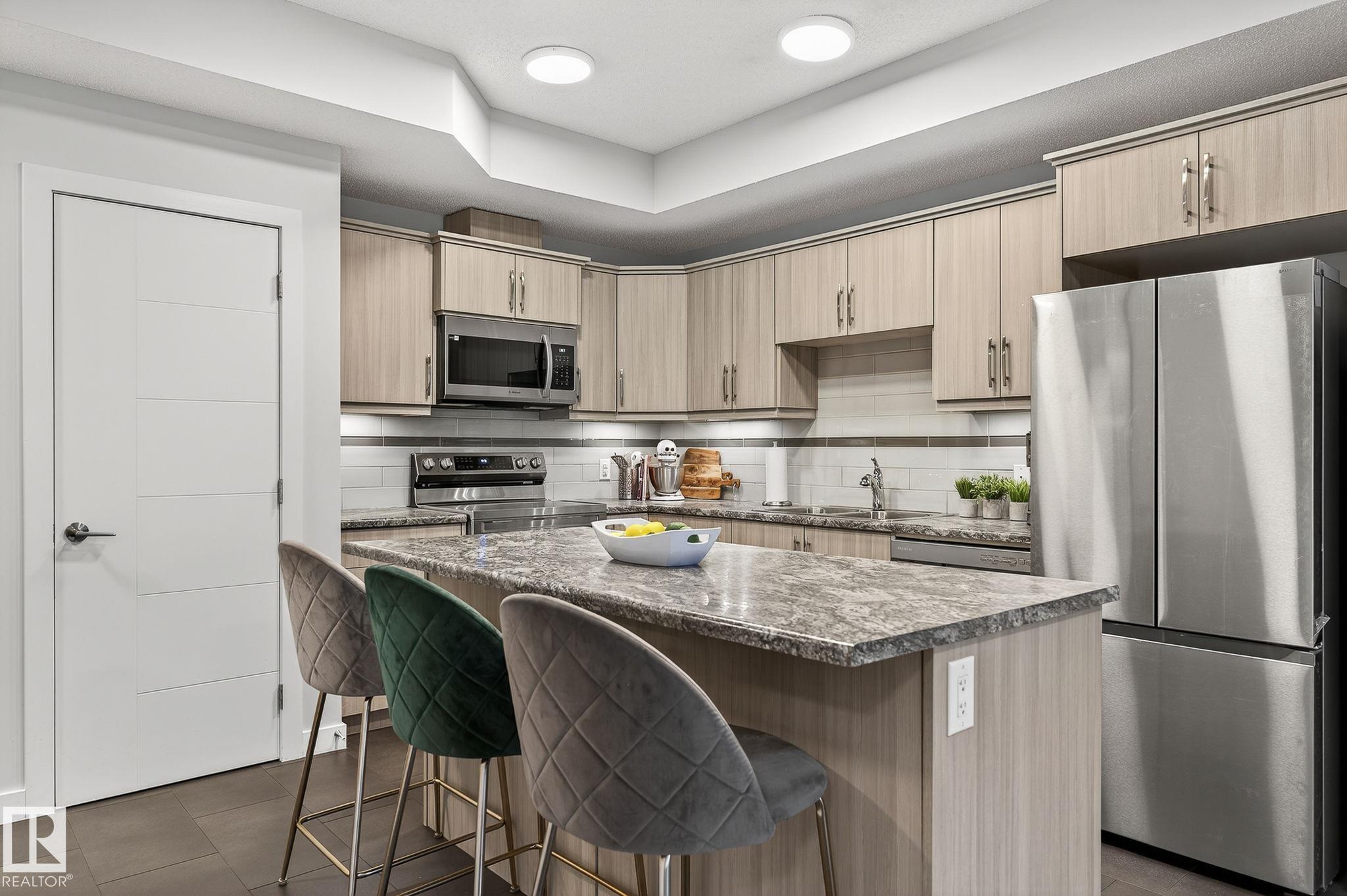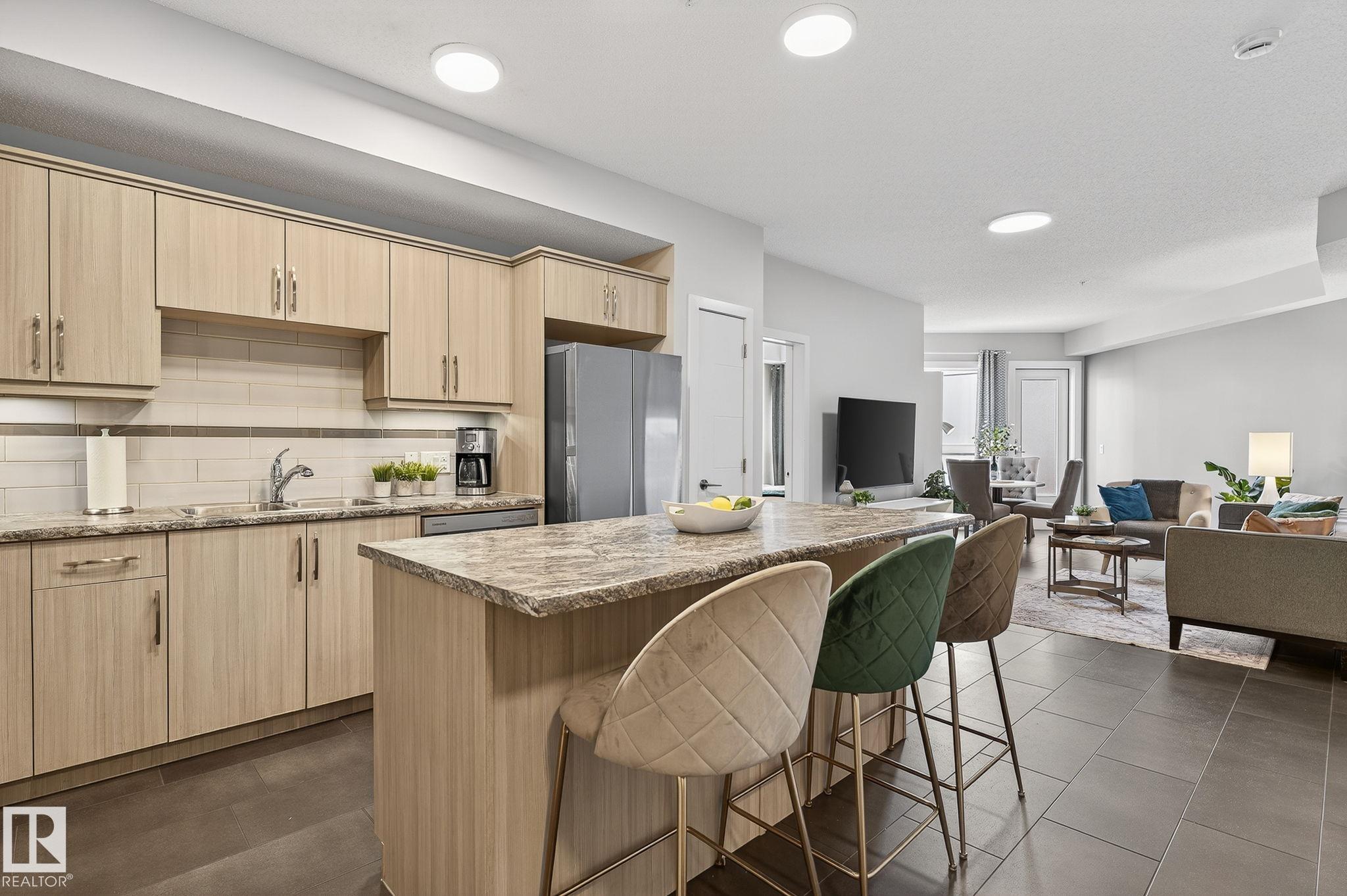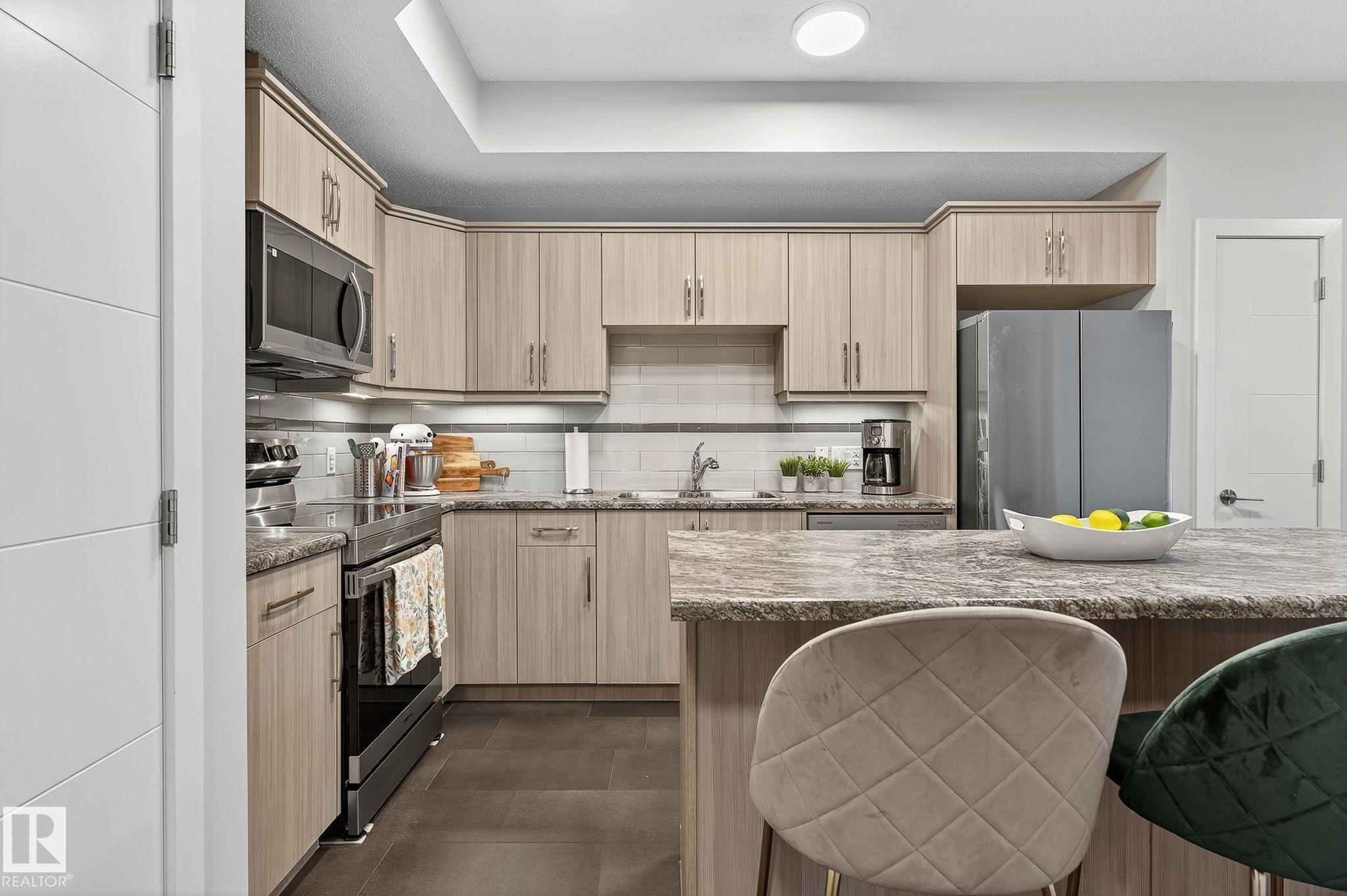 Top floor executive condo that is nestled between the vibrant High Street & the trendy Brewery District! Two bedrooms with two full baths. A hop, skip and jump or bike to your favourite coffee shops, restaurants, groceries, gym etc. 1 block from new LRT. You'd feel right at home with the great layout & relaxing ambience. New renos including contemporary paint, elegant large dark vinyl plank flooring & new carpet in master bedroom. The chef's kitchen has all new appliances except the dishwasher, beautiful tile backsplash, ample cabinets & a huge working island. Spacious living room is next to the bright & cheery dining area which has door onto the private balcony. Cozy master retreat has Pax closet organizer & a nice 4 piece ensuite. Well positioned second bedroom/den with 2 wardrobes is next to the main bath & laundry/storage. There's a stunning roof terrace with a gorgeous city view for you & your guest to enjoy year round. HVAC & A/C & gas hookup for BBQ. Secured heat underground parking stall. A 10!