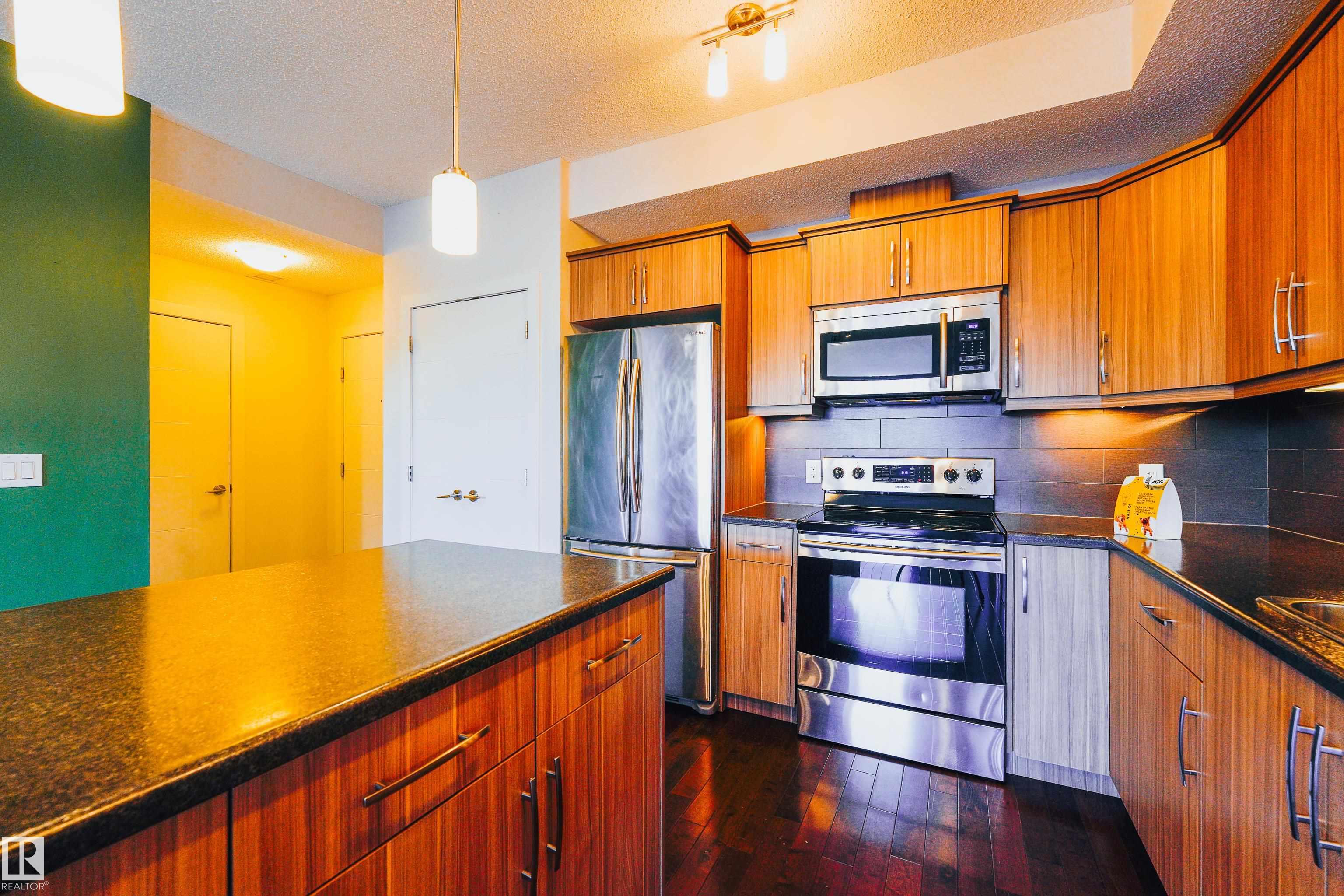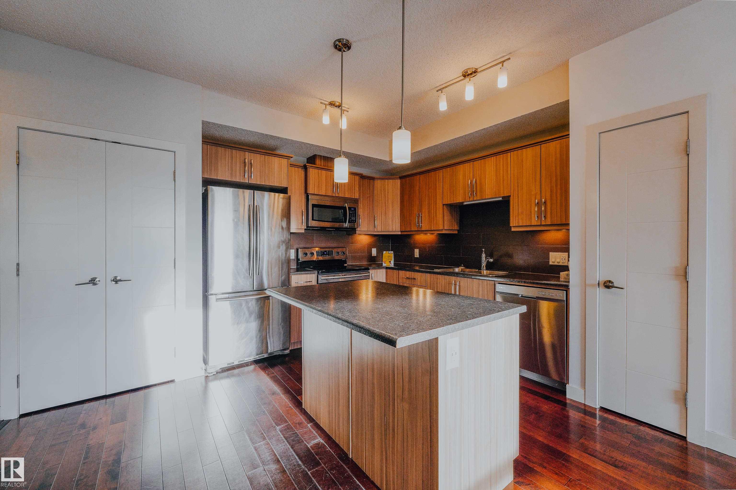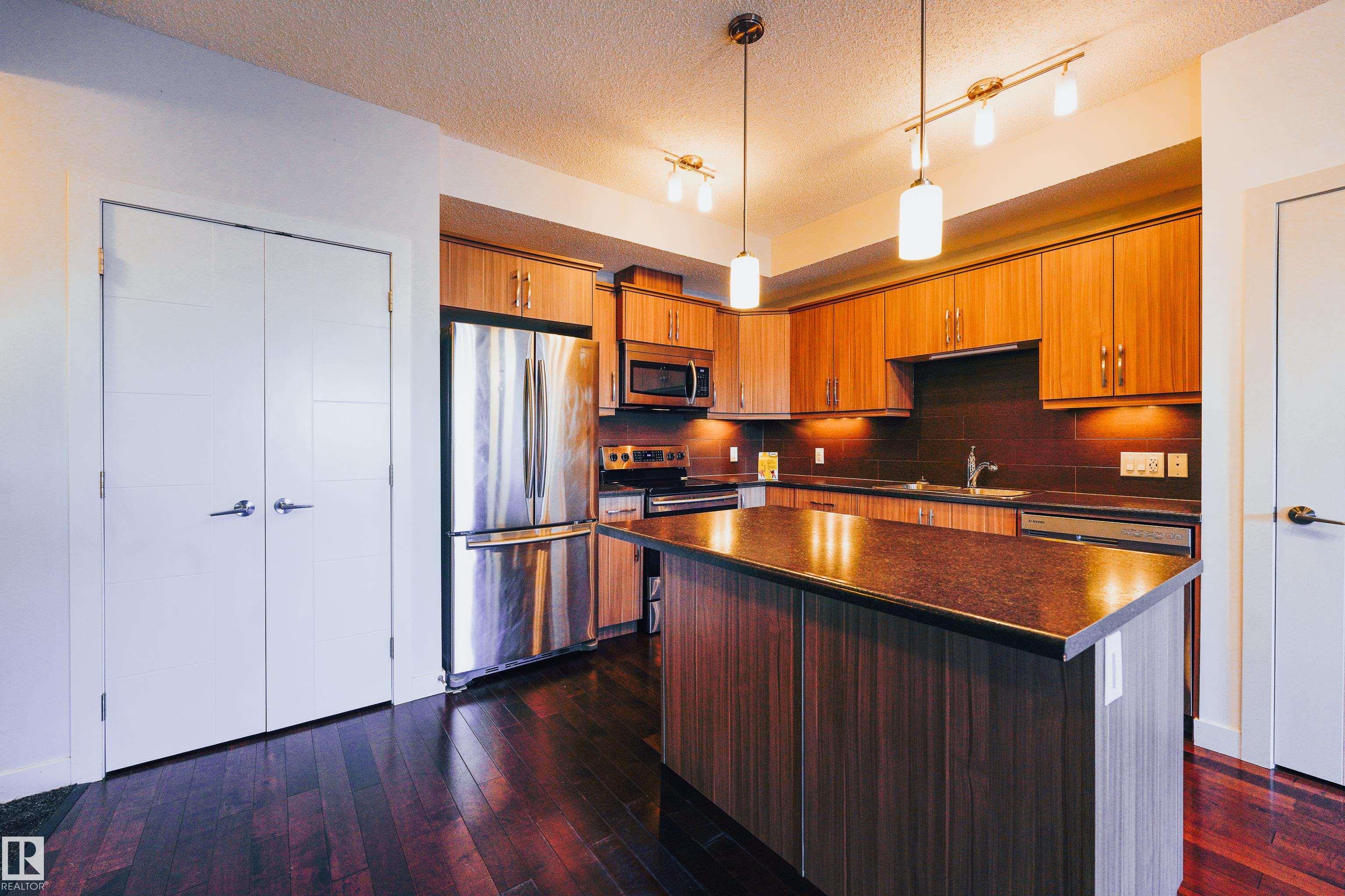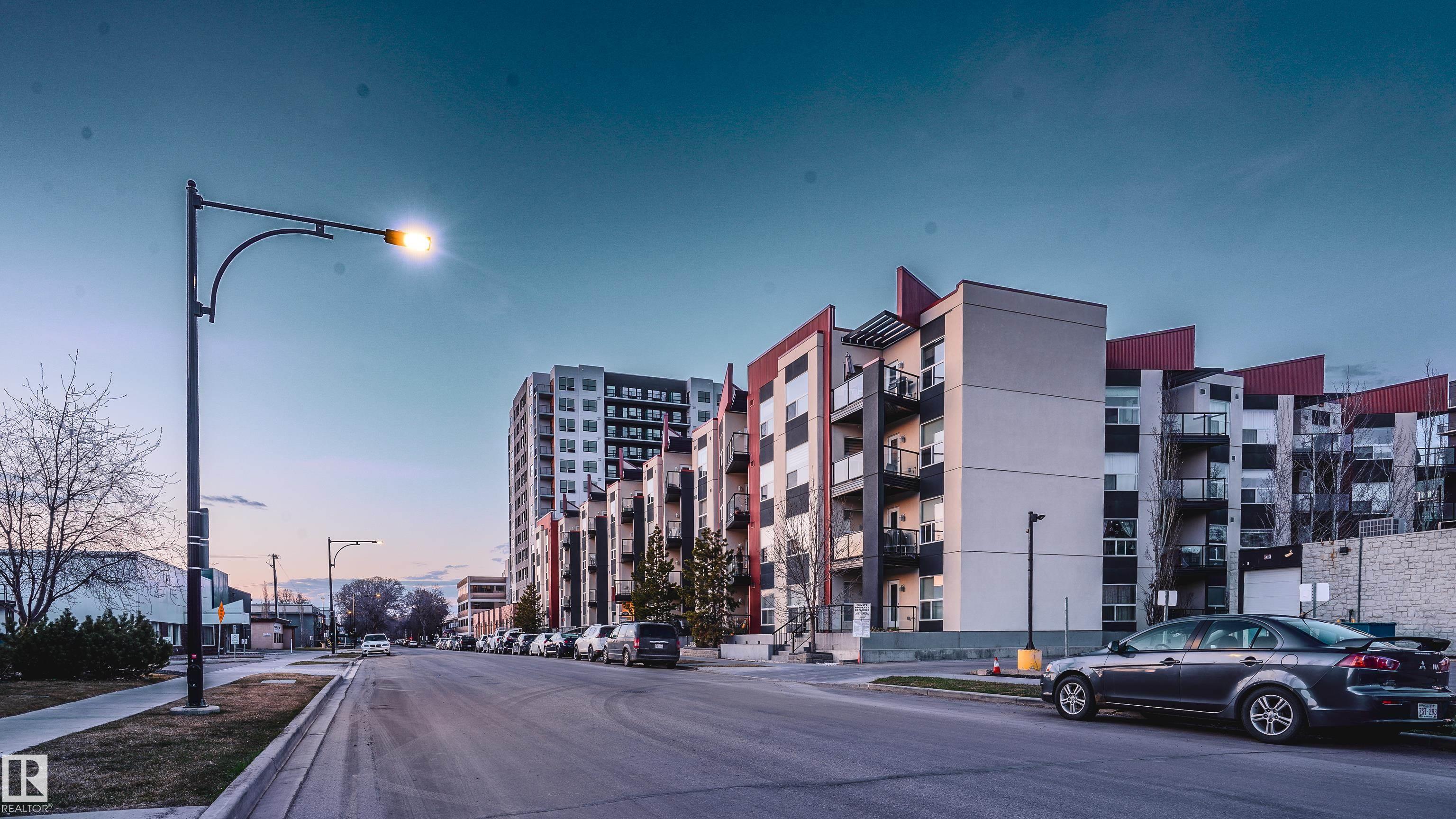 PET FRIENDLY, MODERN 2-BED, 2-BATH CONDO W/ A/C, IN-SUITE LAUNDRY & UNDERGROUND PARKING - STEPS TO 124 ST & BREWERY DISTRICT! Welcome to High Street District Properties--a stylish, centrally located home designed for the ultimate urban lifestyle. Just steps from Edmonton's best cafes, bakeries, breweries, restaurants, and cocktail bars, plus easy access to the river valley, bike paths & dog park! This bright & functional layout features 2 separated bedrooms (perfect for roommates!), an open-concept kitchen & living space with a massive island, and stunning west-facing windows for gorgeous sunset views. Enjoy summer nights on the spacious balcony w/ gas hookup! Upgrades include engineered hardwood, sleek stainless steel appliances, tile backsplash, a central heat pump w/ A/C, big windows, front-load laundry & tons of closet space. Plus, enjoy underground parking & a rooftop patio! Move-in ready--come see it today!