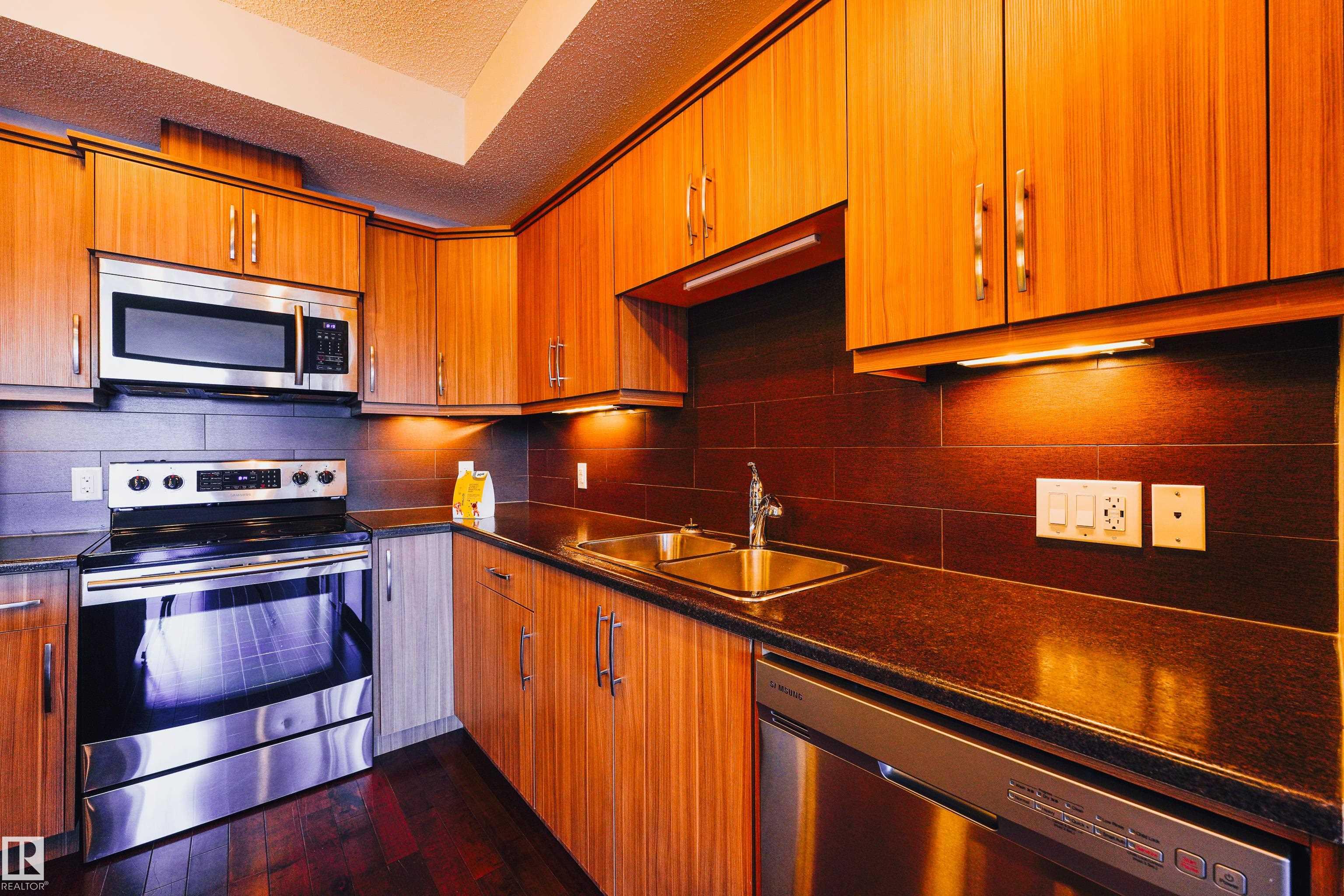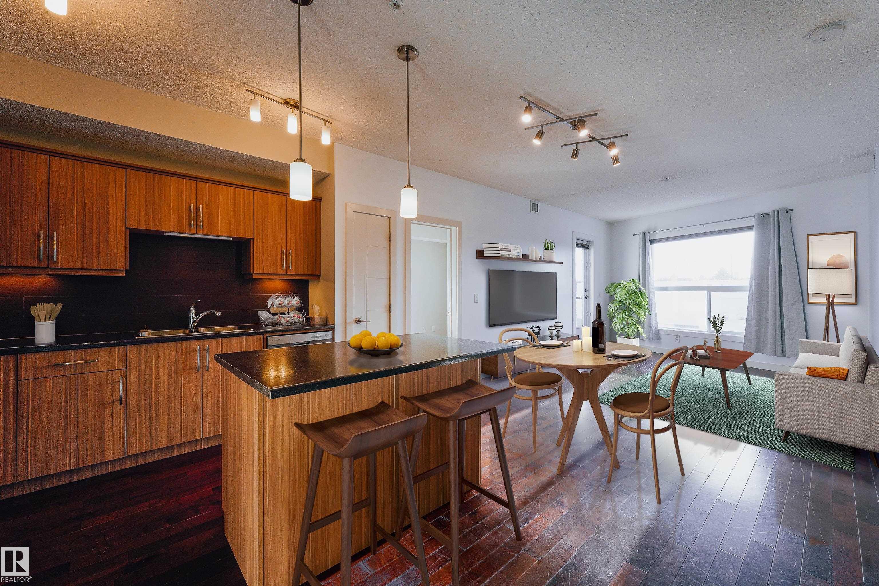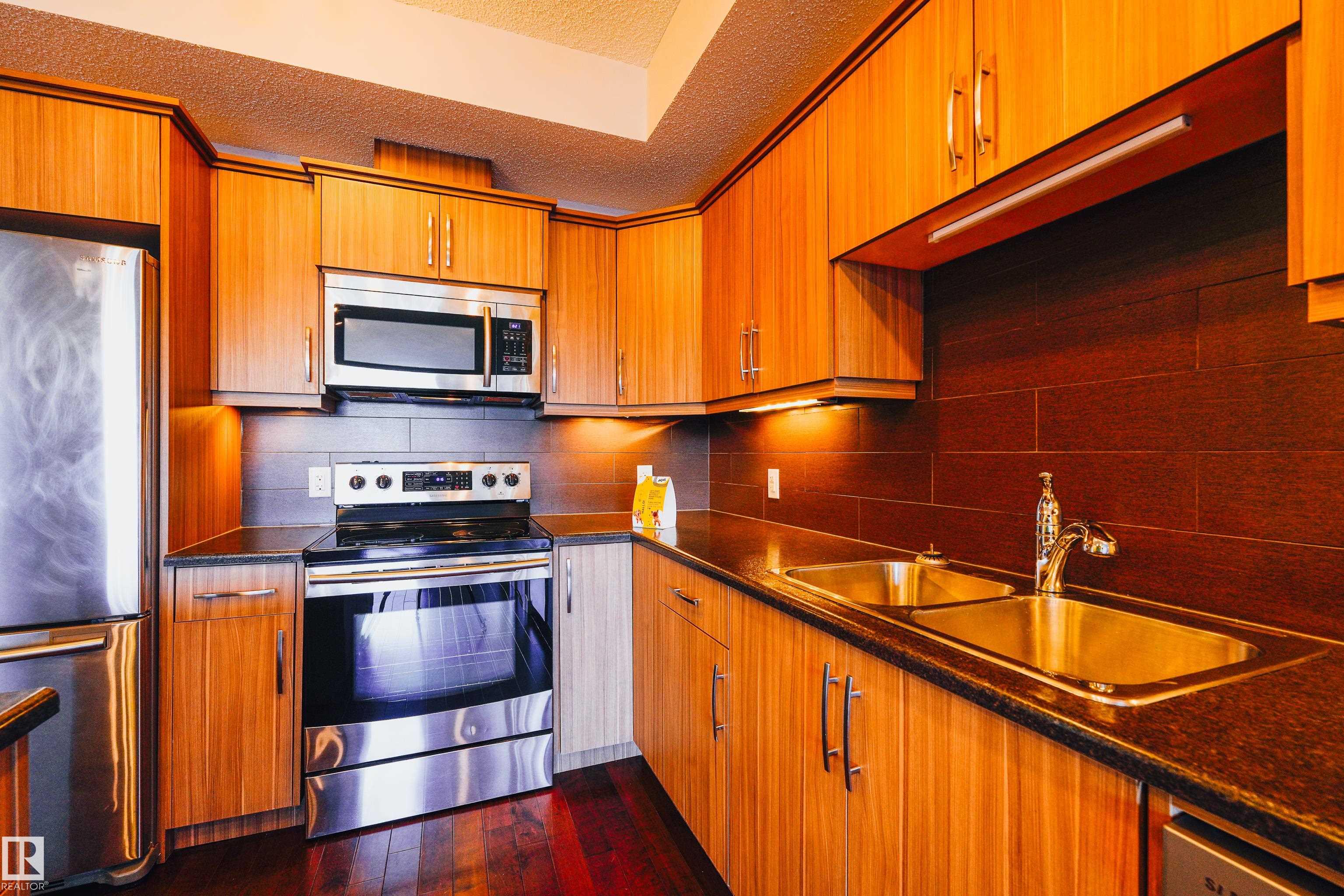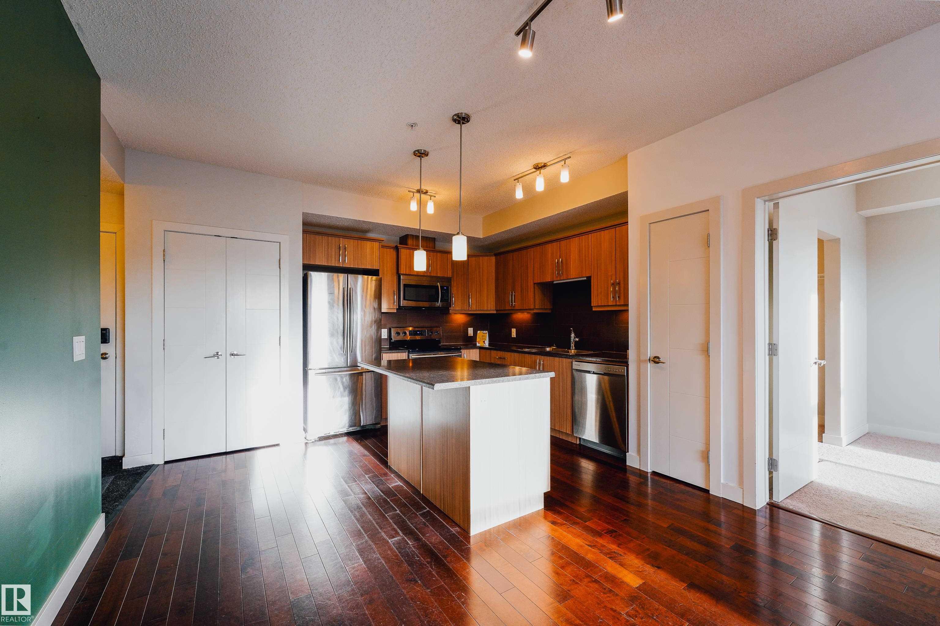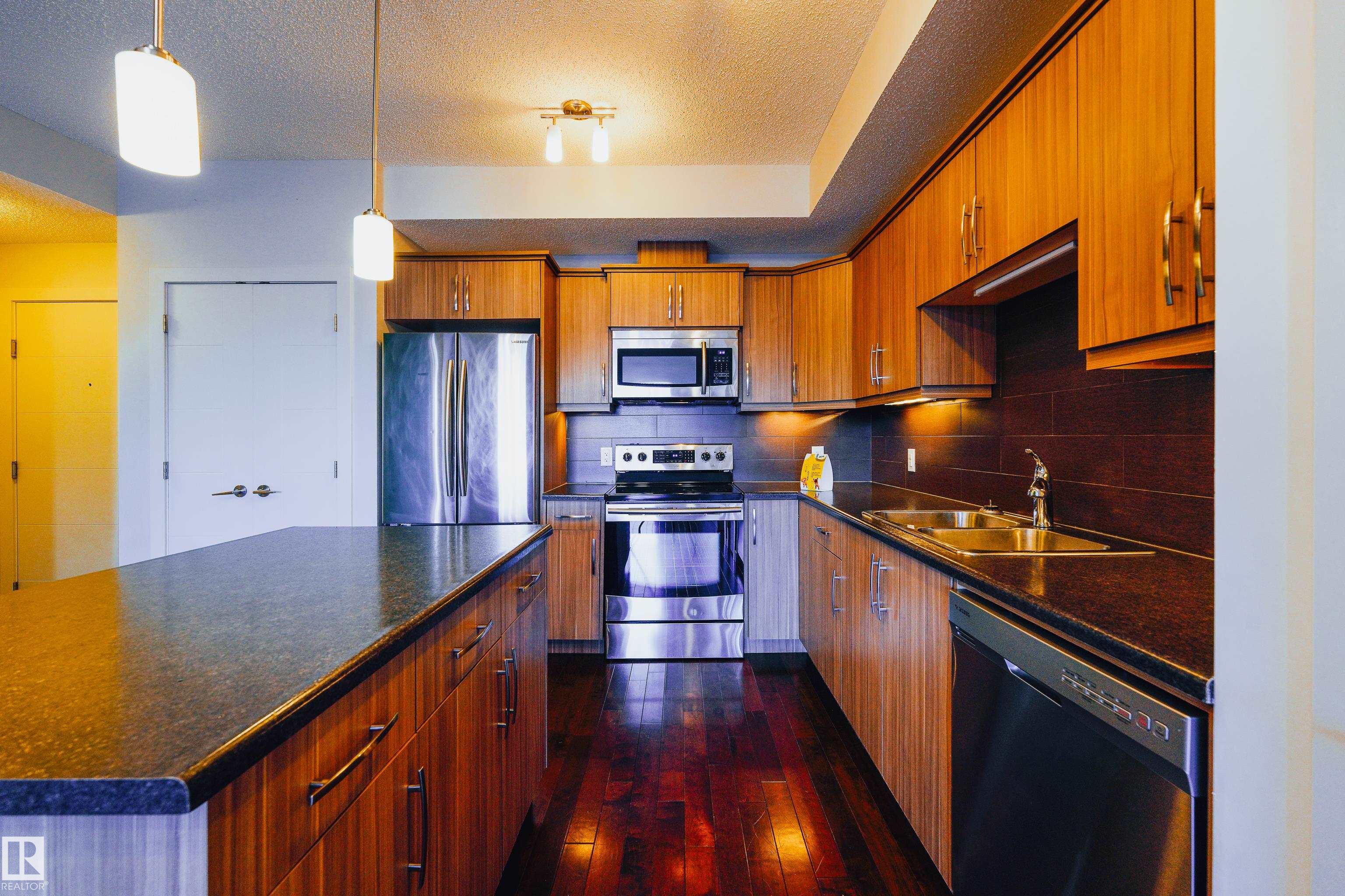 PET FRIENDLY, MODERN 2-BED, 2-BATH CONDO W/ A/C, IN-SUITE LAUNDRY & UNDERGROUND PARKING - STEPS TO 124 ST & BREWERY DISTRICT! Welcome to High Street District Properties--a stylish, centrally located home designed for the ultimate urban lifestyle. Just steps from Edmonton's best cafes, bakeries, breweries, restaurants, and cocktail bars, plus easy access to the river valley, bike paths & dog park! This bright & functional layout features 2 separated bedrooms (perfect for roommates!), an open-concept kitchen & living space with a massive island, and stunning west-facing windows for gorgeous sunset views. Enjoy summer nights on the spacious balcony w/ gas hookup! Upgrades include engineered hardwood, sleek stainless steel appliances, tile backsplash, a central heat pump w/ A/C, big windows, front-load laundry & tons of closet space. Plus, enjoy underground parking & a rooftop patio! Move-in ready--come see it today!
