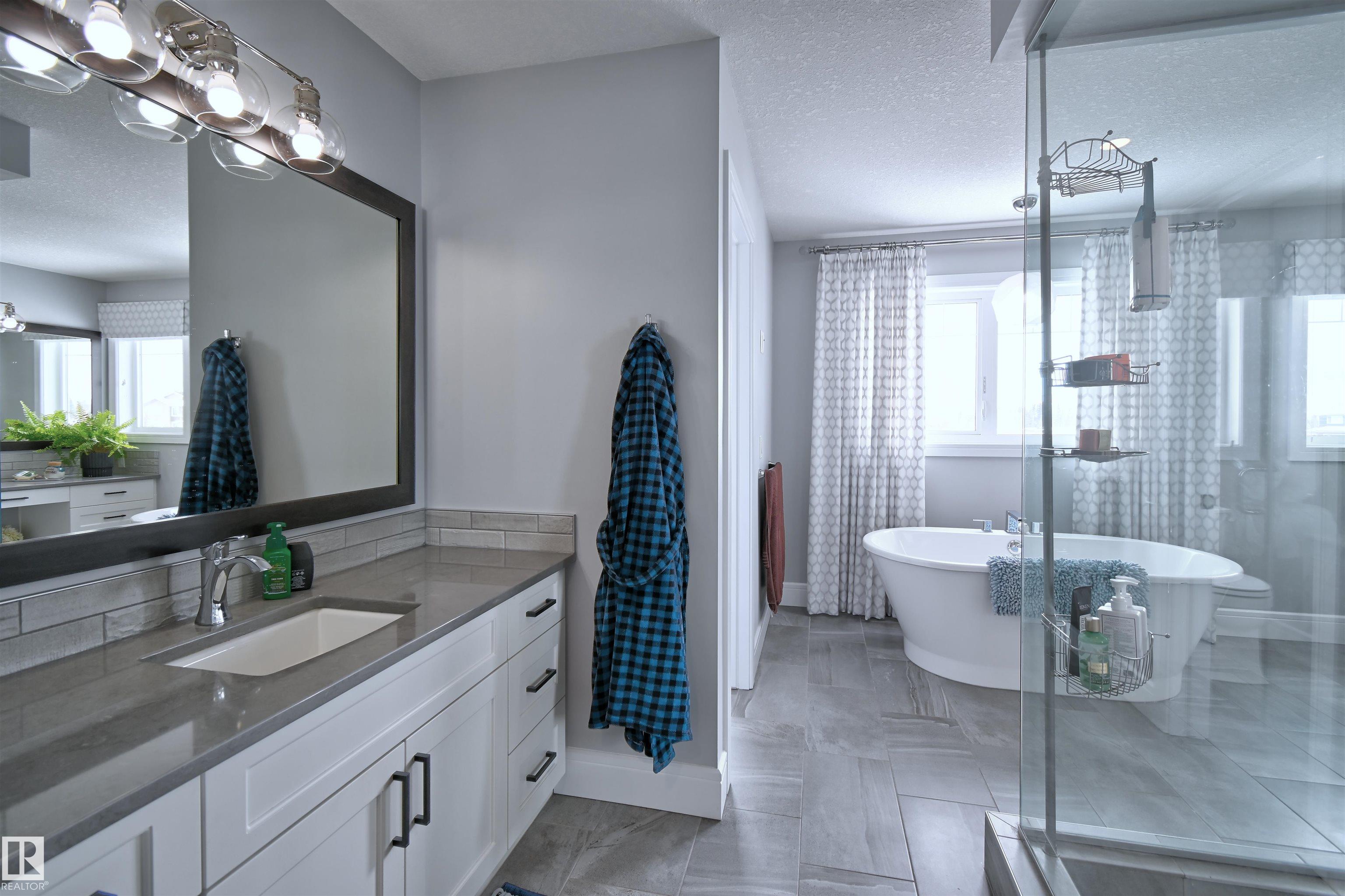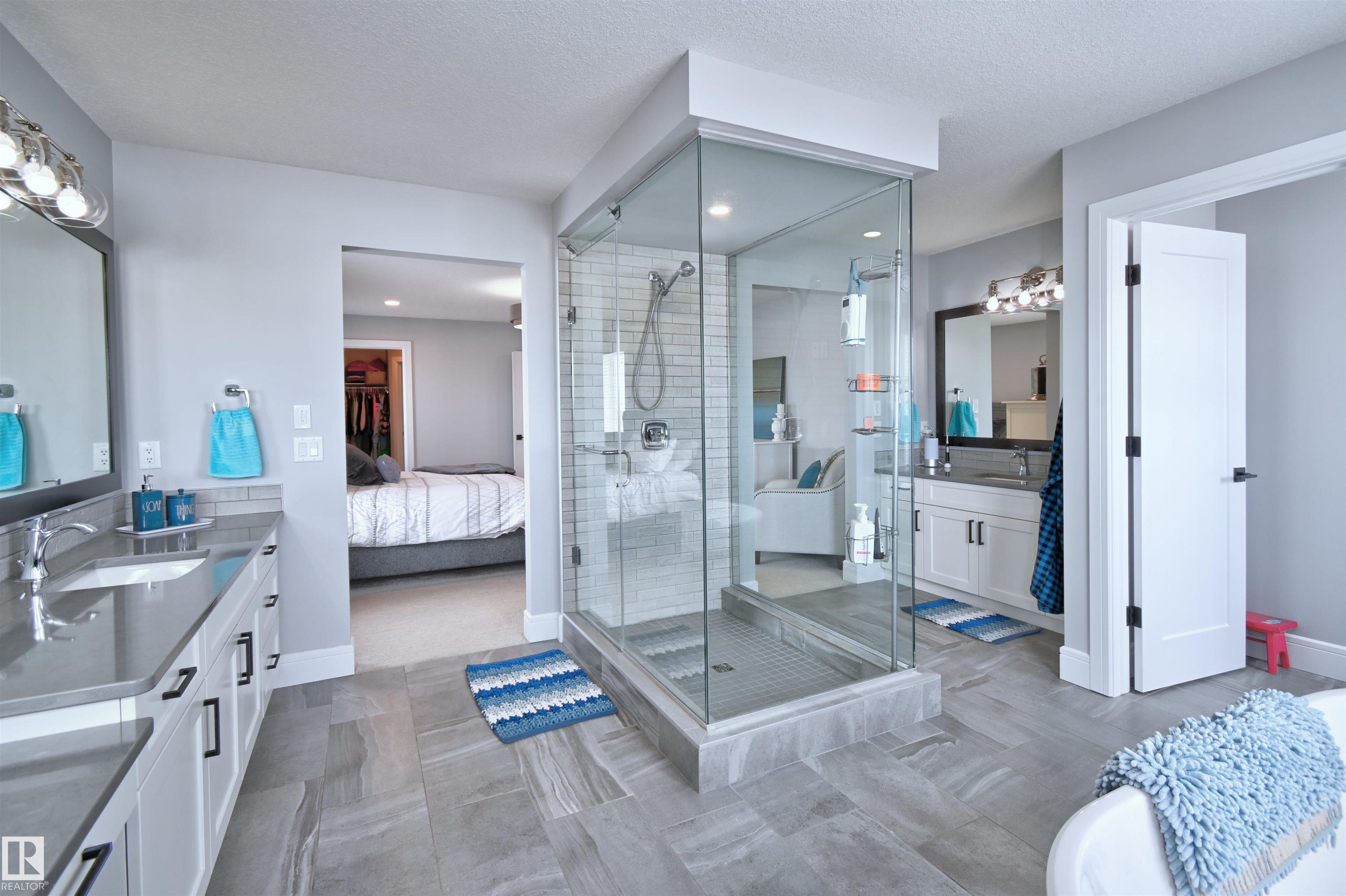 Welcome to Genesis Lake, an exceptional residence combining luxury, function and thoughtful upgrades. This home features a four-car heated garage with convenient pass-through to a private backyard, professionally landscaped beds with concrete curbing, and a composite deck with gazebo for summer entertaining. Inside, enjoy 9-foot ceilings, 8-foot doors, engineered hardwood, central A/C, and a front office overlooking the patio. The gourmet kitchen offers white cabinetry to the ceiling, a massive island, stainless hood, and chevron tile backsplash. Adjoining dining with coffered ceiling opens to a generous eating area. A walk-through pantry,with butler/coffee bar lead to a mudroom with custom shelving. A tiled dog wash with glass door and abundant storage add everyday convenience. Upstairs, a vaulted bonus room, spacious bedrooms with views, and a primary suite with laundry access and a luxurious 5-piece ensuite complete the home. The basement is fully finish & solar power and LED lighting